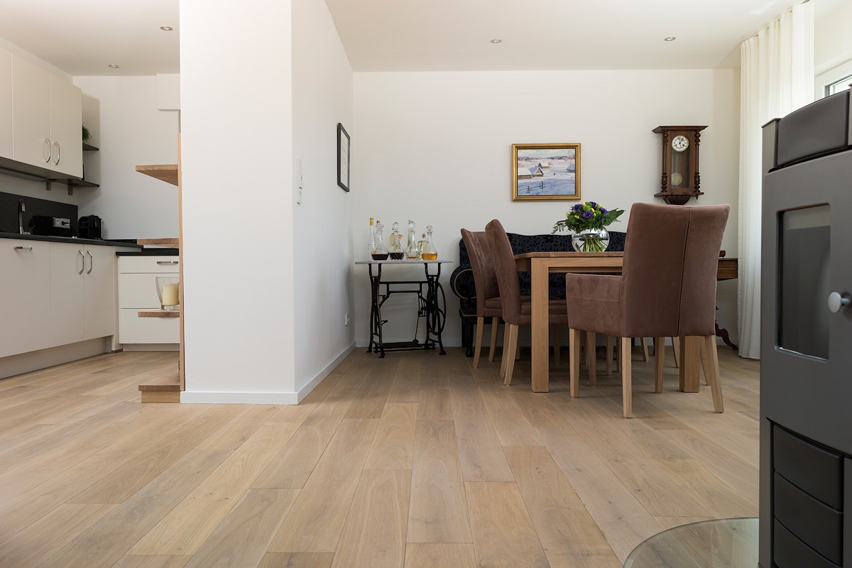 Die Eiche in der rustikalen Sortierung besticht durch ihre derbe Optik. Wir verzichten hier bewusst auf eine Spachtelung der Dielen um ihren Charme zu bewahren. Objekte mit dieser Diele bekommen eine besondere Note und