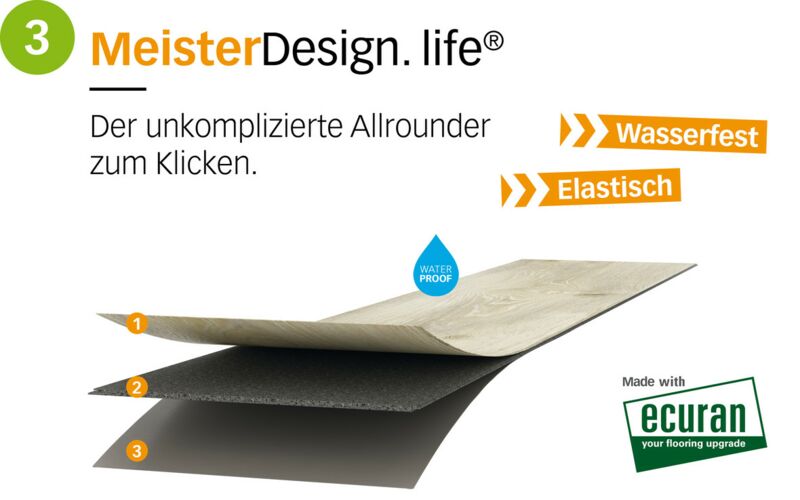 Schmutz und Wasser? Kein Problem für den wasserfesten Designboden MeisterDesign. life. Auch starke Sonneneinstrahlung macht ihm im Gegensatz zu Vinylböden rein gar nichts aus. Grundsätzlich eignet sich der gehschallleise Boden für Badezimmer und alle Wohnbereiche, wegen seiner Unempfindlichkeit aber besonders gut für Räume mit direktem Außenzugang und auch Wintergärten. Übrigens: MeisterDesign. life können Sie auf bis zu 15 x 15 m schwimmend verlegen – das macht ihn auch für offene Wohnbereiche ideal.