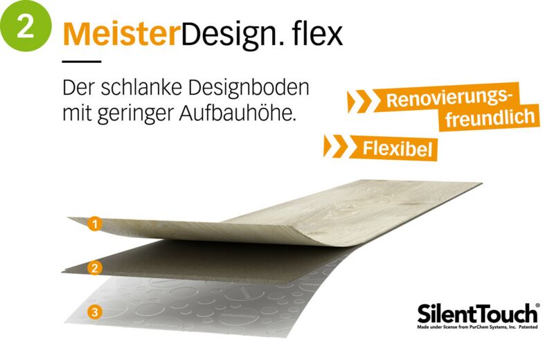 MeisterDesign. pro ist mit nur 2 mm Stärke die erste Wahl, wenn die Aufbauhöhe nur sehr gering sein darf. Nach einer professionellen Unterbodenvorbereitung ist er dann der perfekte (und wasserfeste) Kandidat fürs Bad, für den Flur und Objektbereiche wie Ladenlokale oder Restaurants.