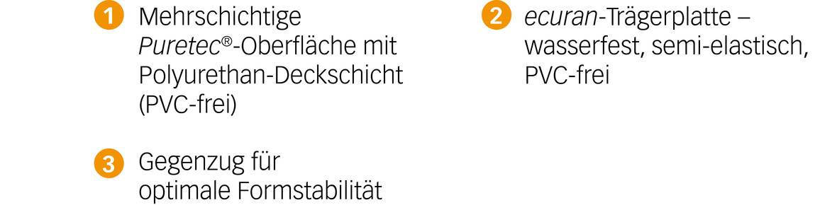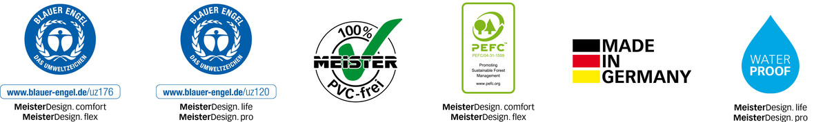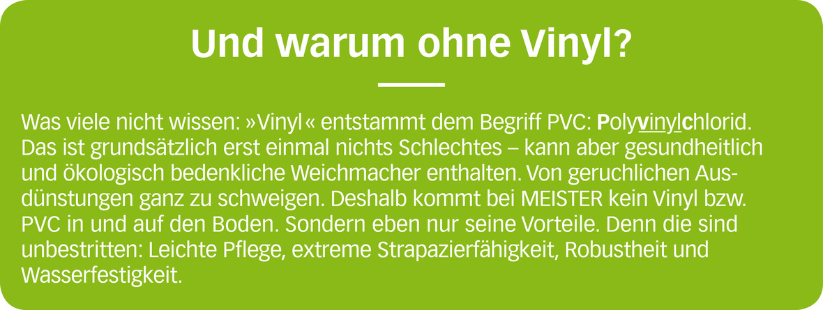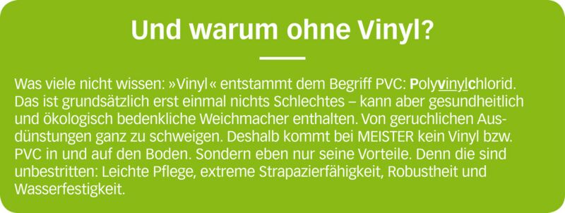 Der Designboden MeisterDesign ist die wohngesunde Antwort auf herkömmliche Vinylböden – ausgezeichnet mit dem Blauen Engel und zu 100 % Made in Germany. MeisterDesign verfügt über alle Vorteile eines Vinylbodens (Strapazierfähigkeit, Pflegeleichtigkeit und Elastizität) kommt aber ohne die vor allem ökologischen und technischen Nachteile aus. So ist MeisterDesign – im Gegensatz zu vielen Vinylböden – geruchsneutral, weichmacherfrei und wärmebeständig.