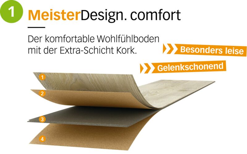 Der Designboden MeisterDesign. comfort erreicht mit seiner doppelten Korkschicht beste kombinierte Geh- und Trittschallwerte und benötigt keine zusätzliche Dämmunterlage. Weil er so leise, gelenkschonend, fußwarm und komfortabel ist, eignet er sich perfekt für alle Wohn- und Schlafräume, insbesondere aber für Kinderzimmer.