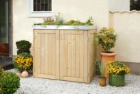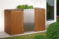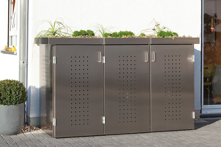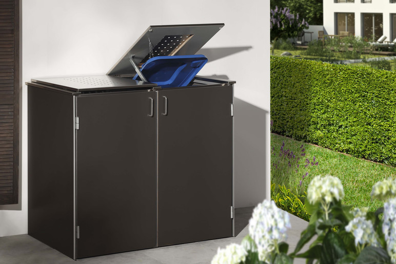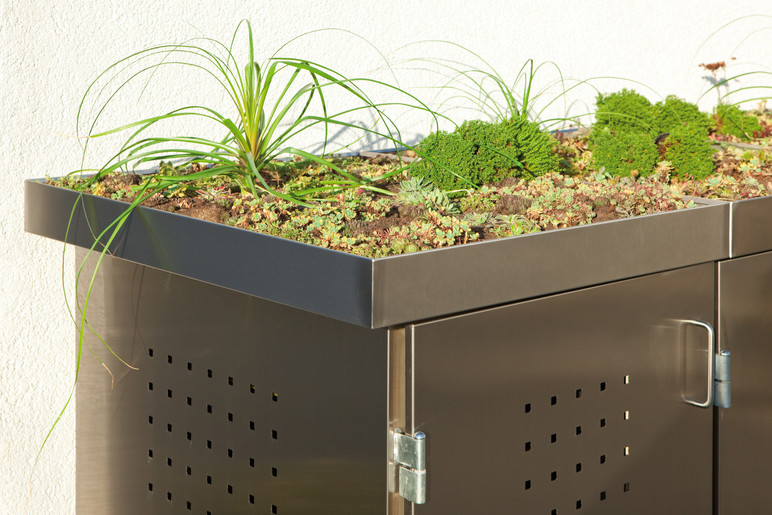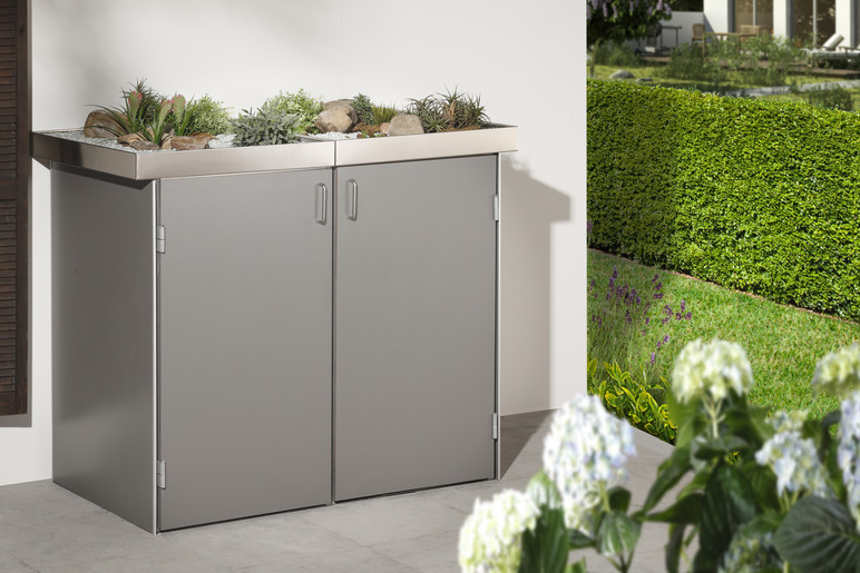 BINTO SYSTEM - schöner und variabler lassen sich Mülltonnen nicht verstecken: Wählen Sie aus verschiedenen Materialien und Farben oder stellen Sie sich Ihren individuellen Materialmix zusammen. Das Grundgerüst aus verzinktem Stahl ist bei allen Design-Varianten gleich. Sie können jederzeit erweitern oder die alte Verkleidung durch eine neue ersetzen. Dazu wählen Sie entweder Klappdeckel oder die Edelstahl-Pflanzschale.
