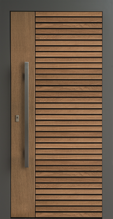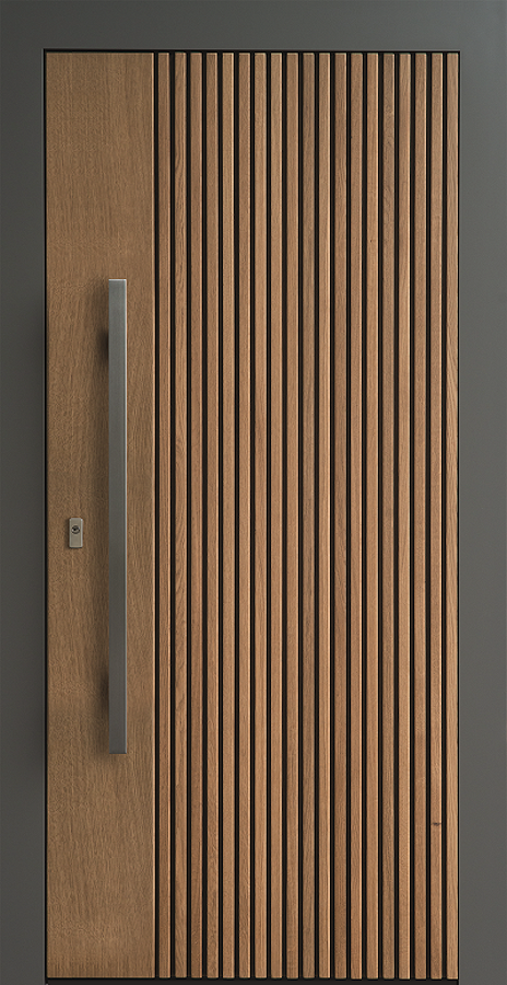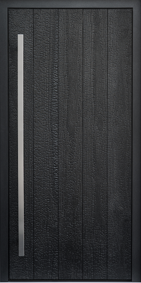 Wir bieten zwei Oberflächen in Shou Sugi Ban Ausführung für die Vorhangschale unserer FENNEN Edition an. Beide basieren auf der Holzart Accoya® . Die Bretter werden für jede bestellte Haustür sorfältig im Werk zusammen gestellt und zu unserem Partner ins holländische Leersum gebracht. Die erfahrenen Brennmeister vor Ort lassen dann nach jahrhundertealter japanischer Tradition die wunderschönen schwarzen Oberflächen entstehen. Der Prozess entwickelt zudem natürliche Resistenzen gegen Schimmel, Feuchtigkeit und Verwitterung. Oberfläche NAKATADO: Die Bretter werden eingebrannt und gebürstet, der natürliche Verlauf der Holzstrukturen wird dadurch dreidimensional mit Höhenunterschieden bis zu 2 mm im Verlauf. Die Behandlung der Oberfläche erfolgt mit Bito Black Holzöl. So wird der Effekt zusätzlich verstärkt. Die finale Oberfläche ist extrem wetterfest und färbt nicht ab. Die Nachbehandlung mit Bito Black ist problemlos möglich. Ebenso die Reinigung mit einem weichen Tuch und Wasser. Oberfläche MARUGAME: Bei dieser Variante entsteht durch den Brennvorgang ein charakteristisches eher gleichmäßiges Muster der Kohleschicht mit leichtem Glanz. Diese Schicht ist sehr hart und hat sich im Außeneinsatz bereits als langjährige Fassadenverkleidung bewährt. Sie wird zusätzlich nach dem Brennvorgang mit einem Epoxyd-Harz veredelt. Die Oberfläche wird dadurch noch härter, unempfindlicher gegen Stöße, das Abfärben der Kohle wird verhindert. Marugame kann nicht nachbehandelt werden. Die Reinigung erfolgt einfach mit Wasser und weicher Bürste. Auf beide Oberflächen erhalten Sie unsere reguläre Gewährleistung. Die sehr spezielle Konstruktion dieser Tür ermöglicht es, die komplette Vorhangschale mit wenigen Handgriffen auszuwechseln. Das trifft auf alle Modelle der Edition FENNEN ohne Glasausschnitt zu. Darüber hinaus ist es sogar möglich, einzelne Bohlen auszutauschen, sollten diese beispielsweise mechanisch beschädigt werden. Dieses hohe Maß an Flexibilität ist ein besonderer Vorzug, den Sie