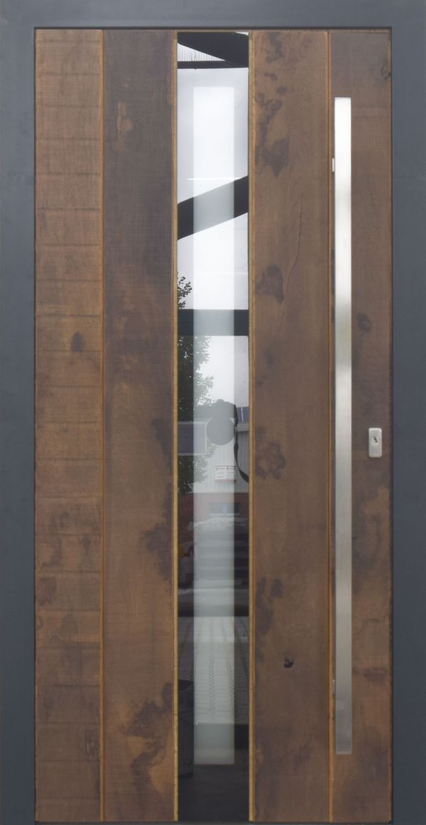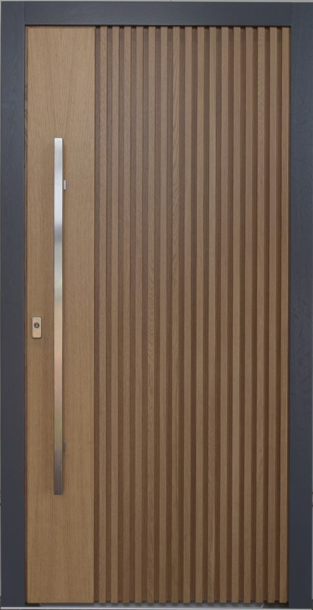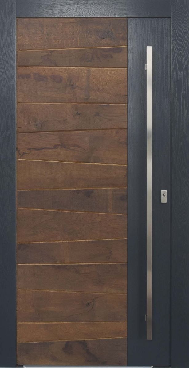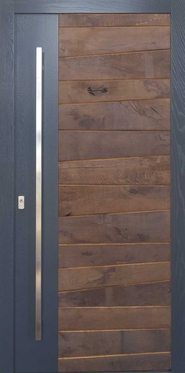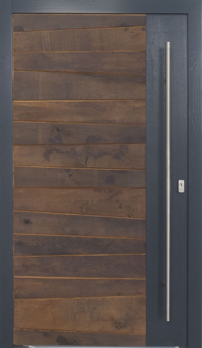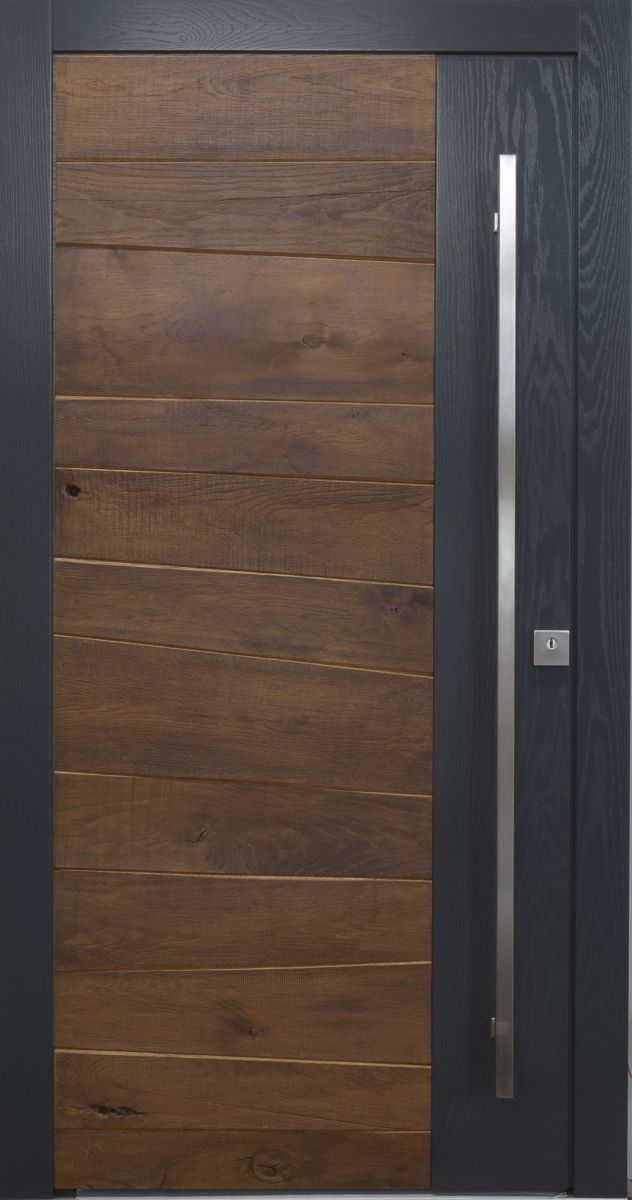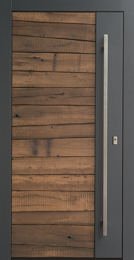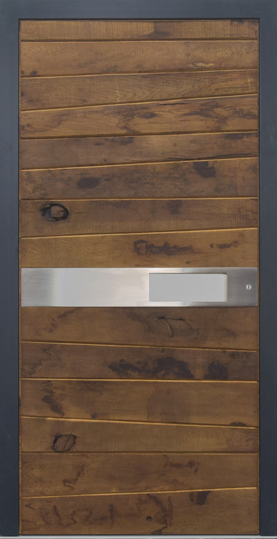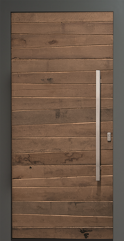 Besonderes Merkmal ist der rustikale, authentische Charakter dieser Modelle. Das Türblatt ist außen mit massiven handbearbeiteten Eichenbohlen bestückt. Die Bohlen sind handverlesen und werden auf Eignung geprüft und getrimmt. Gebrauchsspuren, Auskerbungen, Abrieb, Astlöcher sind ausdrücklich erwünscht. Die Oberfläche der Eichenbohlen ist ausschließlich in dem speziell für diese Modelle abgemischten Farbton ‚Altholz‘ erhältlich. Die Grundierung bereitet diese extrem profilreichen Holzoberflächen auf die Endbehandlung mit hochwertigem wasserbasiertem Holzöl vor. Das Ergebnis ist wunderbar matt und natürlich anmutig. Diese Oberfläche kann ganz einfach gepflegt bzw. nachbehandelt werden. Wir empfehlen das Pullex Holzöl von ADLER. Je nach Intensität der Bewitterung empfiehlt sich die Behandlung 1 - 2 mal jährlich. So kann einer Vergrauung des Holzes entgegen gewirkt werden. Pflegehinweise zur Werterhaltung begleiten die Tür bei Auslieferung. Dennoch wird sich die Oberfläche der Eichenbohlen, je nach Einbaulage, im Laufe der Zeit verändern, das ist ein natürlicher Prozess und ausdrücklich so gewollt. Aus diesem Grund ist die Oberfläche von der Gewährleistung ausgeschlossen. Die Einbausituation erfordert bauseits einen konstruktiven Schutz, der eine direkte Sonneneinstrahlung und Bewitterung durch Niederschläge verhindert. Die sehr spezielle Konstruktion dieser Tür ermöglicht es, die komplette Vorhangschale mit wenigen Handgriffen auszuwechseln. Das trifft auf alle Modelle der gesamten Edition FENNEN ohne Glasausschnitt zu. Darüber hinaus ist es sogar möglich, einzelne Bohlen auszutauschen, sollten diese beispielsweise mechanisch beschädigt werden. Dieses hohe Maß an Flexibilität ist ein besonderer Vorzug, den Sie nicht außer Acht lassen sollten.