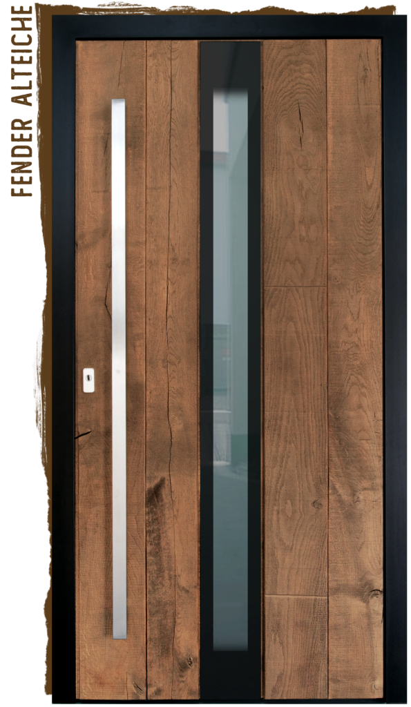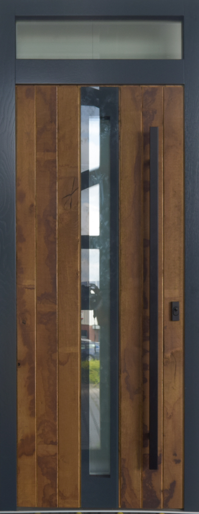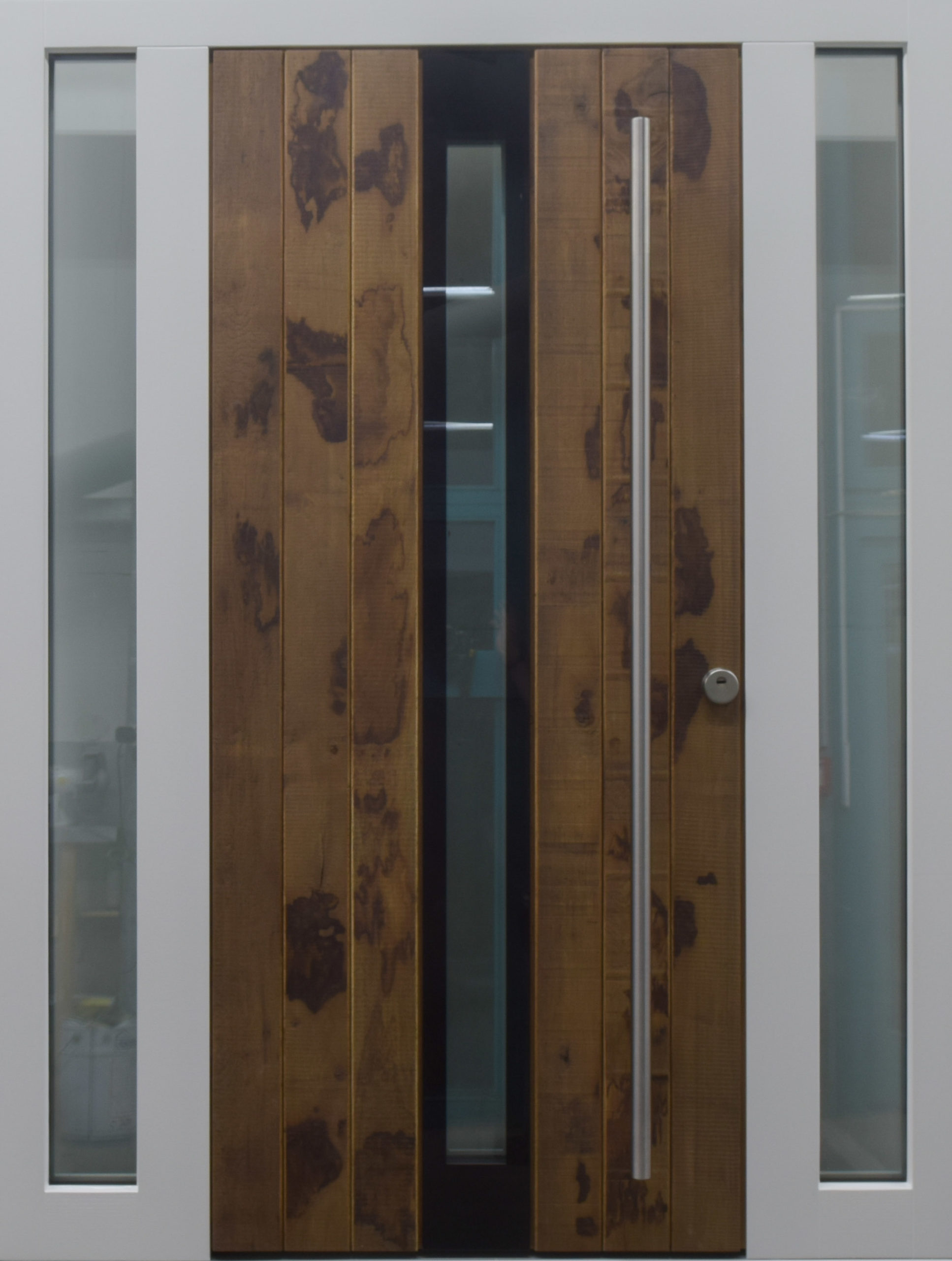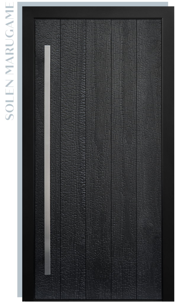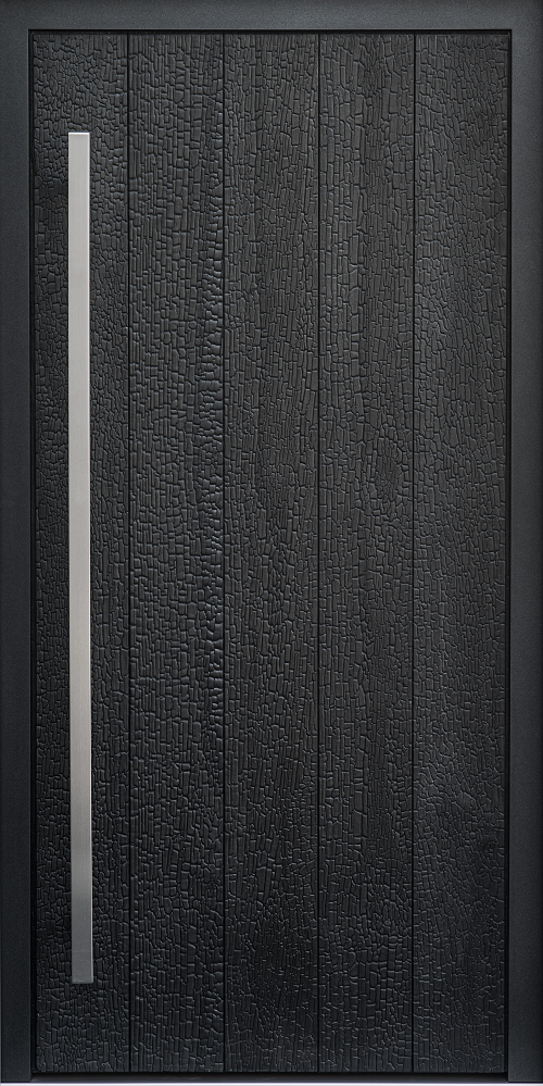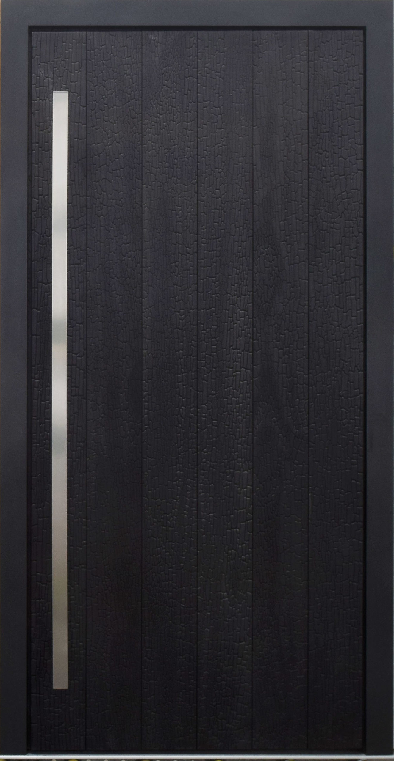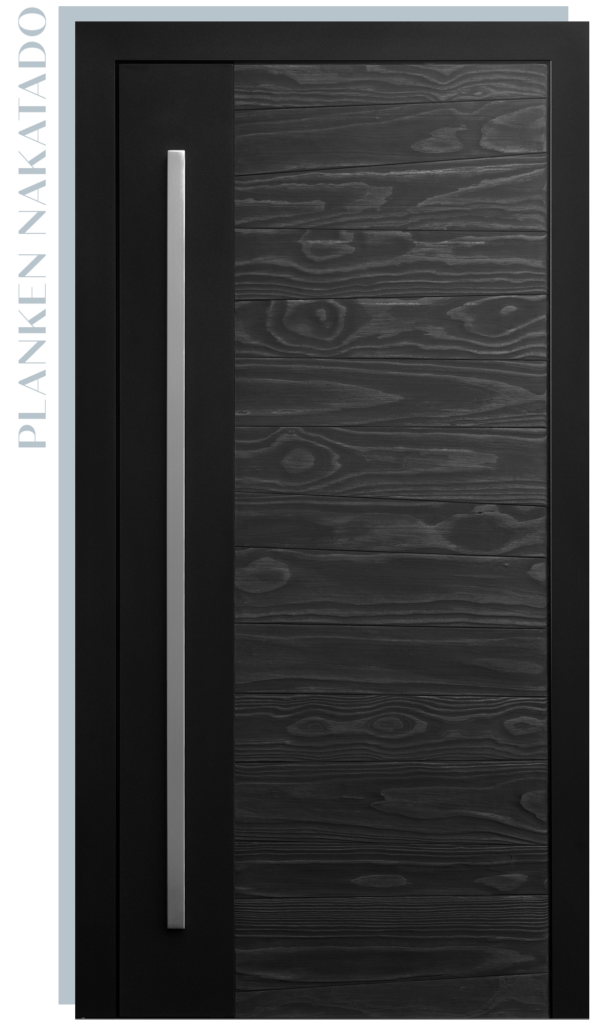 Wir bieten zwei Oberflächen in Shou Sugi Ban Ausführung für die Vorhangschale unserer FENNEN Edition an. Beide basieren auf der Holzart Accoya® . Die Bretter werden für jede bestellte Haustür sorfältig im Werk zusammen gestellt und zu unserem Partner ins holländische Leersum gebracht. Die erfahrenen Brennmeister vor Ort lassen dann nach jahrhundertealter japanischer Tradition die wunderschönen schwarzen Oberflächen entstehen. Der Prozess entwickelt zudem natürliche Resistenzen gegen Schimmel, Feuchtigkeit und Verwitterung. Oberfläche NAKATADO: Die Bretter werden eingebrannt und gebürstet, der natürliche Verlauf der Holzstrukturen wird dadurch dreidimensional mit Höhenunterschieden bis zu 2 mm im Verlauf. Die Behandlung der Oberfläche erfolgt mit Bito Black Holzöl. So wird der Effekt zusätzlich verstärkt. Die finale Oberfläche ist extrem wetterfest und färbt nicht ab. Die Nachbehandlung mit Bito Black ist problemlos möglich. Ebenso die Reinigung mit einem weichen Tuch und Wasser. Oberfläche MARUGAME: Bei dieser Variante entsteht durch den Brennvorgang ein charakteristisches eher gleichmäßiges Muster der Kohleschicht mit leichtem Glanz. Diese Schicht ist sehr hart und hat sich im Außeneinsatz bereits als langjährige Fassadenverkleidung bewährt. Sie wird zusätzlich nach dem Brennvorgang mit einem Epoxyd-Harz veredelt. Die Oberfläche wird dadurch noch härter, unempfindlicher gegen Stöße, das Abfärben der Kohle wird verhindert. Marugame kann nicht nachbehandelt werden. Die Reinigung erfolgt einfach mit Wasser und weicher Bürste. Auf beide Oberflächen erhalten Sie unsere reguläre Gewährleistung. Die sehr spezielle Konstruktion dieser Tür ermöglicht es, die komplette Vorhangschale mit wenigen Handgriffen auszuwechseln. Das trifft auf alle Modelle der Edition FENNEN ohne Glasausschnitt zu. Darüber hinaus ist es sogar möglich, einzelne Bohlen auszutauschen, sollten diese beispielsweise mechanisch beschädigt werden. Dieses hohe Maß an Flexibilität ist ein besonderer Vorzug, den Sie