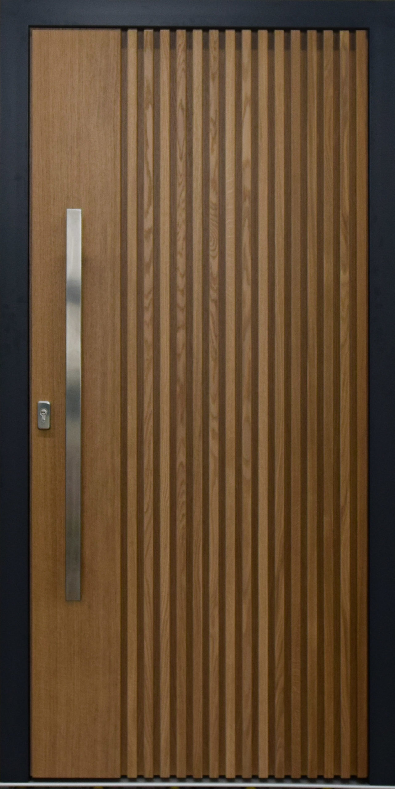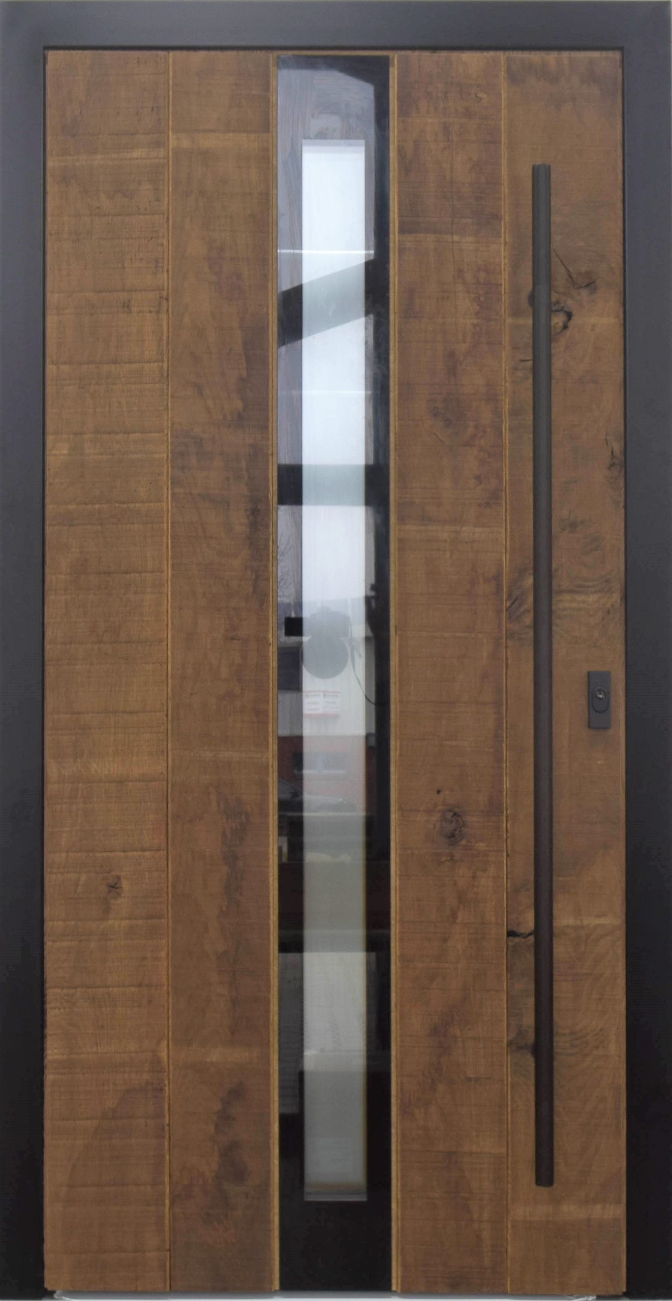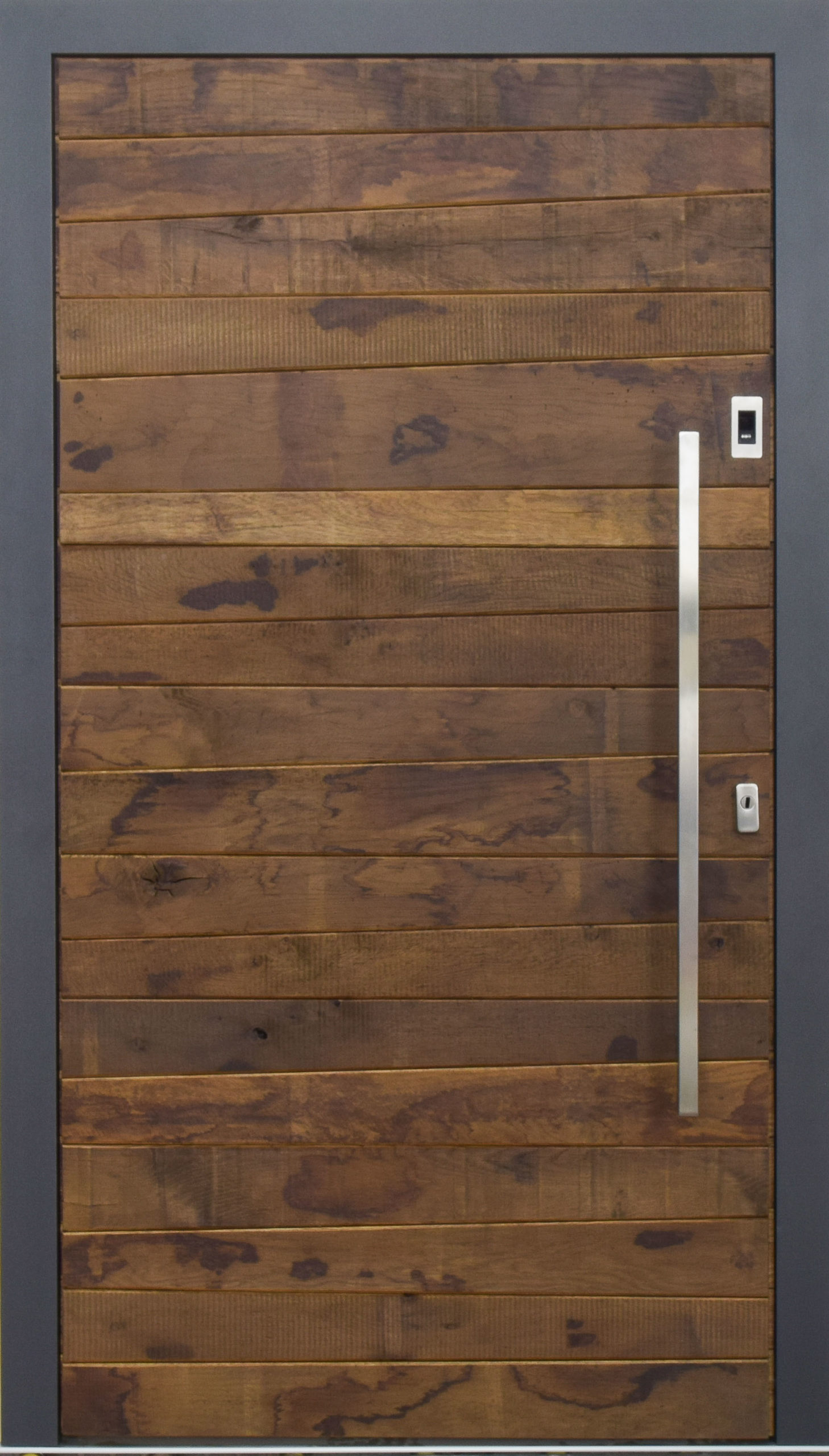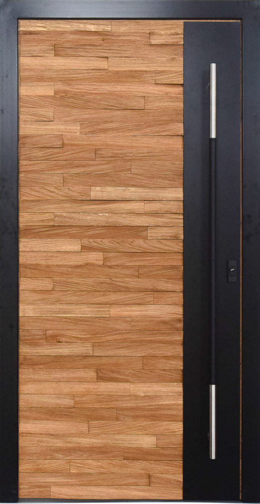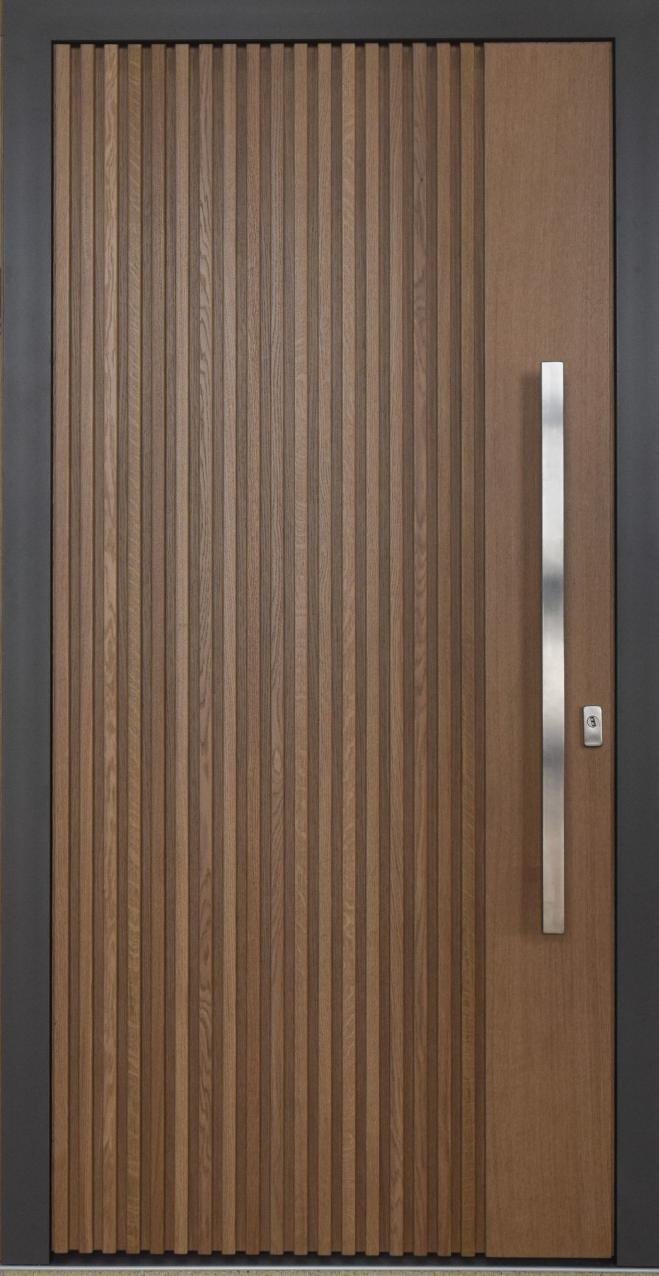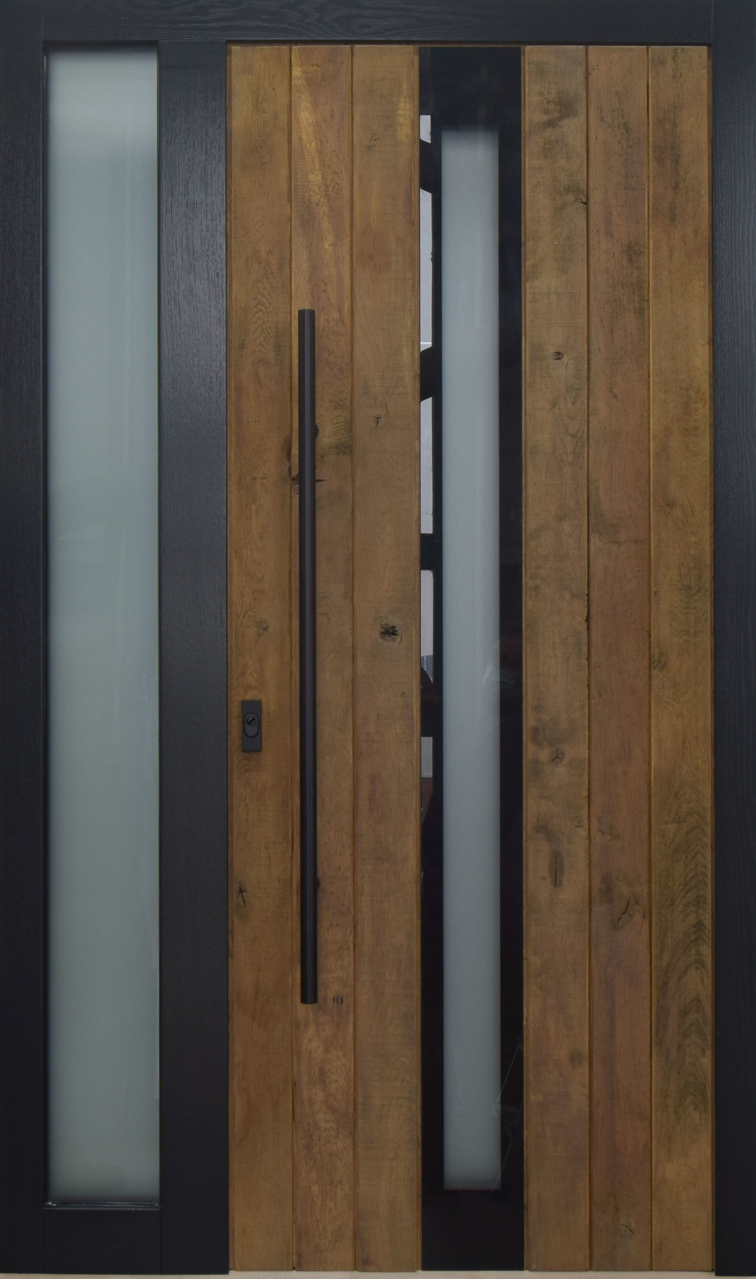 Wir bieten zwei Oberflächen in Shou Sugi Ban Ausführung für die Vorhangschale unserer FENNEN Edition an. Beide basieren auf der Holzart Accoya® . Die Bretter werden für jede bestellte Haustür sorfältig im Werk zusammen gestellt und zu unserem Partner ins holländische Leersum gebracht. Die erfahrenen Brennmeister vor Ort lassen dann nach jahrhundertealter japanischer Tradition die wunderschönen schwarzen Oberflächen entstehen. Der Prozess entwickelt zudem natürliche Resistenzen gegen Schimmel, Feuchtigkeit und Verwitterung. Oberfläche NAKATADO: Die Bretter werden eingebrannt und gebürstet, der natürliche Verlauf der Holzstrukturen wird dadurch dreidimensional mit Höhenunterschieden bis zu 2 mm im Verlauf. Die Behandlung der Oberfläche erfolgt mit Bito Black Holzöl. So wird der Effekt zusätzlich verstärkt. Die finale Oberfläche ist extrem wetterfest und färbt nicht ab. Die Nachbehandlung mit Bito Black ist problemlos möglich. Ebenso die Reinigung mit einem weichen Tuch und Wasser. Oberfläche MARUGAME: Bei dieser Variante entsteht durch den Brennvorgang ein charakteristisches eher gleichmäßiges Muster der Kohleschicht mit leichtem Glanz. Diese Schicht ist sehr hart und hat sich im Außeneinsatz bereits als langjährige Fassadenverkleidung bewährt. Sie wird zusätzlich nach dem Brennvorgang mit einem Epoxyd-Harz veredelt. Die Oberfläche wird dadurch noch härter, unempfindlicher gegen Stöße, das Abfärben der Kohle wird verhindert. Marugame kann nicht nachbehandelt werden. Die Reinigung erfolgt einfach mit Wasser und weicher Bürste. Auf beide Oberflächen erhalten Sie unsere reguläre Gewährleistung. Die sehr spezielle Konstruktion dieser Tür ermöglicht es, die komplette Vorhangschale mit wenigen Handgriffen auszuwechseln. Das trifft auf alle Modelle der Edition FENNEN ohne Glasausschnitt zu. Darüber hinaus ist es sogar möglich, einzelne Bohlen auszutauschen, sollten diese beispielsweise mechanisch beschädigt werden. Dieses hohe Maß an Flexibilität ist ein besonderer Vorzug, den Sie