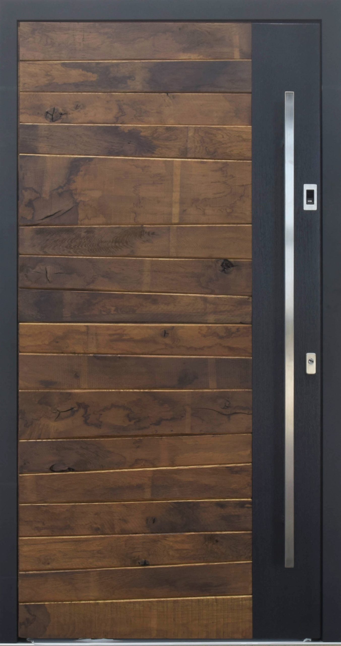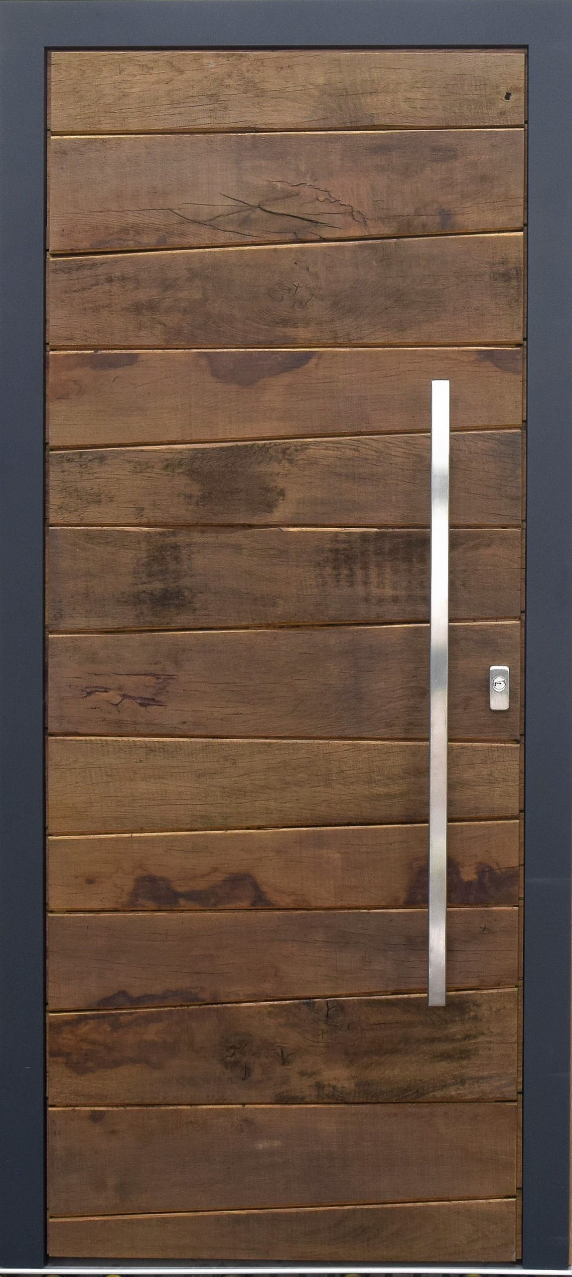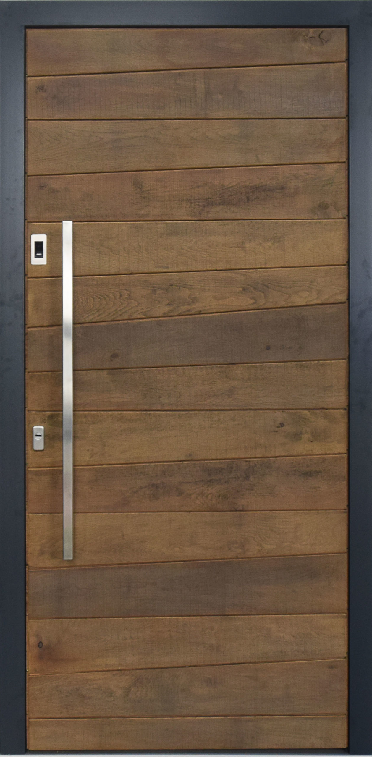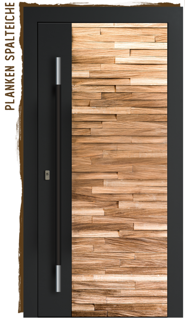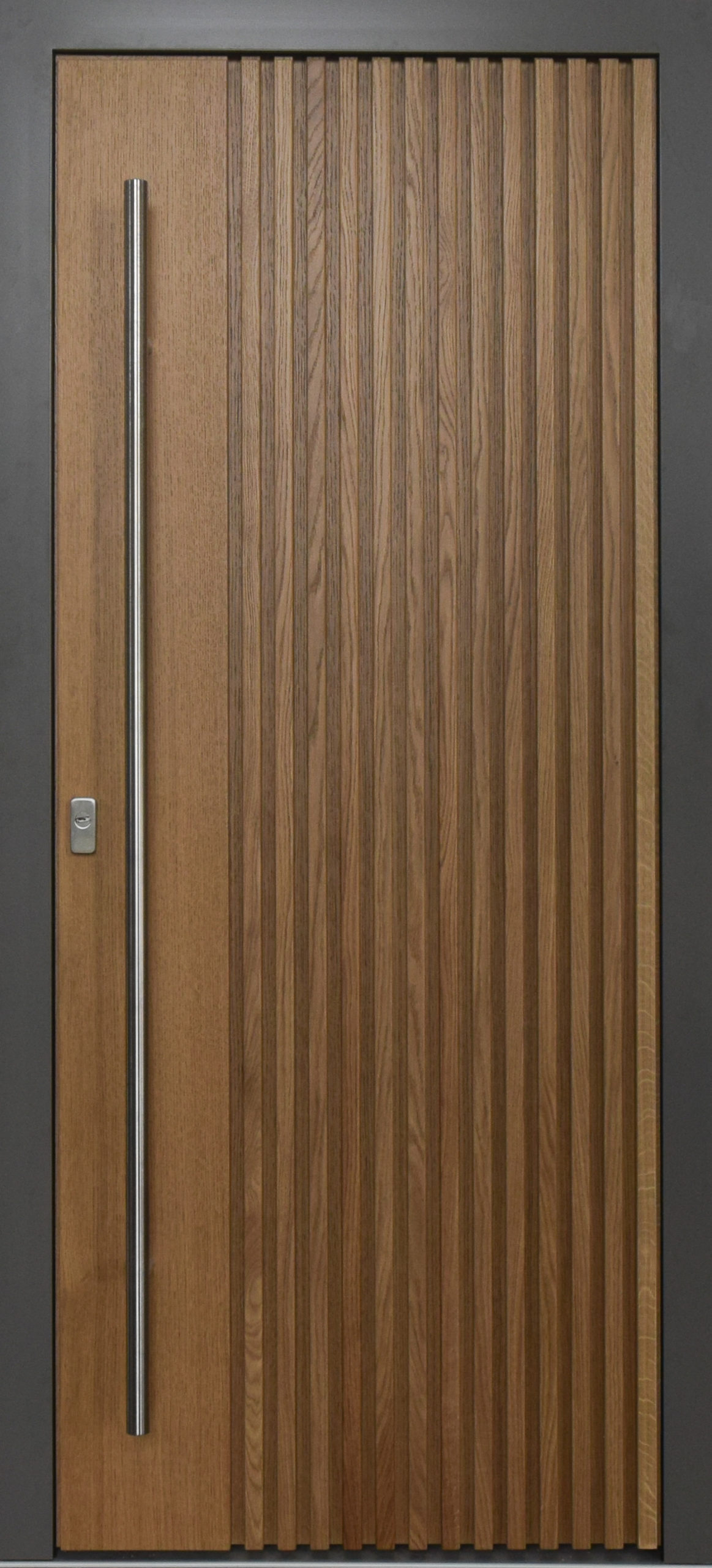 Wir bieten zwei Oberflächen in Shou Sugi Ban Ausführung für die Vorhangschale unserer FENNEN Edition an. Beide basieren auf der Holzart Accoya® . Die Bretter werden für jede bestellte Haustür sorfältig im Werk zusammen gestellt und zu unserem Partner ins holländische Leersum gebracht. Die erfahrenen Brennmeister vor Ort lassen dann nach jahrhundertealter japanischer Tradition die wunderschönen schwarzen Oberflächen entstehen. Der Prozess entwickelt zudem natürliche Resistenzen gegen Schimmel, Feuchtigkeit und Verwitterung. Oberfläche NAKATADO: Die Bretter werden eingebrannt und gebürstet, der natürliche Verlauf der Holzstrukturen wird dadurch dreidimensional mit Höhenunterschieden bis zu 2 mm im Verlauf. Die Behandlung der Oberfläche erfolgt mit Bito Black Holzöl. So wird der Effekt zusätzlich verstärkt. Die finale Oberfläche ist extrem wetterfest und färbt nicht ab. Die Nachbehandlung mit Bito Black ist problemlos möglich. Ebenso die Reinigung mit einem weichen Tuch und Wasser. Oberfläche MARUGAME: Bei dieser Variante entsteht durch den Brennvorgang ein charakteristisches eher gleichmäßiges Muster der Kohleschicht mit leichtem Glanz. Diese Schicht ist sehr hart und hat sich im Außeneinsatz bereits als langjährige Fassadenverkleidung bewährt. Sie wird zusätzlich nach dem Brennvorgang mit einem Epoxyd-Harz veredelt. Die Oberfläche wird dadurch noch härter, unempfindlicher gegen Stöße, das Abfärben der Kohle wird verhindert. Marugame kann nicht nachbehandelt werden. Die Reinigung erfolgt einfach mit Wasser und weicher Bürste. Auf beide Oberflächen erhalten Sie unsere reguläre Gewährleistung. Die sehr spezielle Konstruktion dieser Tür ermöglicht es, die komplette Vorhangschale mit wenigen Handgriffen auszuwechseln. Das trifft auf alle Modelle der Edition FENNEN ohne Glasausschnitt zu. Darüber hinaus ist es sogar möglich, einzelne Bohlen auszutauschen, sollten diese beispielsweise mechanisch beschädigt werden. Dieses hohe Maß an Flexibilität ist ein besonderer Vorzug, den Sie