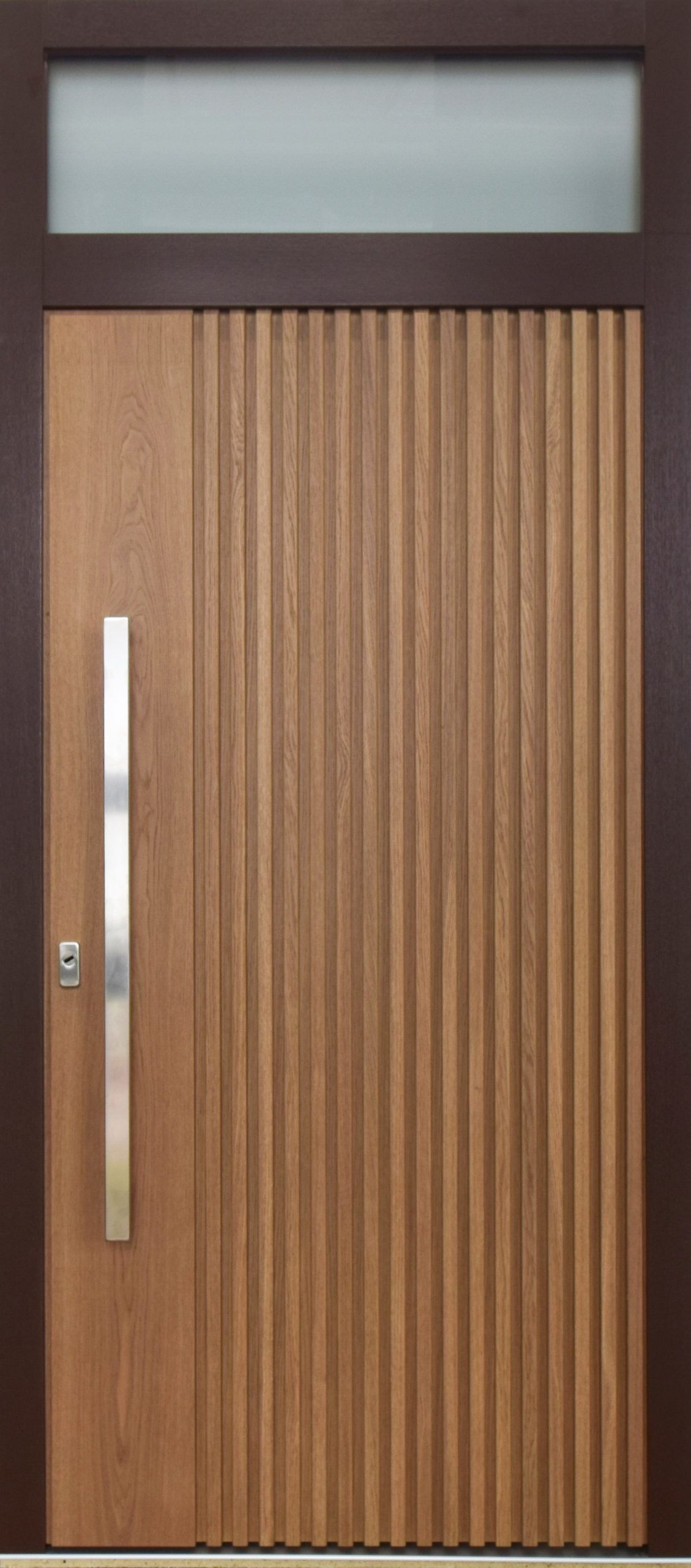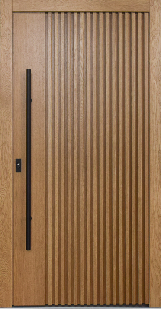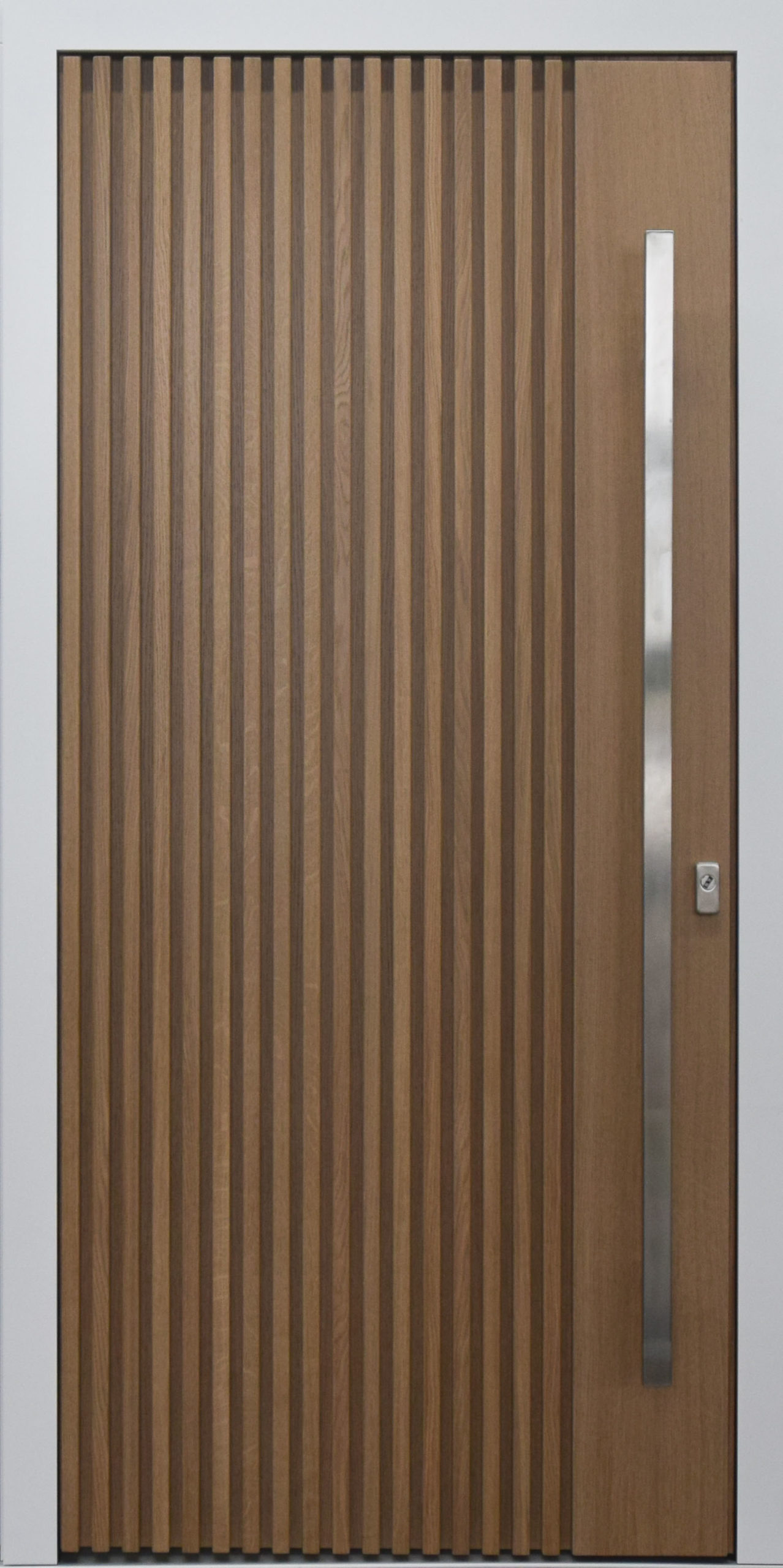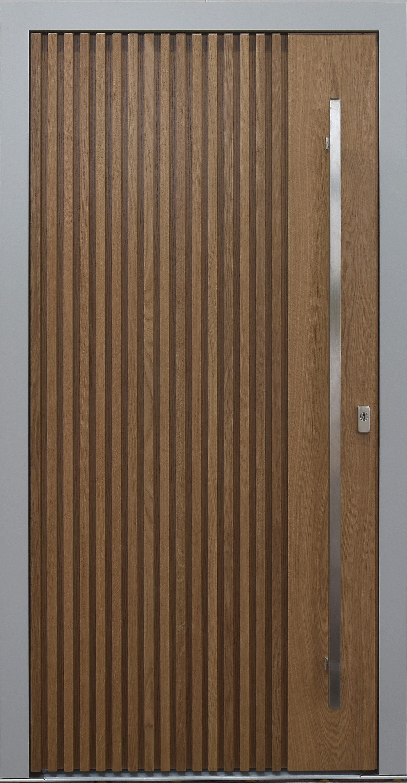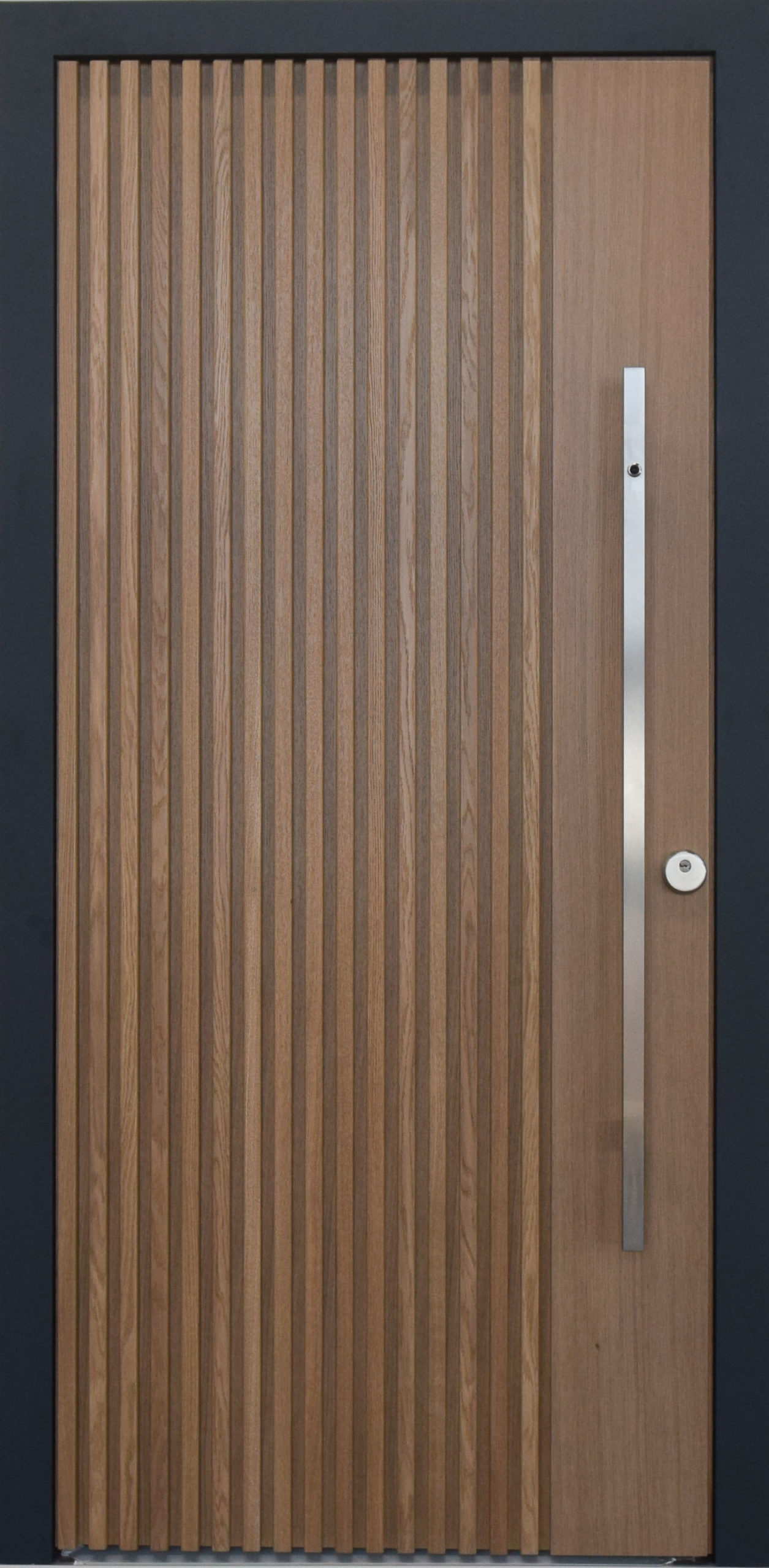 Wir bieten zwei Oberflächen in Shou Sugi Ban Ausführung für die Vorhangschale unserer FENNEN Edition an. Beide basieren auf der Holzart Accoya® . Die Bretter werden für jede bestellte Haustür sorfältig im Werk zusammen gestellt und zu unserem Partner ins holländische Leersum gebracht. Die erfahrenen Brennmeister vor Ort lassen dann nach jahrhundertealter japanischer Tradition die wunderschönen schwarzen Oberflächen entstehen. Der Prozess entwickelt zudem natürliche Resistenzen gegen Schimmel, Feuchtigkeit und Verwitterung. Oberfläche NAKATADO: Die Bretter werden eingebrannt und gebürstet, der natürliche Verlauf der Holzstrukturen wird dadurch dreidimensional mit Höhenunterschieden bis zu 2 mm im Verlauf. Die Behandlung der Oberfläche erfolgt mit Bito Black Holzöl. So wird der Effekt zusätzlich verstärkt. Die finale Oberfläche ist extrem wetterfest und färbt nicht ab. Die Nachbehandlung mit Bito Black ist problemlos möglich. Ebenso die Reinigung mit einem weichen Tuch und Wasser. Oberfläche MARUGAME: Bei dieser Variante entsteht durch den Brennvorgang ein charakteristisches eher gleichmäßiges Muster der Kohleschicht mit leichtem Glanz. Diese Schicht ist sehr hart und hat sich im Außeneinsatz bereits als langjährige Fassadenverkleidung bewährt. Sie wird zusätzlich nach dem Brennvorgang mit einem Epoxyd-Harz veredelt. Die Oberfläche wird dadurch noch härter, unempfindlicher gegen Stöße, das Abfärben der Kohle wird verhindert. Marugame kann nicht nachbehandelt werden. Die Reinigung erfolgt einfach mit Wasser und weicher Bürste. Auf beide Oberflächen erhalten Sie unsere reguläre Gewährleistung. Die sehr spezielle Konstruktion dieser Tür ermöglicht es, die komplette Vorhangschale mit wenigen Handgriffen auszuwechseln. Das trifft auf alle Modelle der Edition FENNEN ohne Glasausschnitt zu. Darüber hinaus ist es sogar möglich, einzelne Bohlen auszutauschen, sollten diese beispielsweise mechanisch beschädigt werden. Dieses hohe Maß an Flexibilität ist ein besonderer Vorzug, den Sie