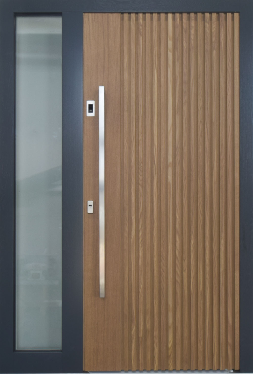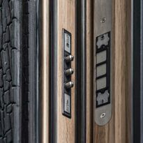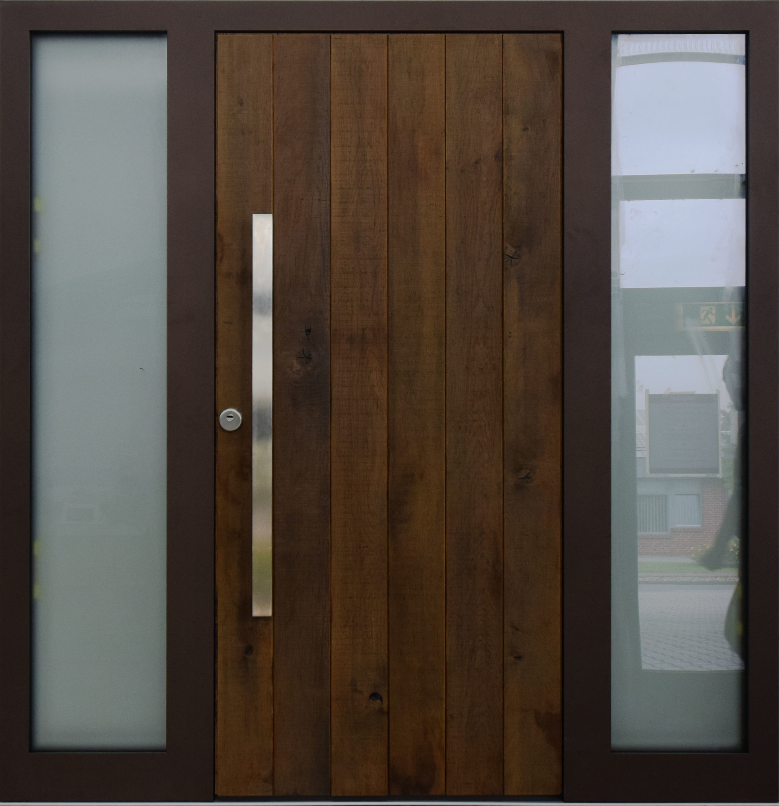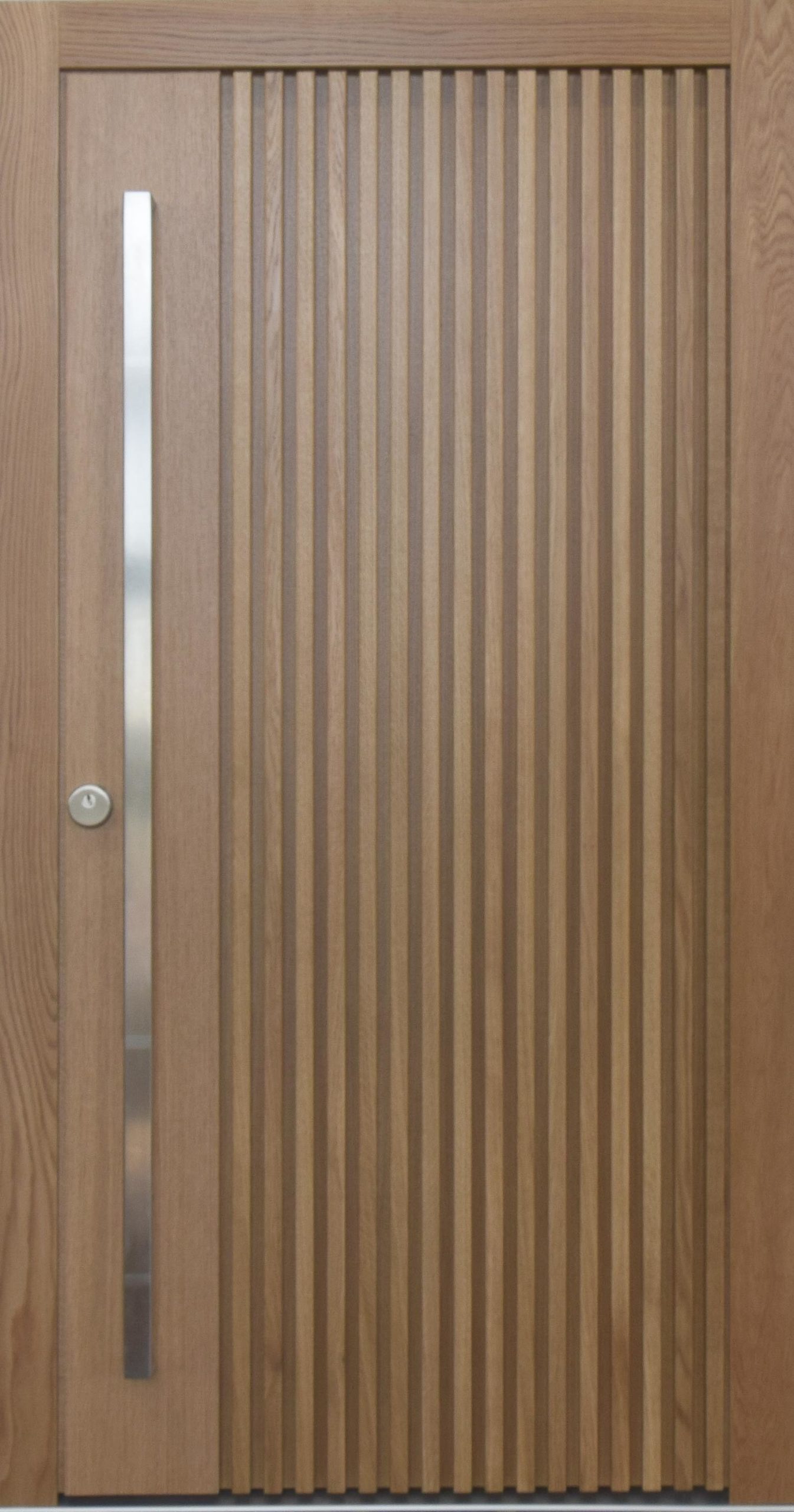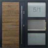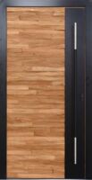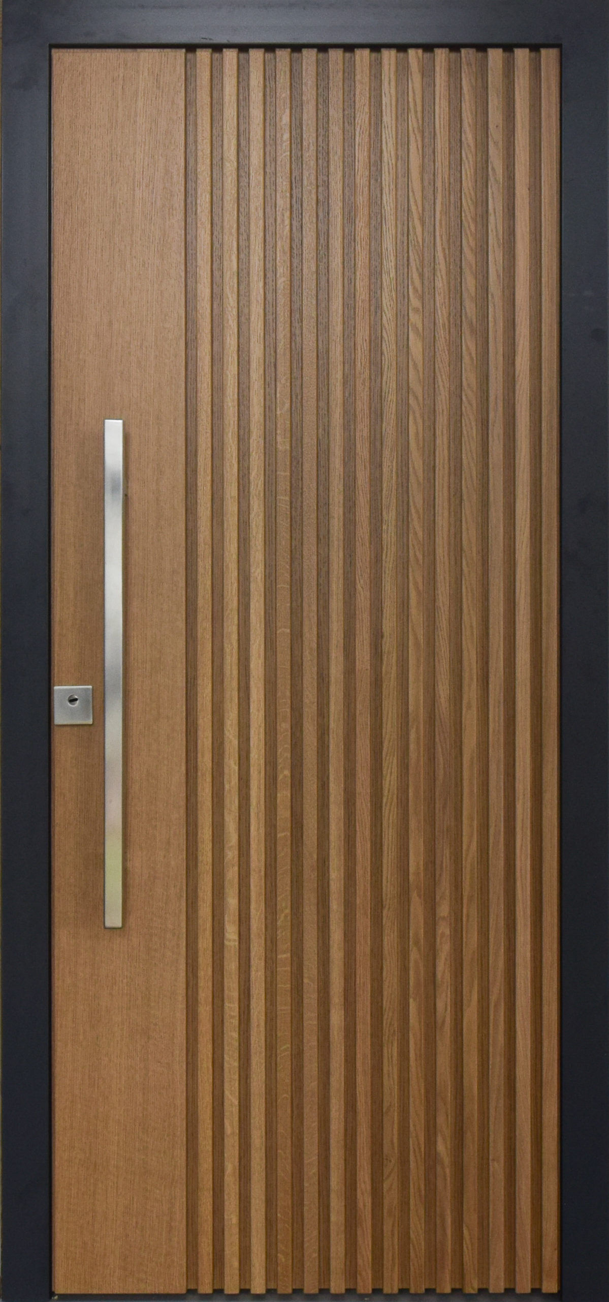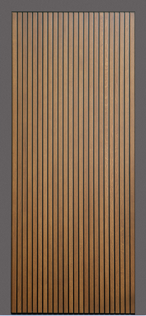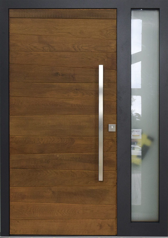 Wir bieten zwei Oberflächen in Shou Sugi Ban Ausführung für die Vorhangschale unserer FENNEN Edition an. Beide basieren auf der Holzart Accoya® . Die Bretter werden für jede bestellte Haustür sorfältig im Werk zusammen gestellt und zu unserem Partner ins holländische Leersum gebracht. Die erfahrenen Brennmeister vor Ort lassen dann nach jahrhundertealter japanischer Tradition die wunderschönen schwarzen Oberflächen entstehen. Der Prozess entwickelt zudem natürliche Resistenzen gegen Schimmel, Feuchtigkeit und Verwitterung. Oberfläche NAKATADO: Die Bretter werden eingebrannt und gebürstet, der natürliche Verlauf der Holzstrukturen wird dadurch dreidimensional mit Höhenunterschieden bis zu 2 mm im Verlauf. Die Behandlung der Oberfläche erfolgt mit Bito Black Holzöl. So wird der Effekt zusätzlich verstärkt. Die finale Oberfläche ist extrem wetterfest und färbt nicht ab. Die Nachbehandlung mit Bito Black ist problemlos möglich. Ebenso die Reinigung mit einem weichen Tuch und Wasser. Oberfläche MARUGAME: Bei dieser Variante entsteht durch den Brennvorgang ein charakteristisches eher gleichmäßiges Muster der Kohleschicht mit leichtem Glanz. Diese Schicht ist sehr hart und hat sich im Außeneinsatz bereits als langjährige Fassadenverkleidung bewährt. Sie wird zusätzlich nach dem Brennvorgang mit einem Epoxyd-Harz veredelt. Die Oberfläche wird dadurch noch härter, unempfindlicher gegen Stöße, das Abfärben der Kohle wird verhindert. Marugame kann nicht nachbehandelt werden. Die Reinigung erfolgt einfach mit Wasser und weicher Bürste. Auf beide Oberflächen erhalten Sie unsere reguläre Gewährleistung. Die sehr spezielle Konstruktion dieser Tür ermöglicht es, die komplette Vorhangschale mit wenigen Handgriffen auszuwechseln. Das trifft auf alle Modelle der Edition FENNEN ohne Glasausschnitt zu. Darüber hinaus ist es sogar möglich, einzelne Bohlen auszutauschen, sollten diese beispielsweise mechanisch beschädigt werden. Dieses hohe Maß an Flexibilität ist ein besonderer Vorzug, den Sie