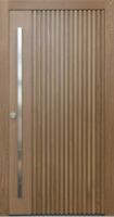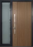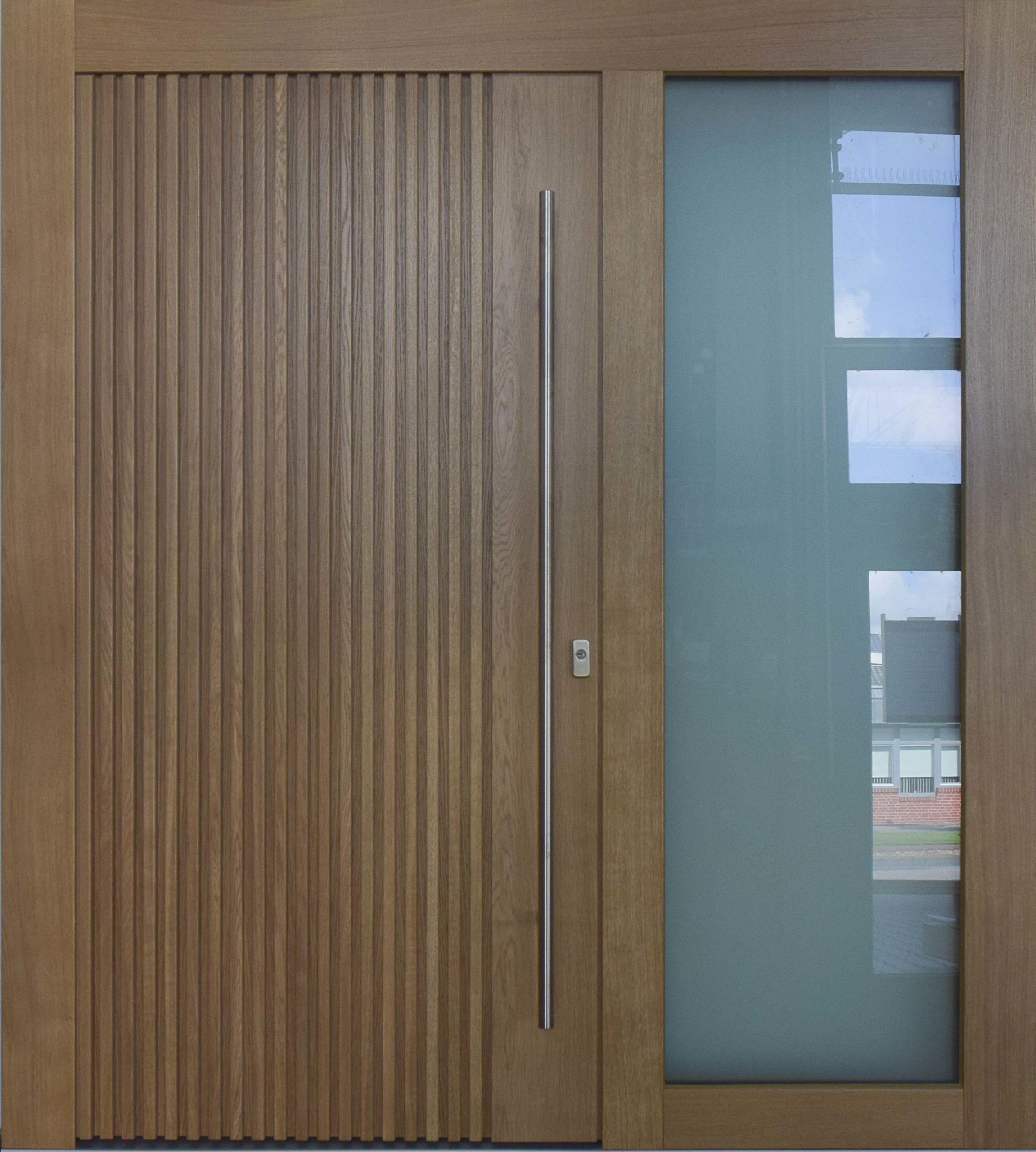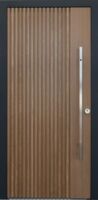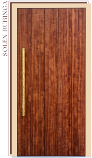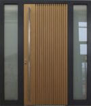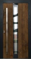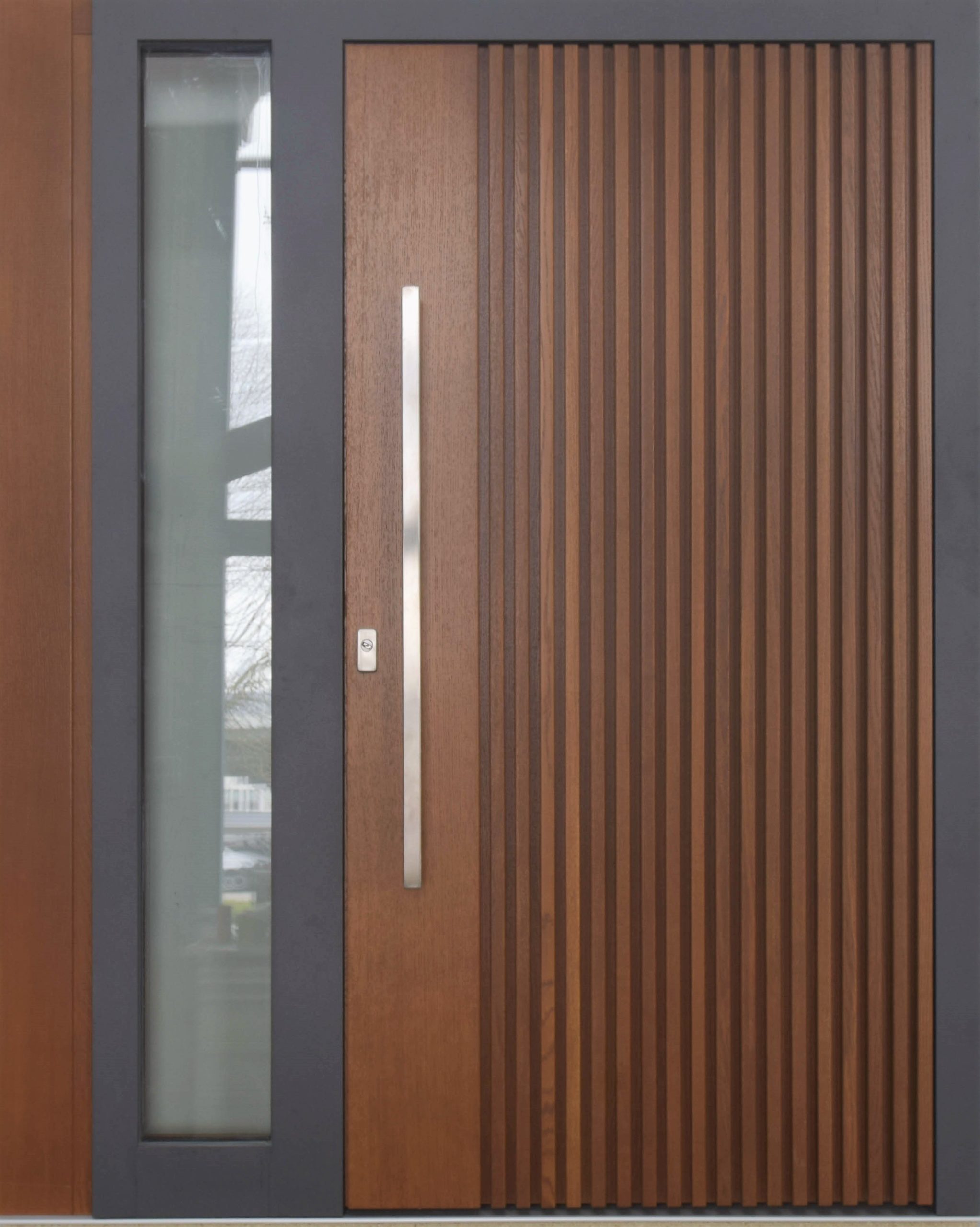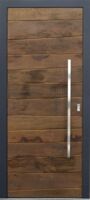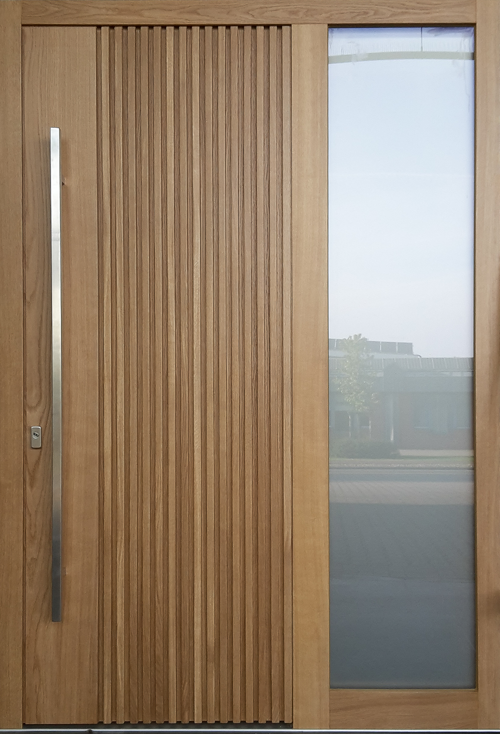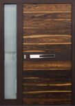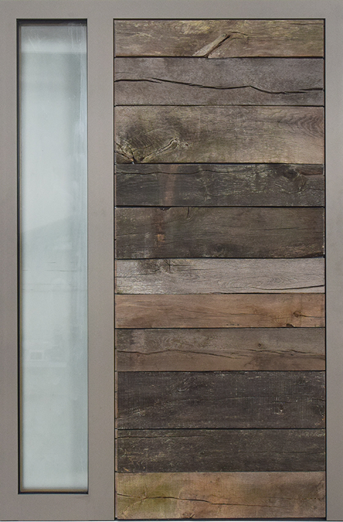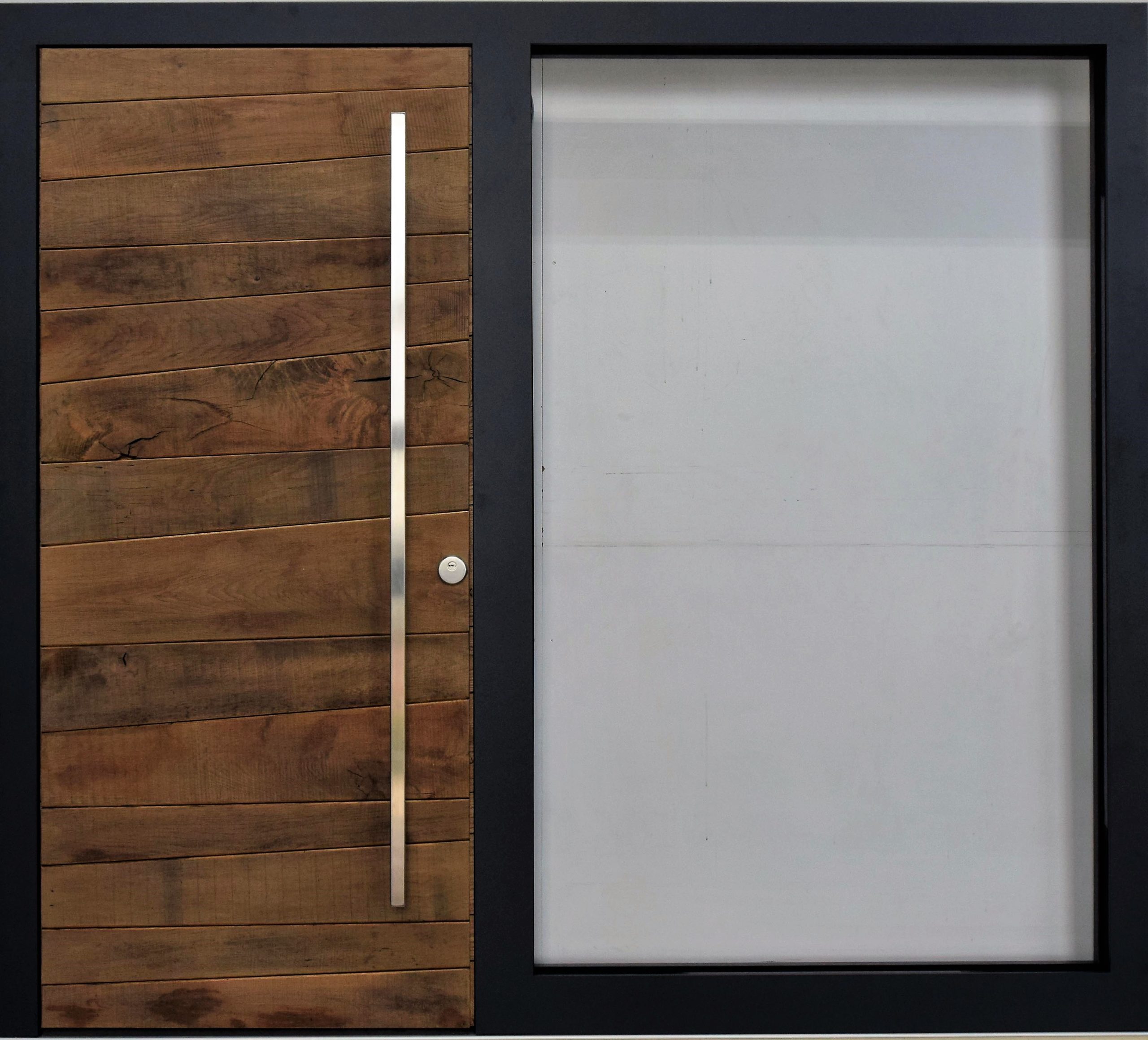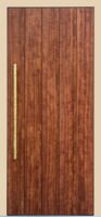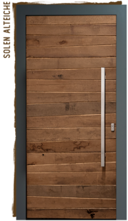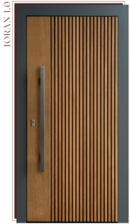 Wir bieten zwei Oberflächen in Shou Sugi Ban Ausführung für die Vorhangschale unserer FENNEN Edition an. Beide basieren auf der Holzart Accoya® . Die Bretter werden für jede bestellte Haustür sorfältig im Werk zusammen gestellt und zu unserem Partner ins holländische Leersum gebracht. Die erfahrenen Brennmeister vor Ort lassen dann nach jahrhundertealter japanischer Tradition die wunderschönen schwarzen Oberflächen entstehen. Der Prozess entwickelt zudem natürliche Resistenzen gegen Schimmel, Feuchtigkeit und Verwitterung. Oberfläche NAKATADO: Die Bretter werden eingebrannt und gebürstet, der natürliche Verlauf der Holzstrukturen wird dadurch dreidimensional mit Höhenunterschieden bis zu 2 mm im Verlauf. Die Behandlung der Oberfläche erfolgt mit Bito Black Holzöl. So wird der Effekt zusätzlich verstärkt. Die finale Oberfläche ist extrem wetterfest und färbt nicht ab. Die Nachbehandlung mit Bito Black ist problemlos möglich. Ebenso die Reinigung mit einem weichen Tuch und Wasser. Oberfläche MARUGAME: Bei dieser Variante entsteht durch den Brennvorgang ein charakteristisches eher gleichmäßiges Muster der Kohleschicht mit leichtem Glanz. Diese Schicht ist sehr hart und hat sich im Außeneinsatz bereits als langjährige Fassadenverkleidung bewährt. Sie wird zusätzlich nach dem Brennvorgang mit einem Epoxyd-Harz veredelt. Die Oberfläche wird dadurch noch härter, unempfindlicher gegen Stöße, das Abfärben der Kohle wird verhindert. Marugame kann nicht nachbehandelt werden. Die Reinigung erfolgt einfach mit Wasser und weicher Bürste. Auf beide Oberflächen erhalten Sie unsere reguläre Gewährleistung. Die sehr spezielle Konstruktion dieser Tür ermöglicht es, die komplette Vorhangschale mit wenigen Handgriffen auszuwechseln. Das trifft auf alle Modelle der Edition FENNEN ohne Glasausschnitt zu. Darüber hinaus ist es sogar möglich, einzelne Bohlen auszutauschen, sollten diese beispielsweise mechanisch beschädigt werden. Dieses hohe Maß an Flexibilität ist ein besonderer Vorzug, den Sie