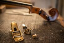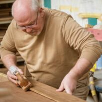 Mit der Axt werden aus den schweren Holzbohlen der Sturmeiche die Puzzleteile für das Türendesign geschlagen. Das Zusammenlegen erfordert viel Fingerspitzengefühl, erst wenn das Gesamtbild perfekt ist, wird Teil für Teil fixiert und die Oberfläche sorgsam veredelt.