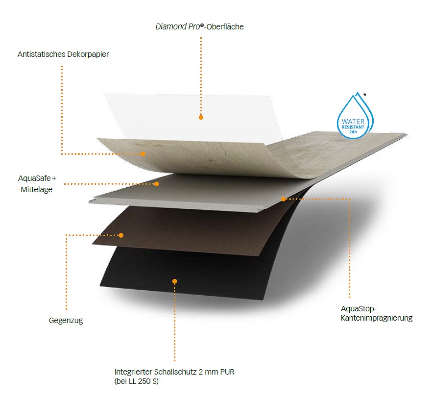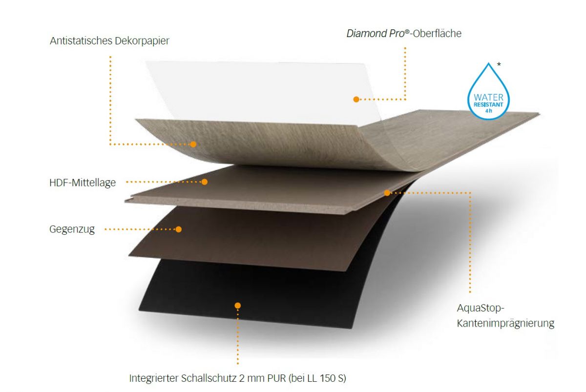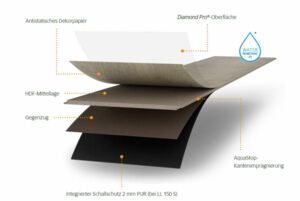 a. DiamondPro-Oberfläche b. Antistatisches Dekorpapier c. HDF-Mittellage d. AquaStop-Kantenimprägnierung e. Gegenzug für Formstabilität