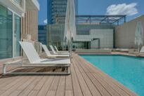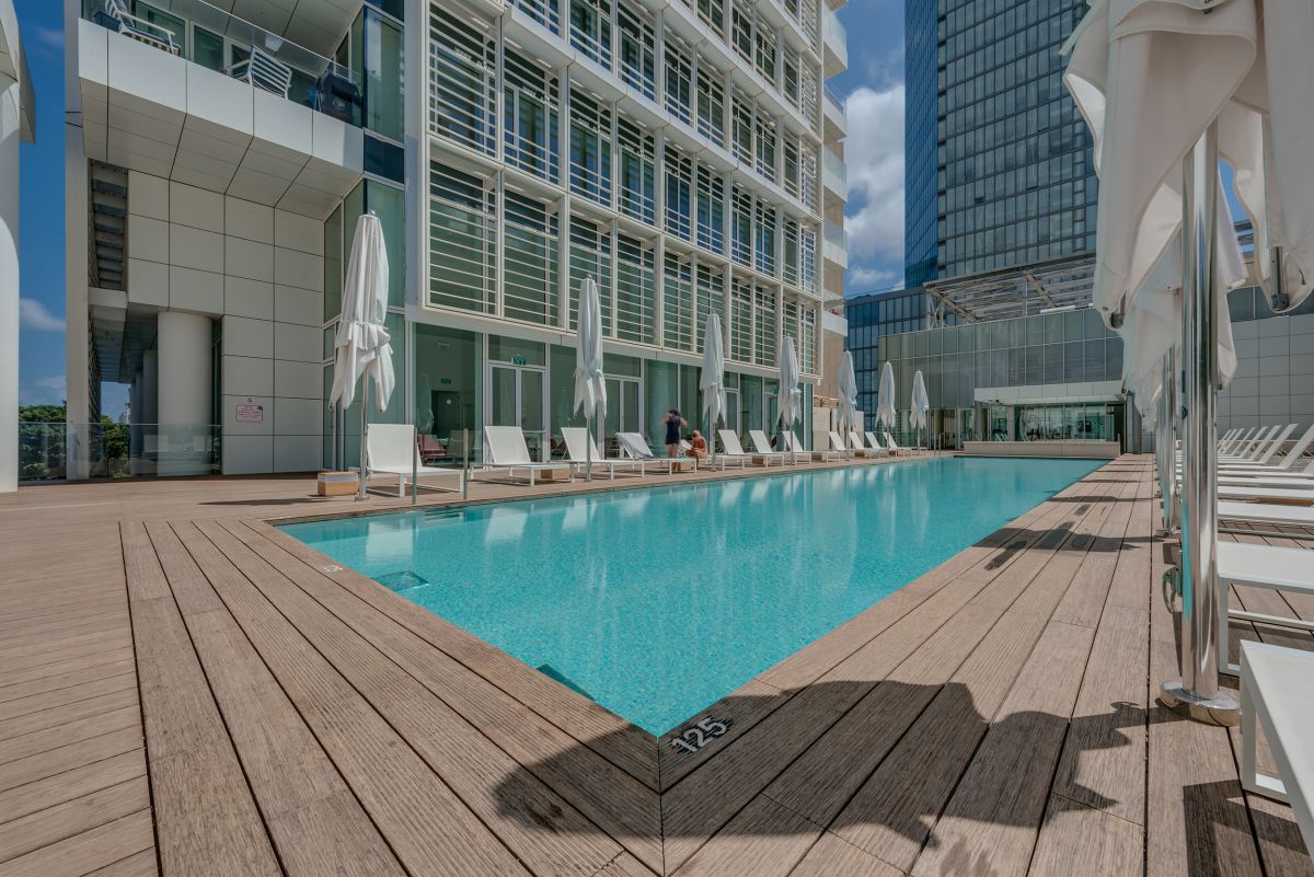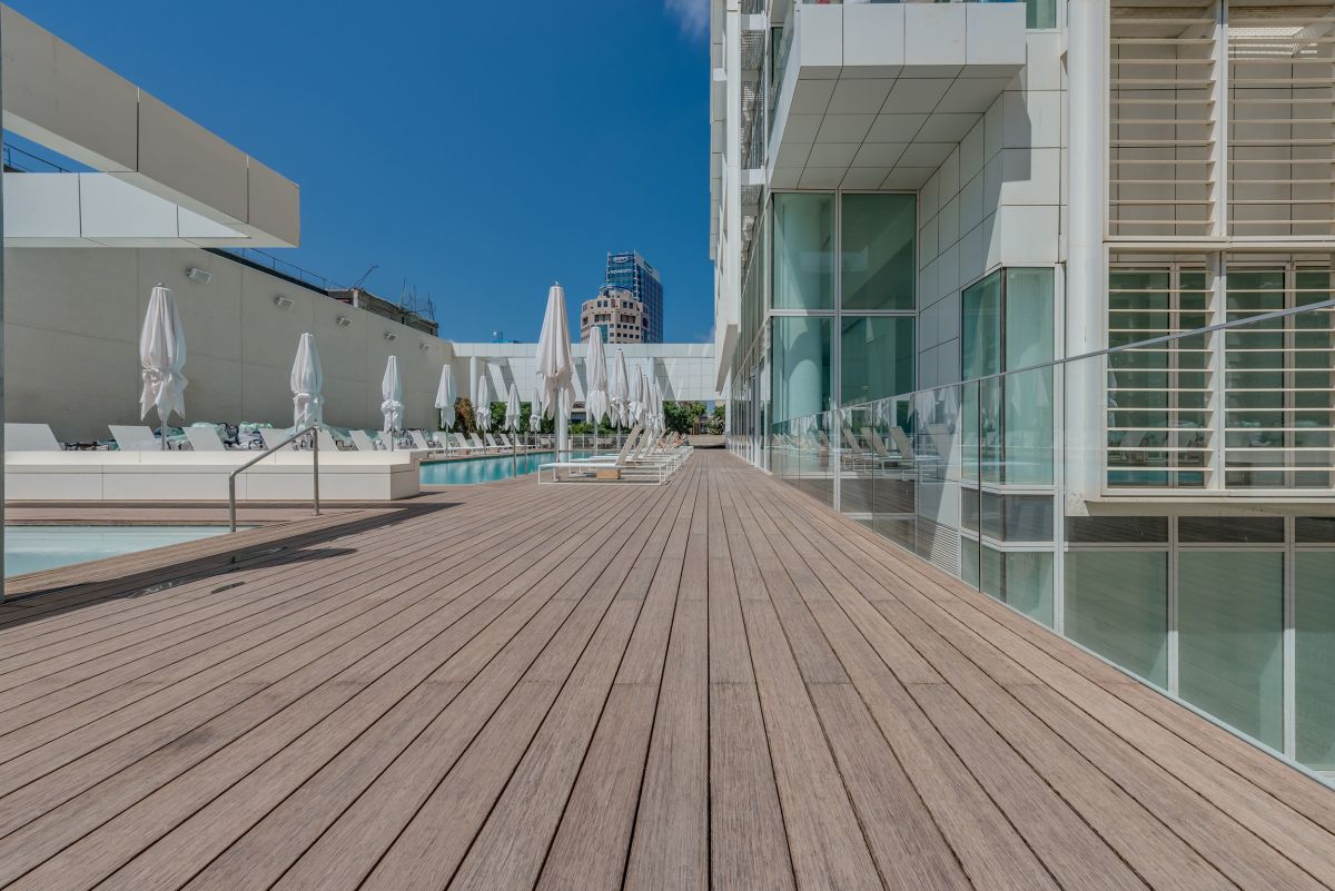 MOSO Bamboo X-treme Terrassendielen umgeben die Pools des Meier on Rothschild Luxusapartment-Hochhaus im angesagten Tel Aviv Viertels Rothschild. Im markanten Gebäude vom Pritzker-Preisträger Richard Meier wurden Bambus Terrassendielen verarbeitet.