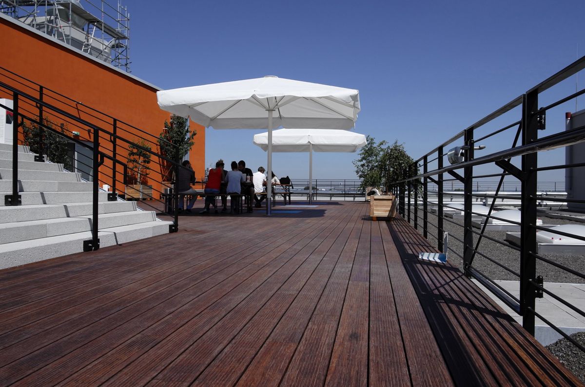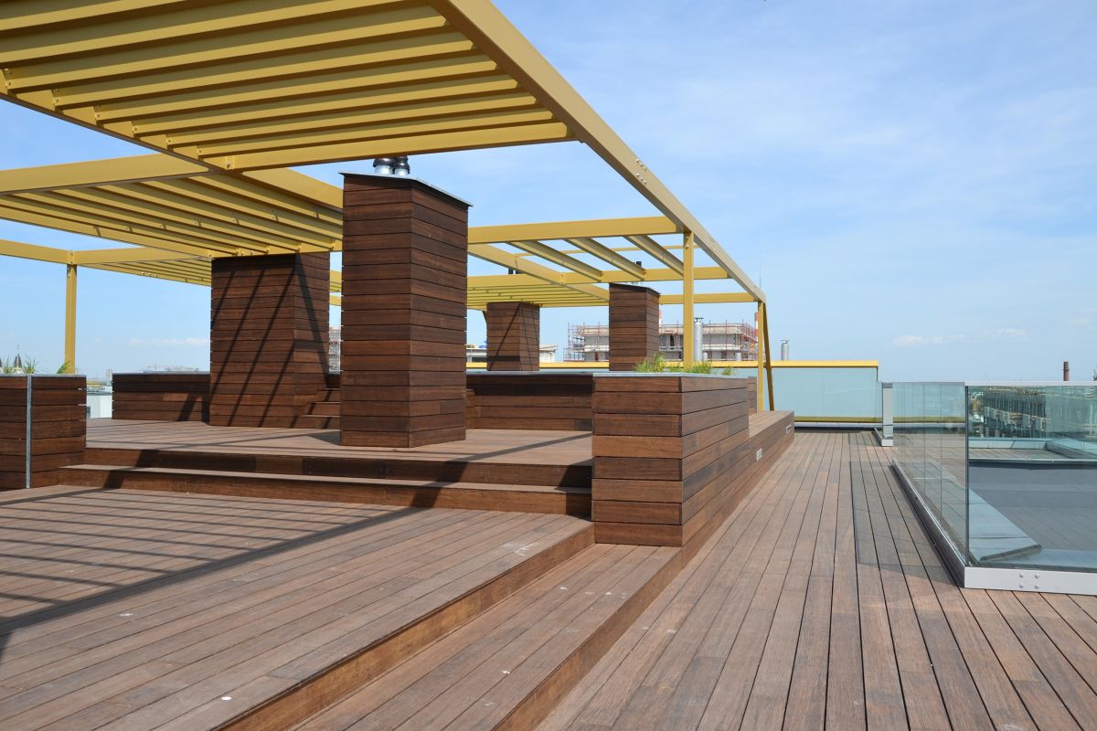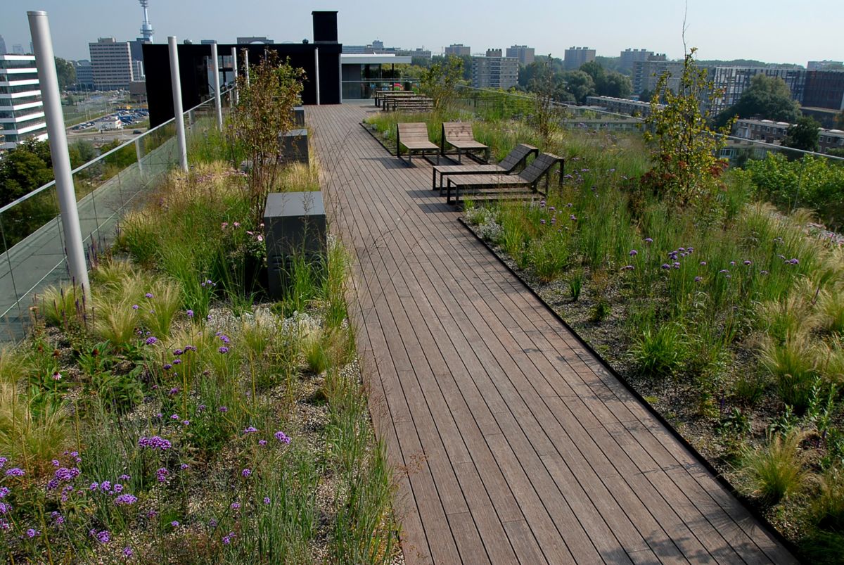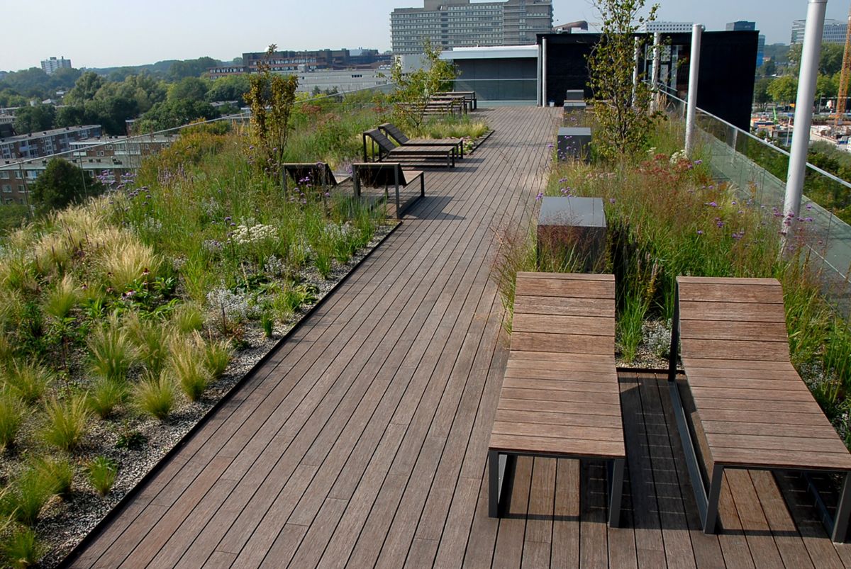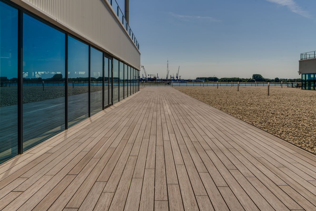 Eines der ersten großen Bambus-Terrassenprojekte in den Niederlanden war die Jumbo Hauptsitz in Schiedam. Die Dachterrasse und der Laufgang rund um das Gebäude sind mit 2500 m² Bambus Terrassendielen ausgestattet. Die in diesem Inspirationsprojekt gezeigte Fotografie ist 5 Jahre nach der Installation aufgenommen und zeigt die extrem hohe Stabilität und die schöne Bewitterung.
