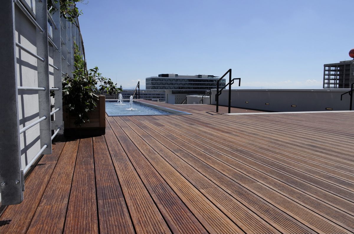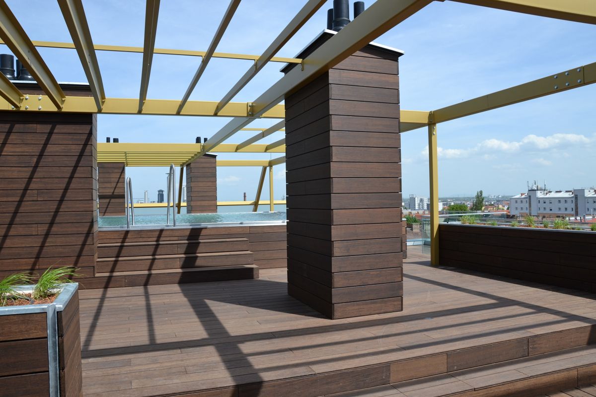 In der Wohnanlage Braunhubergasse in Wien wurden insgesamt ca. 1580 m² MOSO® Bamboo X-treme® Terrassendielen verlegt. Jedes Appartement verfügt über einen privaten Außenbereich in Form einer Loggia, eines Balkons oder einer Dachterrasse. Alle diese Freiflächen sind mit MOSO® Bamboo X-treme® Terrassendielen auf einer Aluminium-Unterkonstruktion bedeckt. Auf dem Dach befindet sich eine öffentliche Dachterrasse mit Pool zur Mitbenutzung aller Bewohner, ebenfalls mit nachhaltigem Bambus verkleidet. Der grüne Innenhof der Wohnanlage dient als weitere Kommunikationszone für die Bewohner und bietet Spiel- und Ruhezonen sowie eine Bambusterrasse für gemeinsame Gartenpartys.