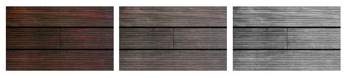 Abstufung der Vergraung von Bamboo X-treme im Laufe der Zeit: neue nicht verwitterte Terrassendielen (links), 3 Monate der Witterung ausgesetzt (Mitte) und 18 Monate der Witterung ausgesetzt ( rechts)