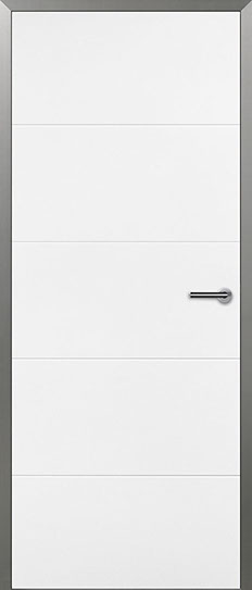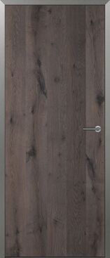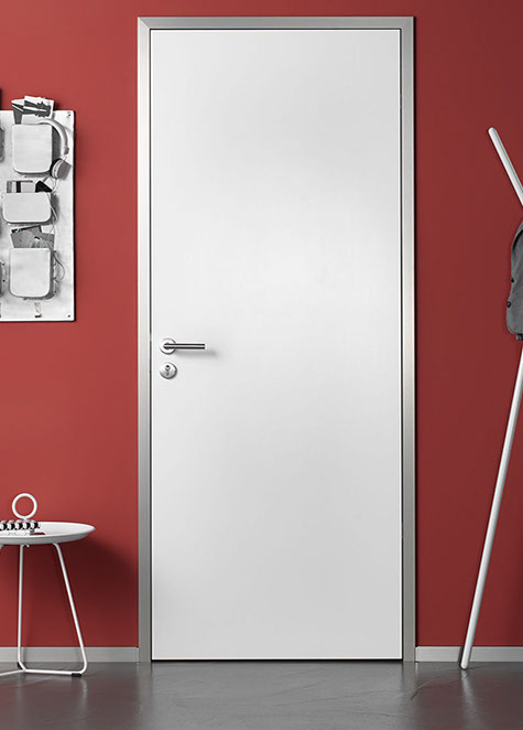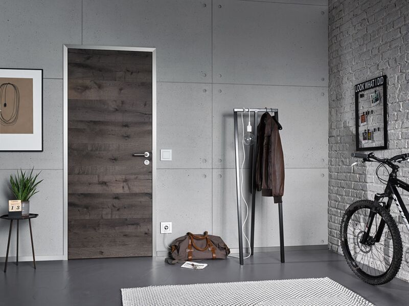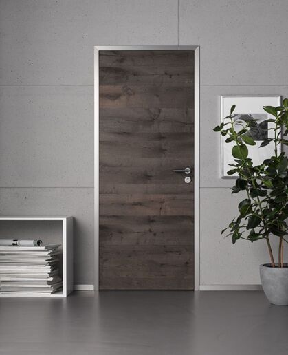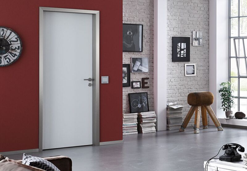 Eine Zarge in Alumin Edelstahl Finish verträgt Türfüllungen mit großflächiger Block-Aufteilung, die der markanten Schliffstruktur etwas entgegenzusetzen haben. Wie wär es mit Weißlack, dunkler Eiche oder extravaganten Glasdesigns?