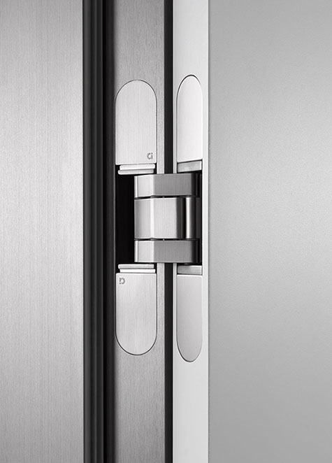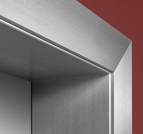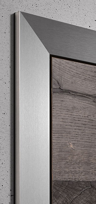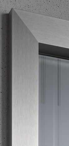 Die Oberfläche von Alumin Edelstahl Finish erzielt durch ihr einzigartiges Schliffbild eine besondere Wirkung. In der Gehrung treffen die gegenläufigen Schliffstrukturen so aufeinander, dass ein besonders räumlicher Eindruck entsteht. Die Zarge wird zum Bilderrahmen, der die Tür effektvoll einfasst.