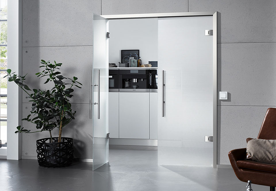 die eine eigene Sprache sprechen. So wie Pendeltüren mit satiniertem Glas,