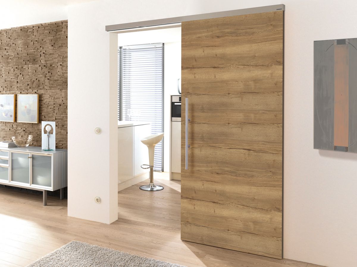 Modell Glatt | FACHWERK Eiche natur quer CPL | Schiebesystem Tvin 2.0 ähnl. Edelstahl matt mit Griffstange G 700