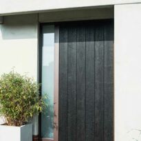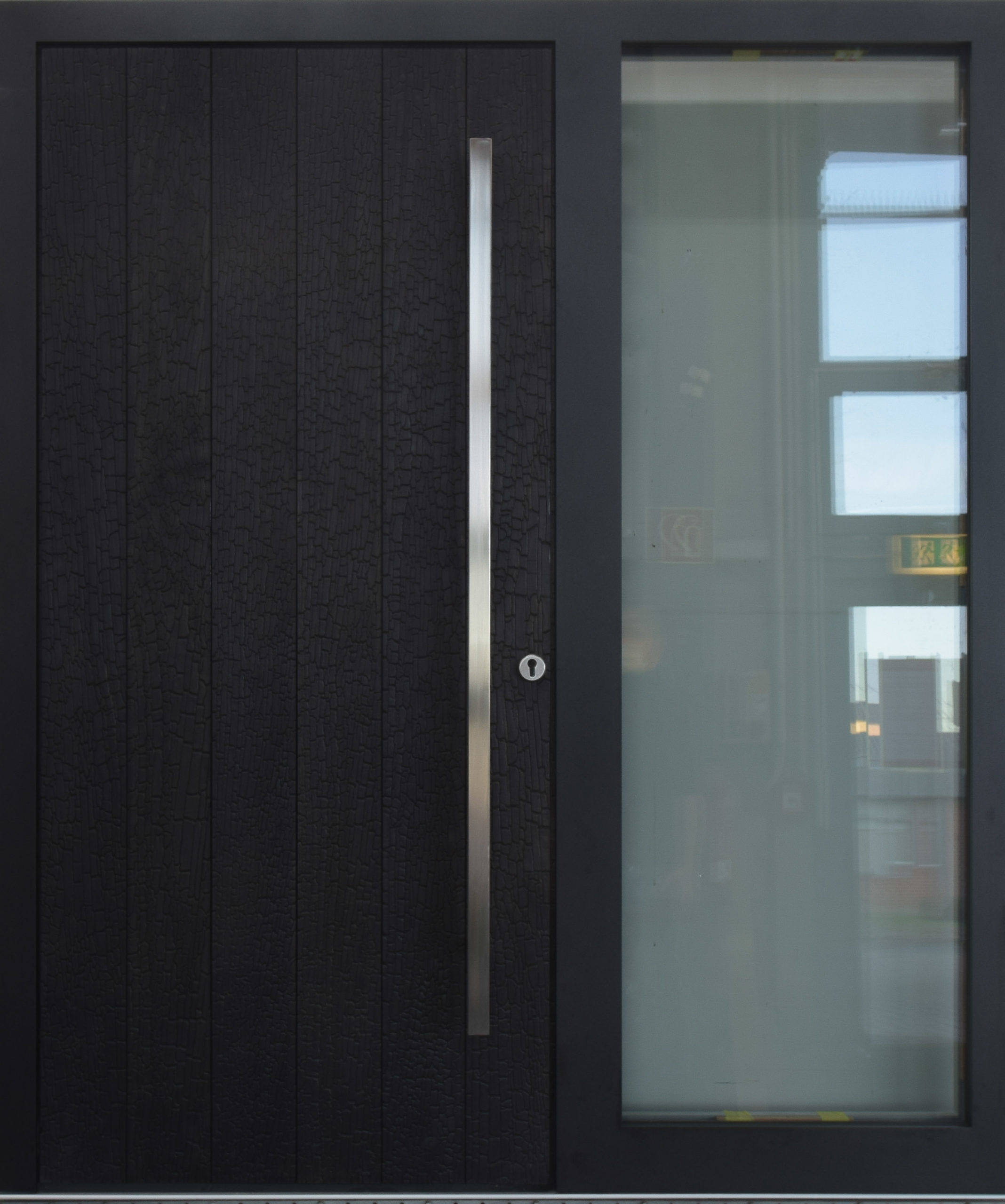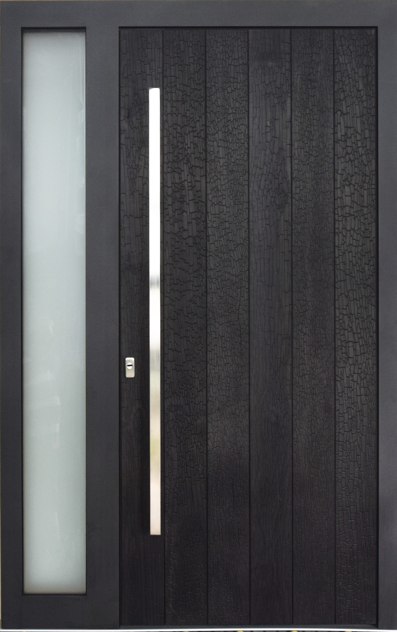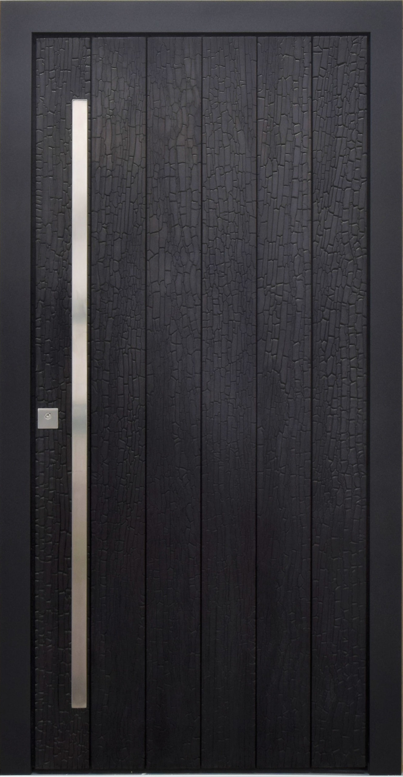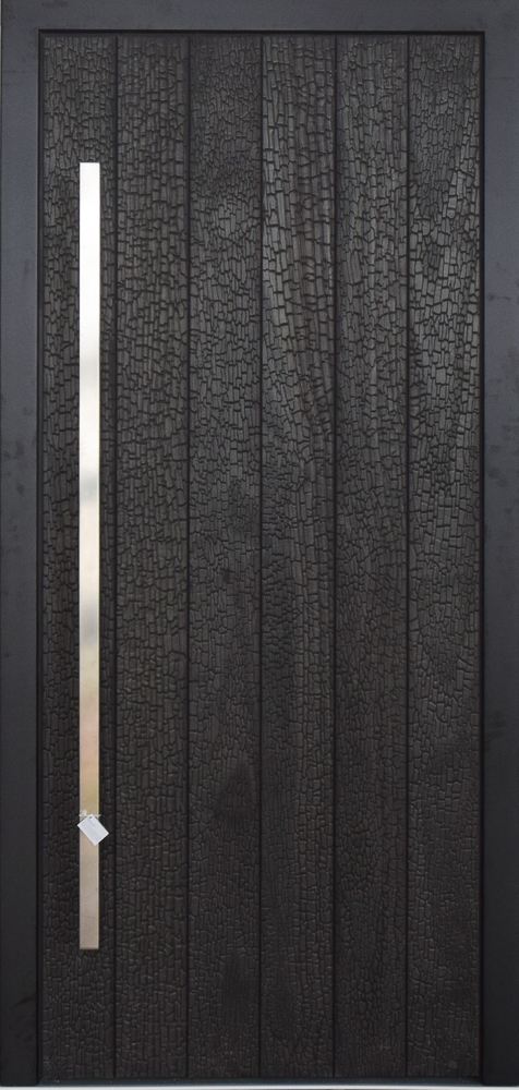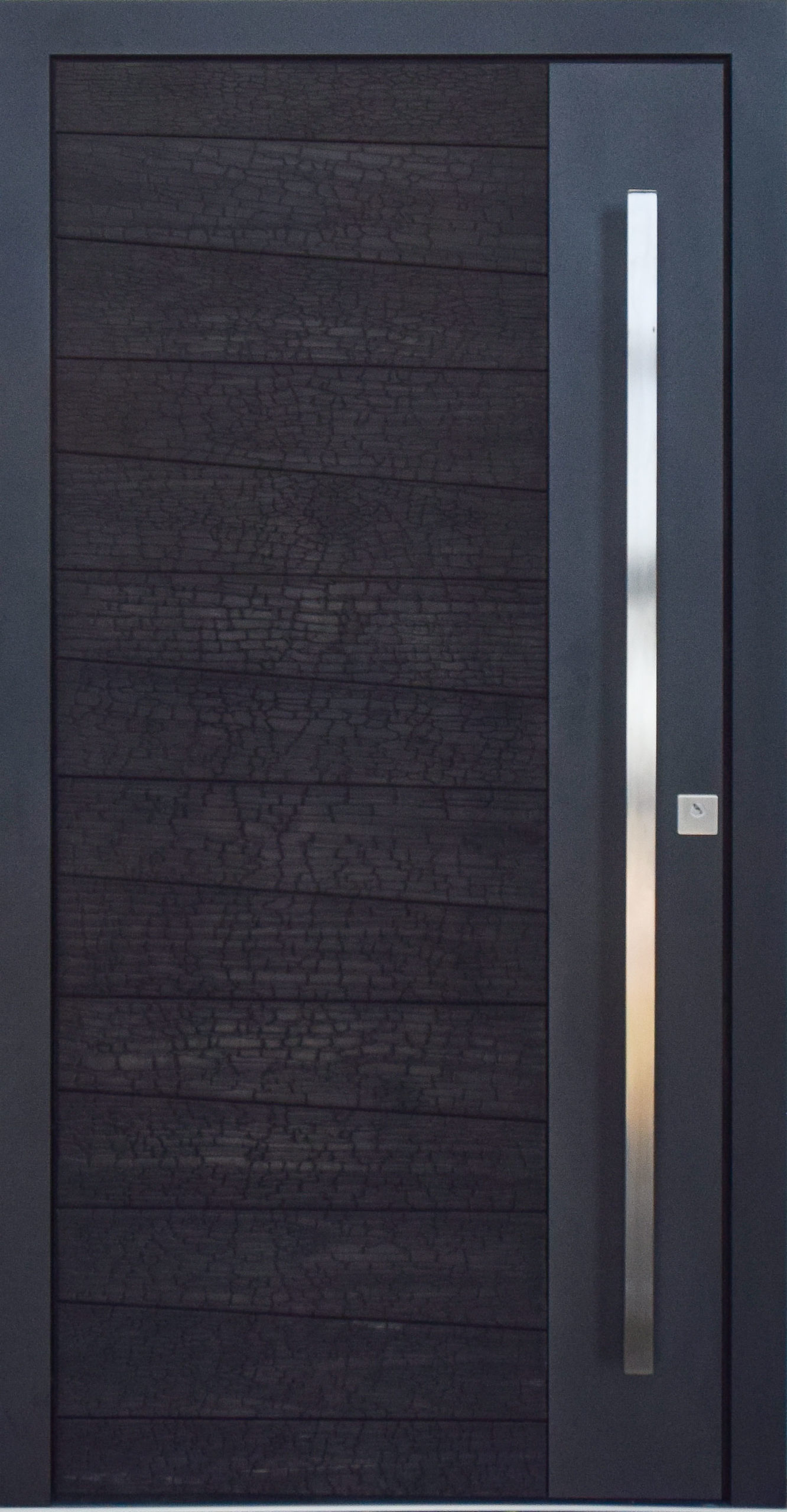 Wir bieten zwei Oberflächen in Shou Sugi Ban Ausführung für die Vorhangschale unserer FENNEN Edition an. Beide basieren auf der Holzart Accoya® . Die Bretter werden für jede bestellte Haustür sorfältig im Werk zusammen gestellt und zu unserem Partner ins holländische Leersum gebracht. Die erfahrenen Brennmeister vor Ort lassen dann nach jahrhundertealter japanischer Tradition die wunderschönen schwarzen Oberflächen entstehen. Der Prozess entwickelt zudem natürliche Resistenzen gegen Schimmel, Feuchtigkeit und Verwitterung. Oberfläche NAKATADO: Die Bretter werden eingebrannt und gebürstet, der natürliche Verlauf der Holzstrukturen wird dadurch dreidimensional mit Höhenunterschieden bis zu 2 mm im Verlauf. Die Behandlung der Oberfläche erfolgt mit Bito Black Holzöl. So wird der Effekt zusätzlich verstärkt. Die finale Oberfläche ist extrem wetterfest und färbt nicht ab. Die Nachbehandlung mit Bito Black ist problemlos möglich. Ebenso die Reinigung mit einem weichen Tuch und Wasser. Oberfläche MARUGAME: Bei dieser Variante entsteht durch den Brennvorgang ein charakteristisches eher gleichmäßiges Muster der Kohleschicht mit leichtem Glanz. Diese Schicht ist sehr hart und hat sich im Außeneinsatz bereits als langjährige Fassadenverkleidung bewährt. Sie wird zusätzlich nach dem Brennvorgang mit einem Epoxyd-Harz veredelt. Die Oberfläche wird dadurch noch härter, unempfindlicher gegen Stöße, das Abfärben der Kohle wird verhindert. Marugame kann nicht nachbehandelt werden. Die Reinigung erfolgt einfach mit Wasser und weicher Bürste. Auf beide Oberflächen erhalten Sie unsere reguläre Gewährleistung. Die sehr spezielle Konstruktion dieser Tür ermöglicht es, die komplette Vorhangschale mit wenigen Handgriffen auszuwechseln. Das trifft auf alle Modelle der Edition FENNEN ohne Glasausschnitt zu. Darüber hinaus ist es sogar möglich, einzelne Bohlen auszutauschen, sollten diese beispielsweise mechanisch beschädigt werden. Dieses hohe Maß an Flexibilität ist ein besonderer Vorzug, den Sie