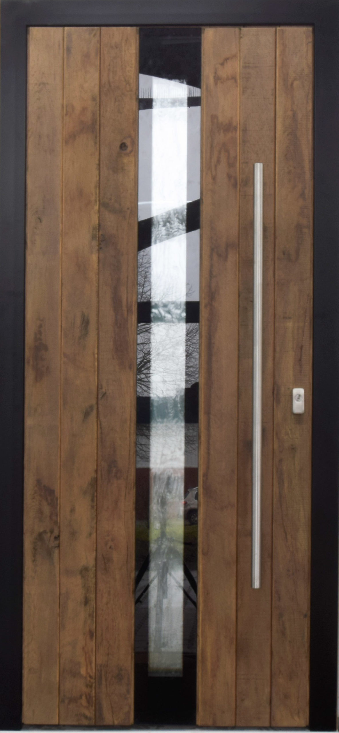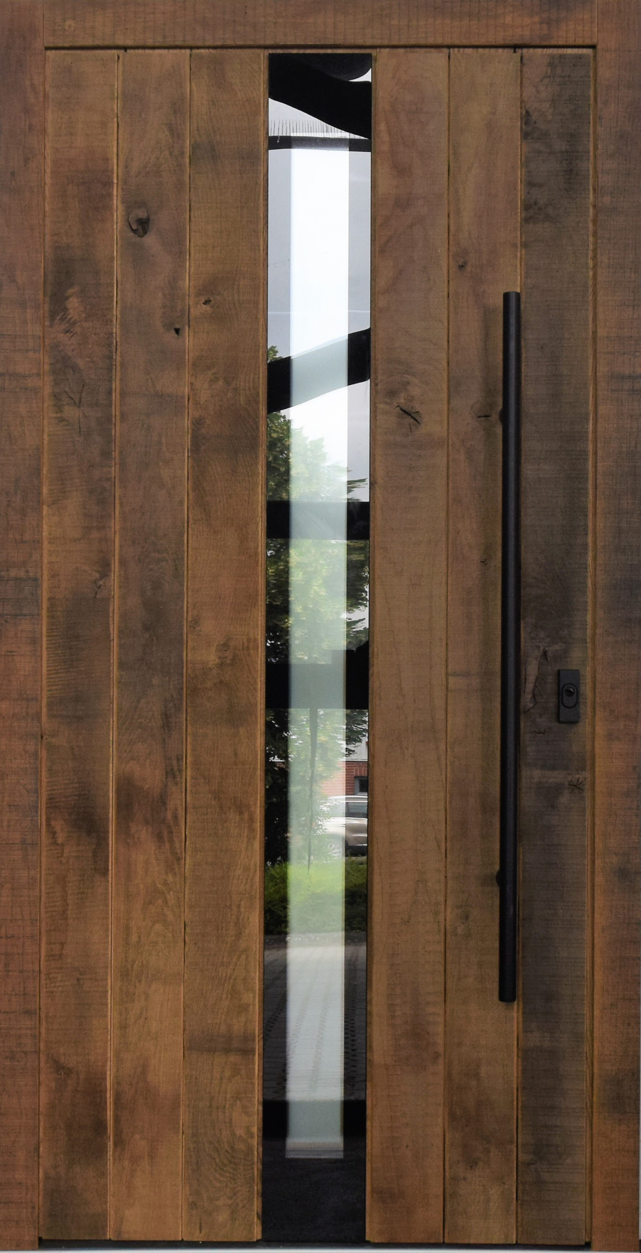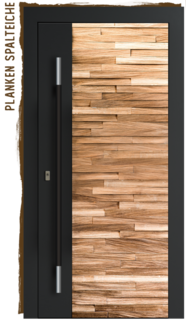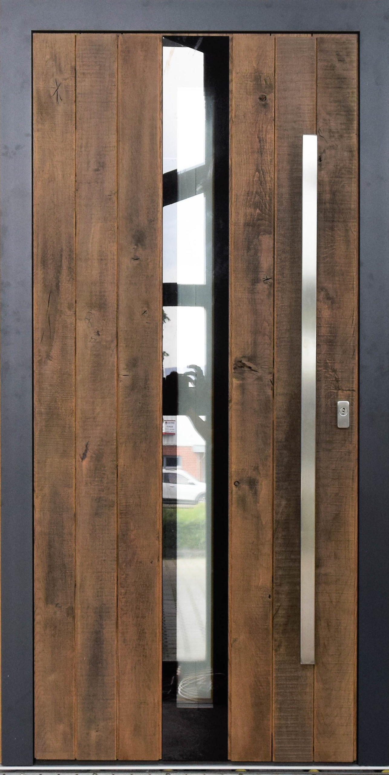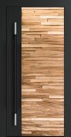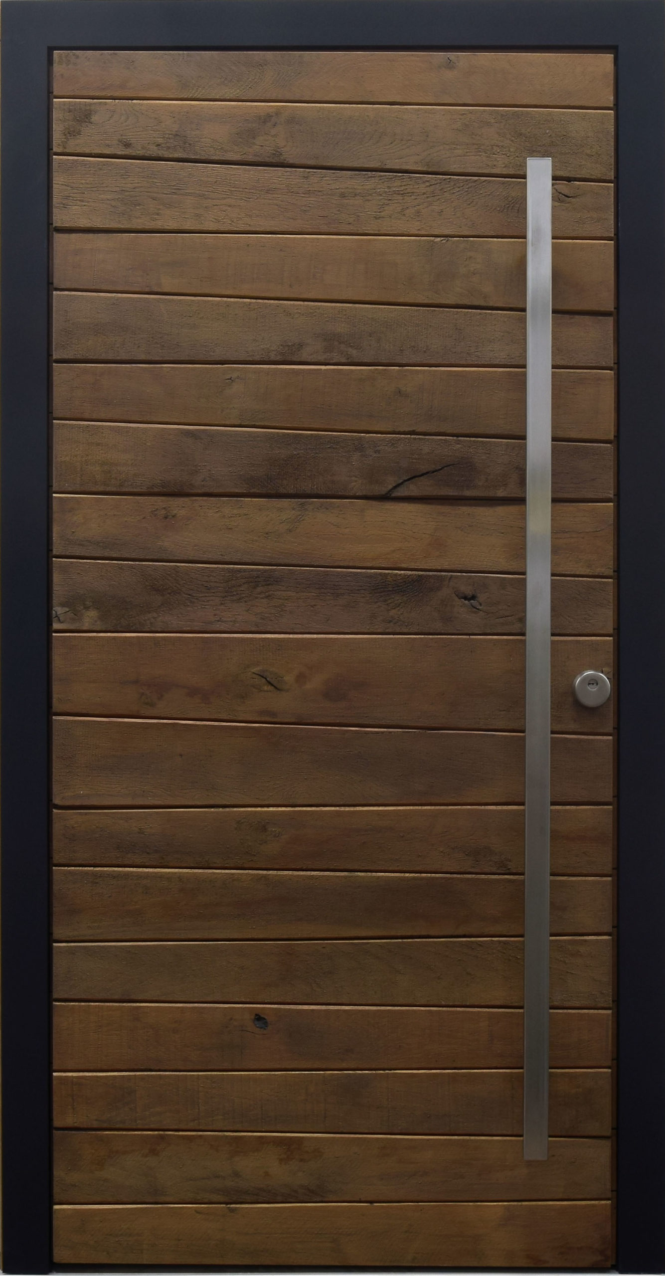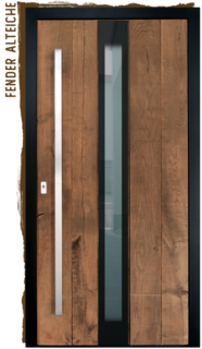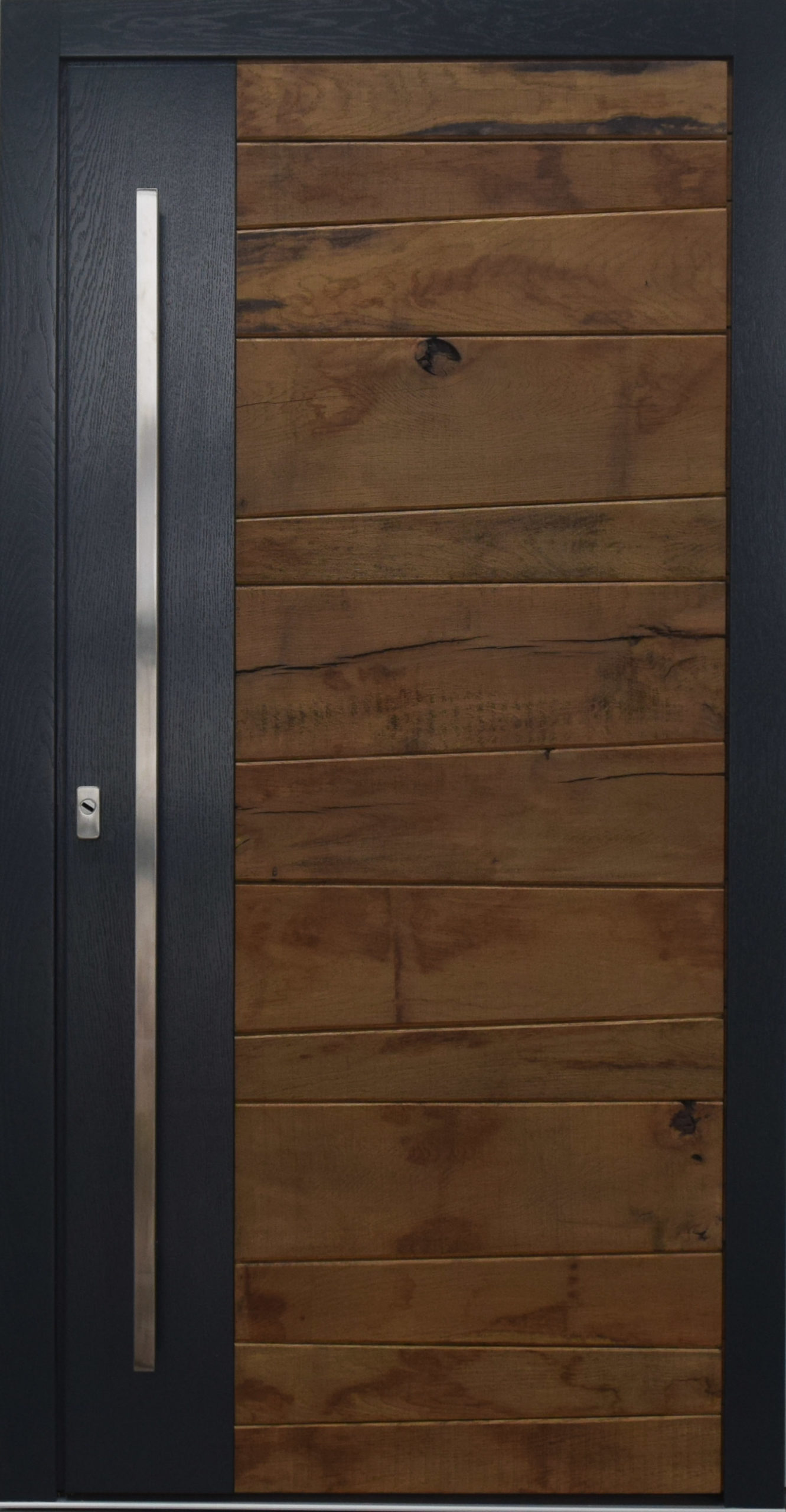 Wir bieten zwei Oberflächen in Shou Sugi Ban Ausführung für die Vorhangschale unserer FENNEN Edition an. Beide basieren auf der Holzart Accoya® . Die Bretter werden für jede bestellte Haustür sorfältig im Werk zusammen gestellt und zu unserem Partner ins holländische Leersum gebracht. Die erfahrenen Brennmeister vor Ort lassen dann nach jahrhundertealter japanischer Tradition die wunderschönen schwarzen Oberflächen entstehen. Der Prozess entwickelt zudem natürliche Resistenzen gegen Schimmel, Feuchtigkeit und Verwitterung. Oberfläche NAKATADO: Die Bretter werden eingebrannt und gebürstet, der natürliche Verlauf der Holzstrukturen wird dadurch dreidimensional mit Höhenunterschieden bis zu 2 mm im Verlauf. Die Behandlung der Oberfläche erfolgt mit Bito Black Holzöl. So wird der Effekt zusätzlich verstärkt. Die finale Oberfläche ist extrem wetterfest und färbt nicht ab. Die Nachbehandlung mit Bito Black ist problemlos möglich. Ebenso die Reinigung mit einem weichen Tuch und Wasser. Oberfläche MARUGAME: Bei dieser Variante entsteht durch den Brennvorgang ein charakteristisches eher gleichmäßiges Muster der Kohleschicht mit leichtem Glanz. Diese Schicht ist sehr hart und hat sich im Außeneinsatz bereits als langjährige Fassadenverkleidung bewährt. Sie wird zusätzlich nach dem Brennvorgang mit einem Epoxyd-Harz veredelt. Die Oberfläche wird dadurch noch härter, unempfindlicher gegen Stöße, das Abfärben der Kohle wird verhindert. Marugame kann nicht nachbehandelt werden. Die Reinigung erfolgt einfach mit Wasser und weicher Bürste. Auf beide Oberflächen erhalten Sie unsere reguläre Gewährleistung. Die sehr spezielle Konstruktion dieser Tür ermöglicht es, die komplette Vorhangschale mit wenigen Handgriffen auszuwechseln. Das trifft auf alle Modelle der Edition FENNEN ohne Glasausschnitt zu. Darüber hinaus ist es sogar möglich, einzelne Bohlen auszutauschen, sollten diese beispielsweise mechanisch beschädigt werden. Dieses hohe Maß an Flexibilität ist ein besonderer Vorzug, den Sie
