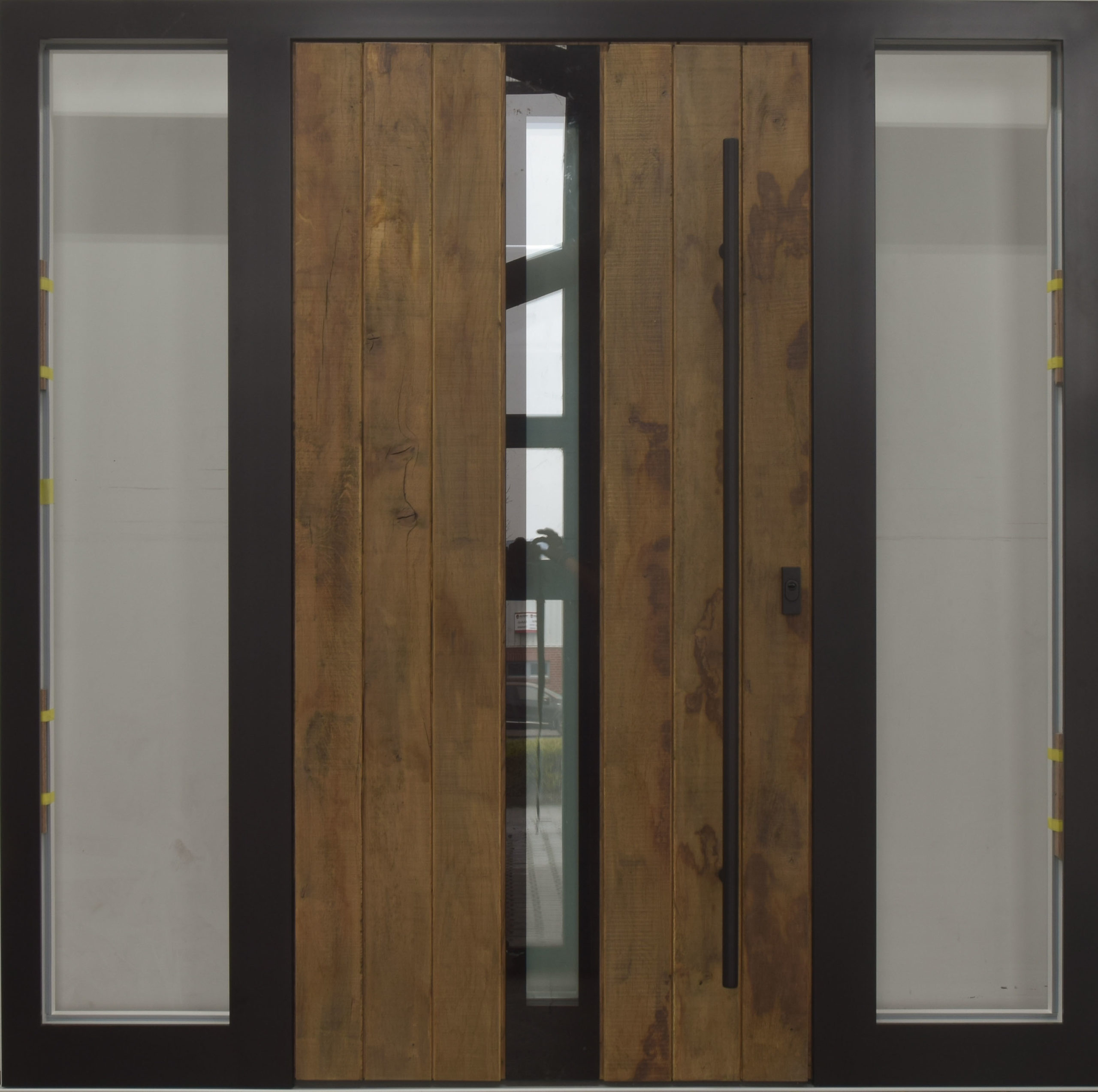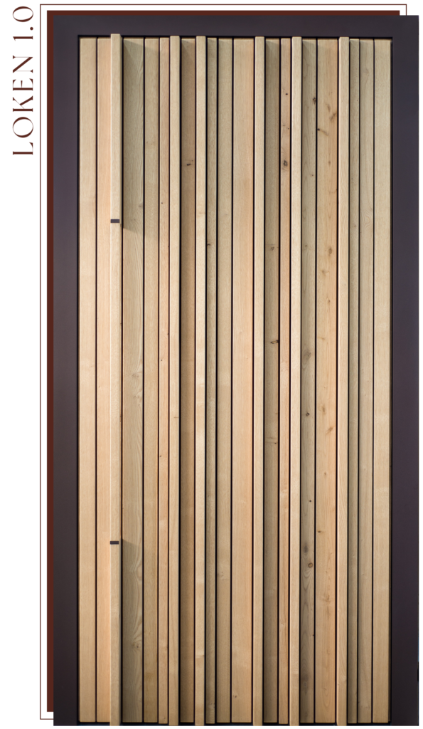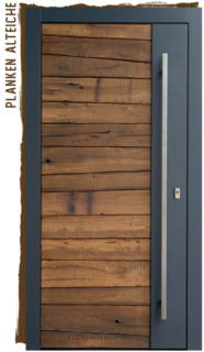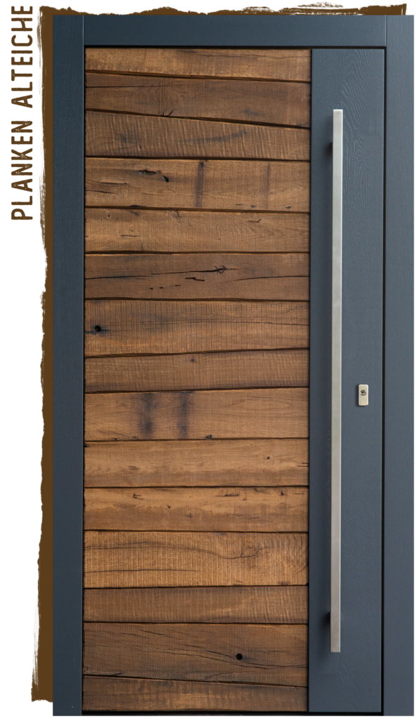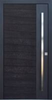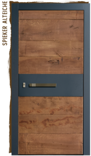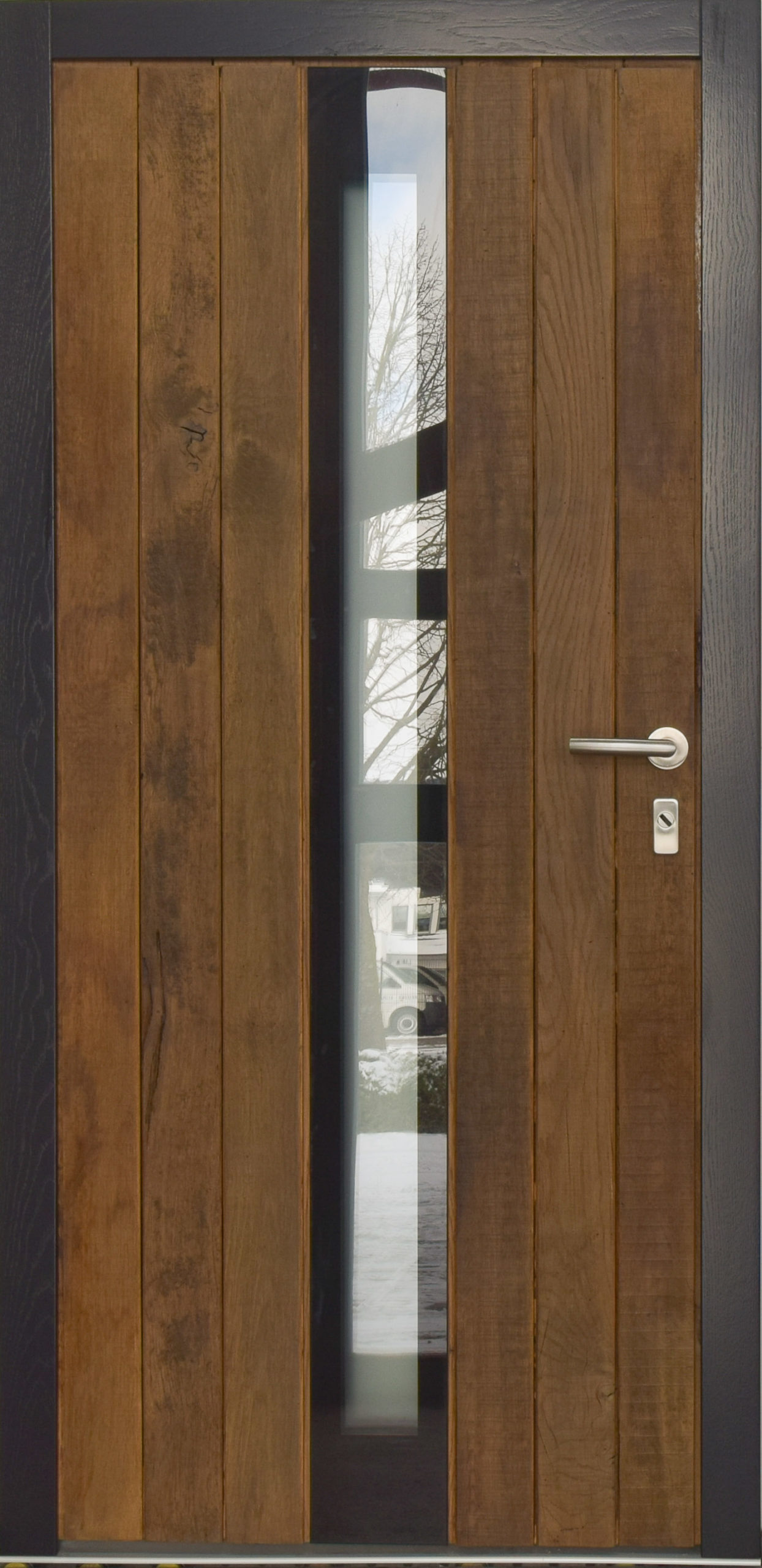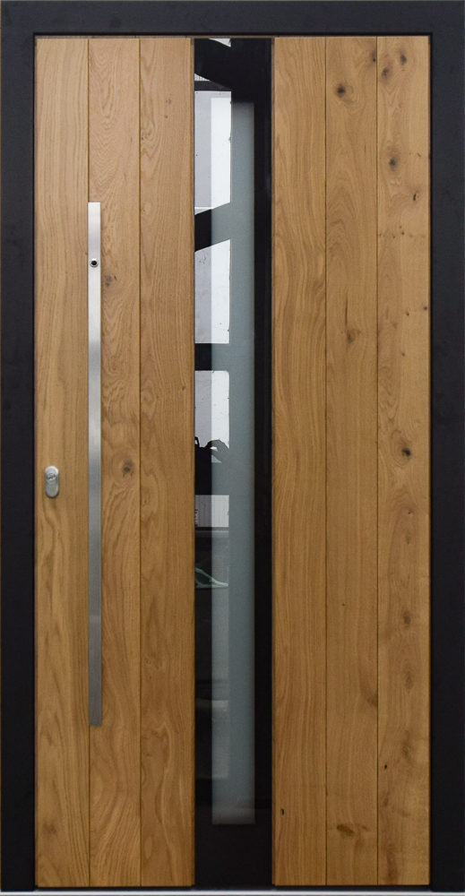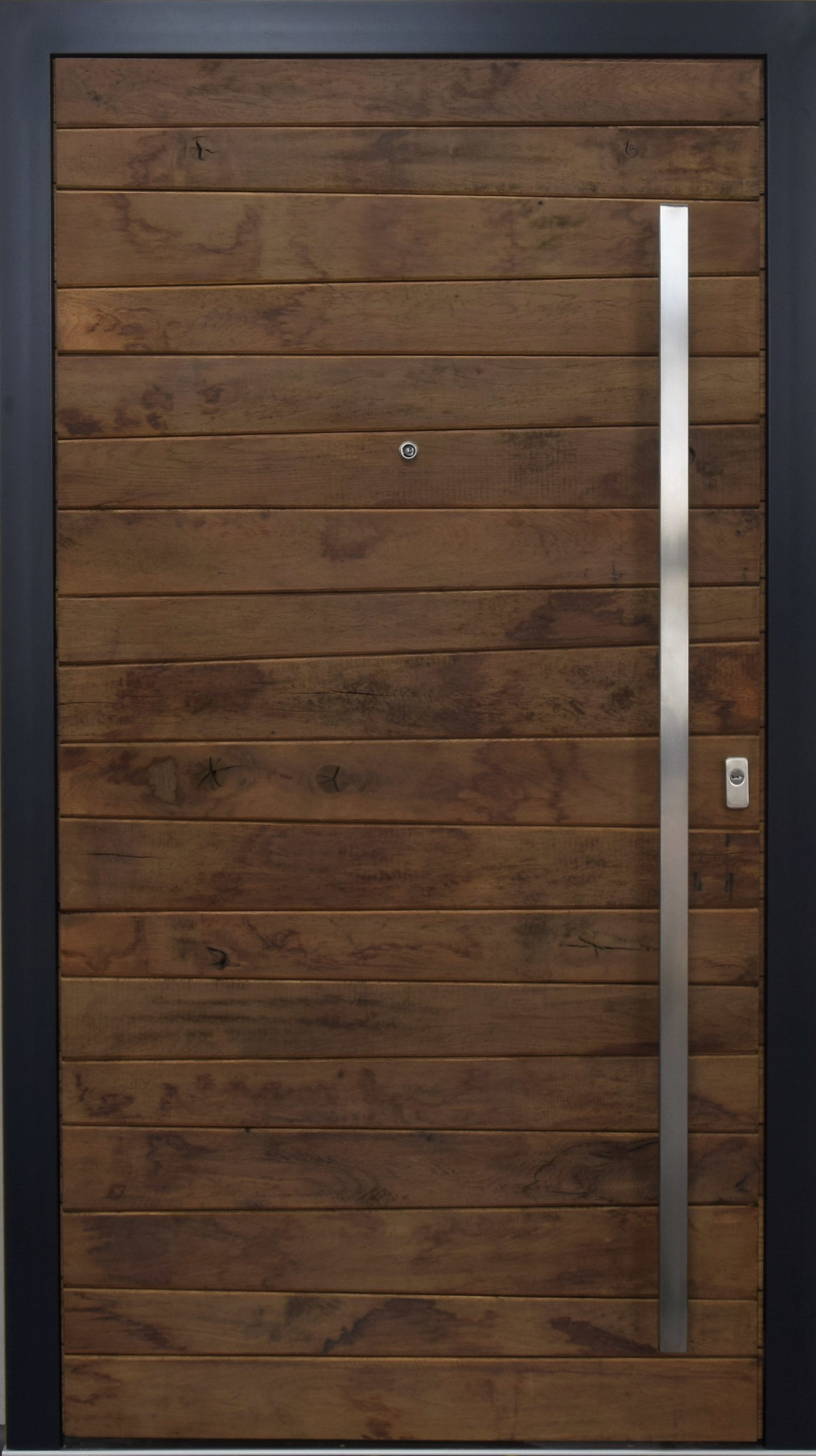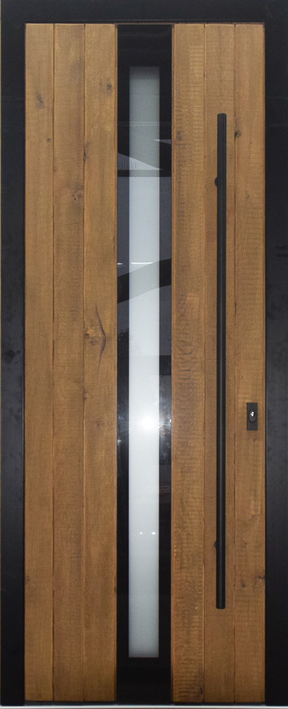 Wir bieten zwei Oberflächen in Shou Sugi Ban Ausführung für die Vorhangschale unserer FENNEN Edition an. Beide basieren auf der Holzart Accoya® . Die Bretter werden für jede bestellte Haustür sorfältig im Werk zusammen gestellt und zu unserem Partner ins holländische Leersum gebracht. Die erfahrenen Brennmeister vor Ort lassen dann nach jahrhundertealter japanischer Tradition die wunderschönen schwarzen Oberflächen entstehen. Der Prozess entwickelt zudem natürliche Resistenzen gegen Schimmel, Feuchtigkeit und Verwitterung. Oberfläche NAKATADO: Die Bretter werden eingebrannt und gebürstet, der natürliche Verlauf der Holzstrukturen wird dadurch dreidimensional mit Höhenunterschieden bis zu 2 mm im Verlauf. Die Behandlung der Oberfläche erfolgt mit Bito Black Holzöl. So wird der Effekt zusätzlich verstärkt. Die finale Oberfläche ist extrem wetterfest und färbt nicht ab. Die Nachbehandlung mit Bito Black ist problemlos möglich. Ebenso die Reinigung mit einem weichen Tuch und Wasser. Oberfläche MARUGAME: Bei dieser Variante entsteht durch den Brennvorgang ein charakteristisches eher gleichmäßiges Muster der Kohleschicht mit leichtem Glanz. Diese Schicht ist sehr hart und hat sich im Außeneinsatz bereits als langjährige Fassadenverkleidung bewährt. Sie wird zusätzlich nach dem Brennvorgang mit einem Epoxyd-Harz veredelt. Die Oberfläche wird dadurch noch härter, unempfindlicher gegen Stöße, das Abfärben der Kohle wird verhindert. Marugame kann nicht nachbehandelt werden. Die Reinigung erfolgt einfach mit Wasser und weicher Bürste. Auf beide Oberflächen erhalten Sie unsere reguläre Gewährleistung. Die sehr spezielle Konstruktion dieser Tür ermöglicht es, die komplette Vorhangschale mit wenigen Handgriffen auszuwechseln. Das trifft auf alle Modelle der Edition FENNEN ohne Glasausschnitt zu. Darüber hinaus ist es sogar möglich, einzelne Bohlen auszutauschen, sollten diese beispielsweise mechanisch beschädigt werden. Dieses hohe Maß an Flexibilität ist ein besonderer Vorzug, den Sie