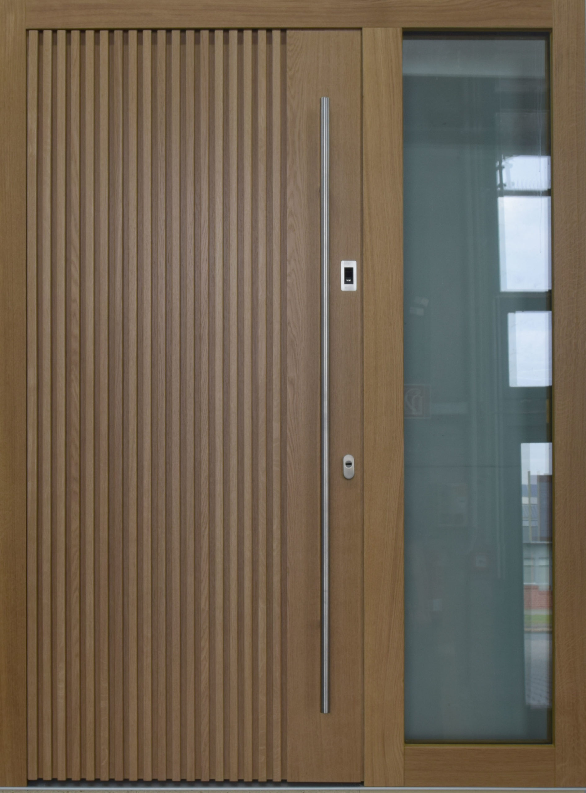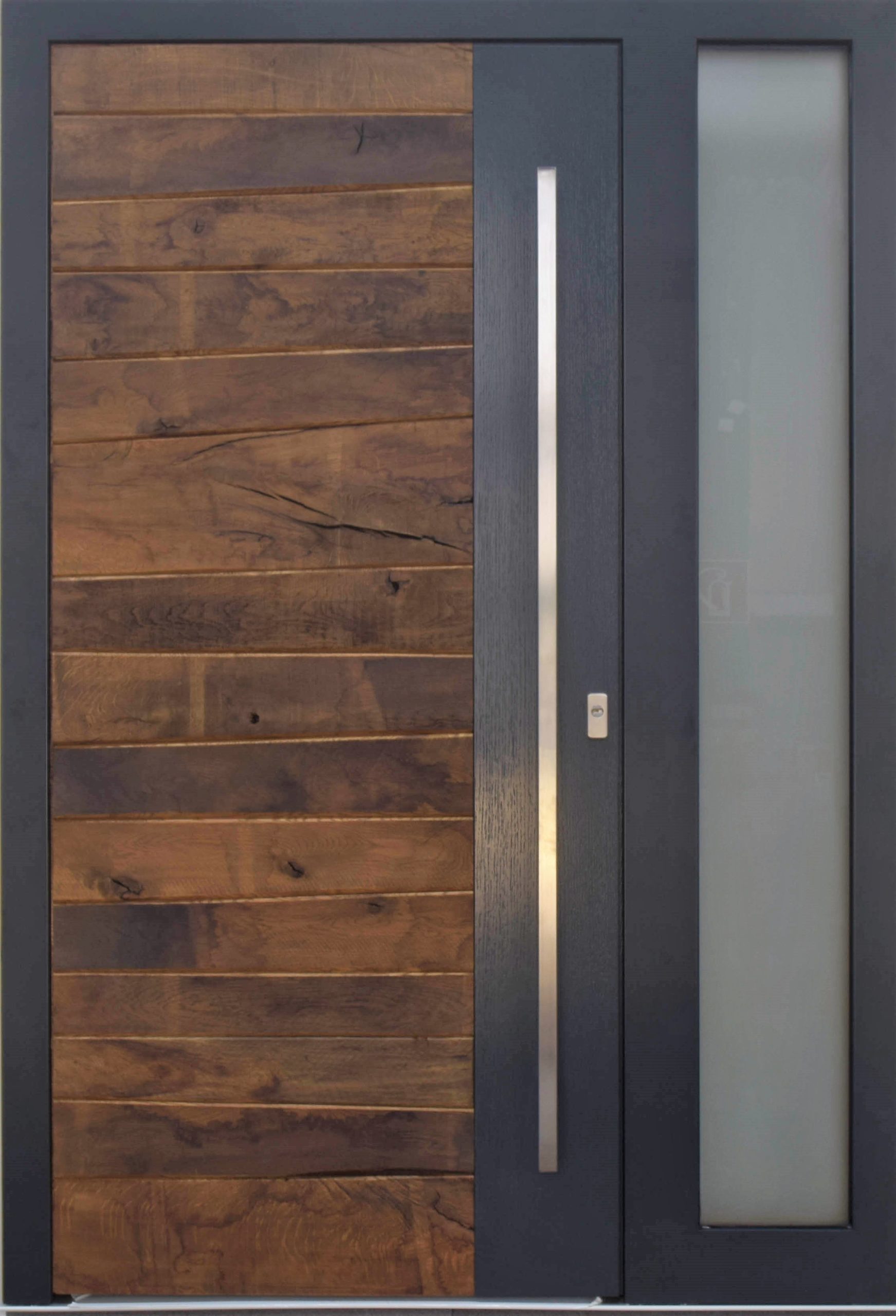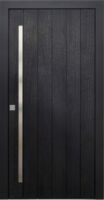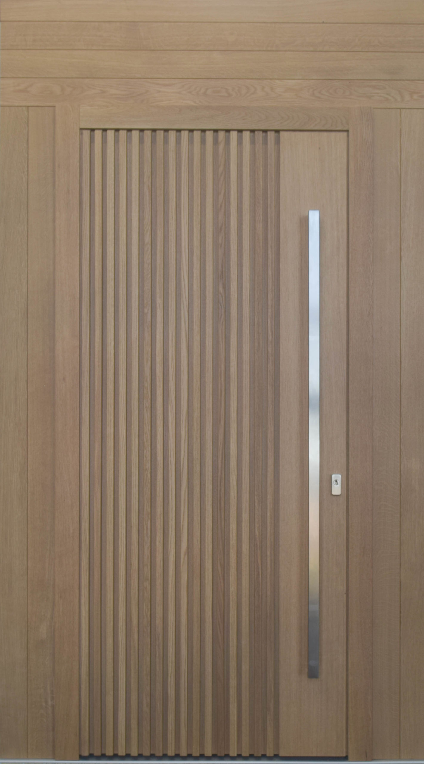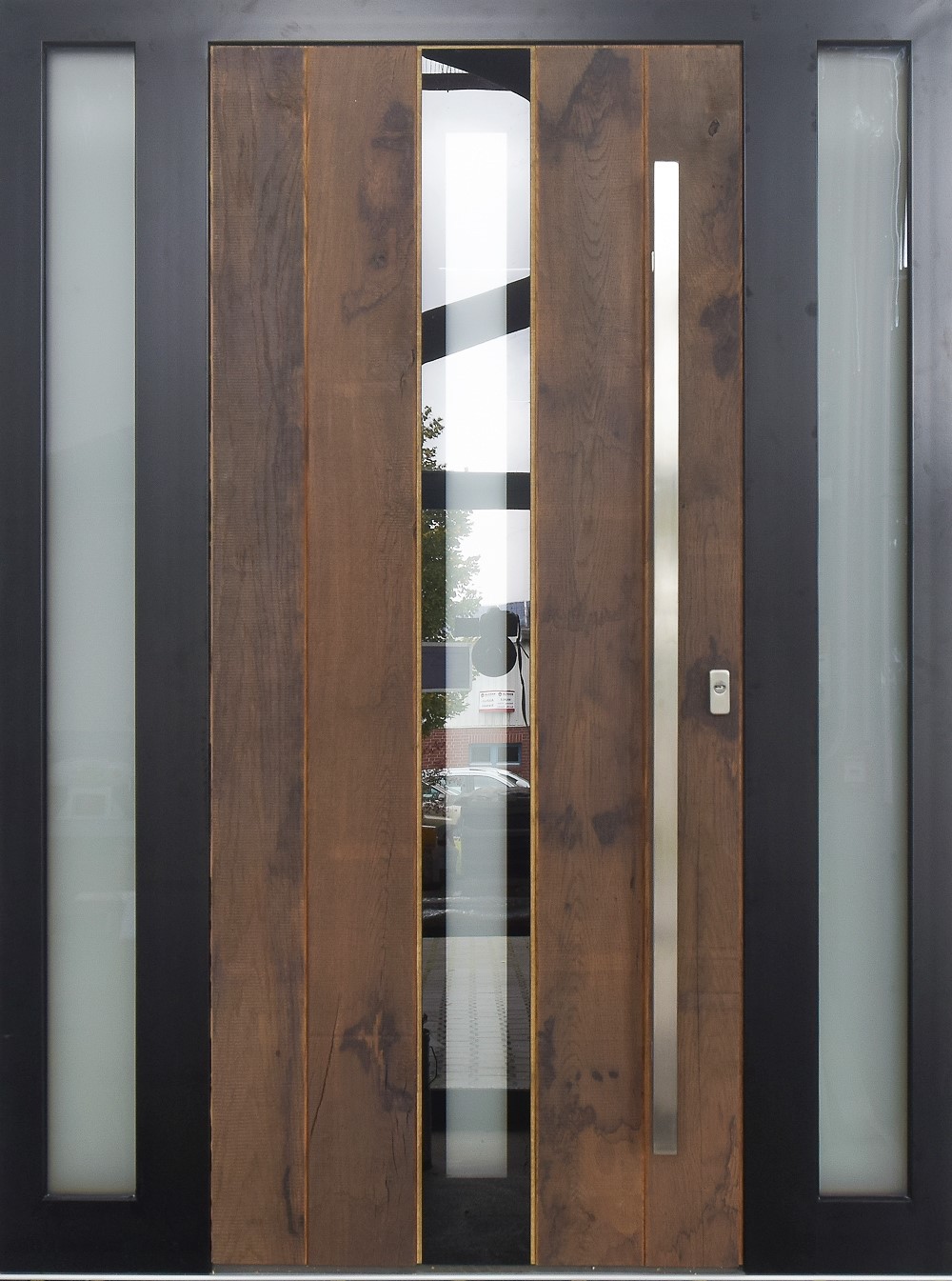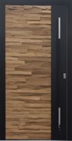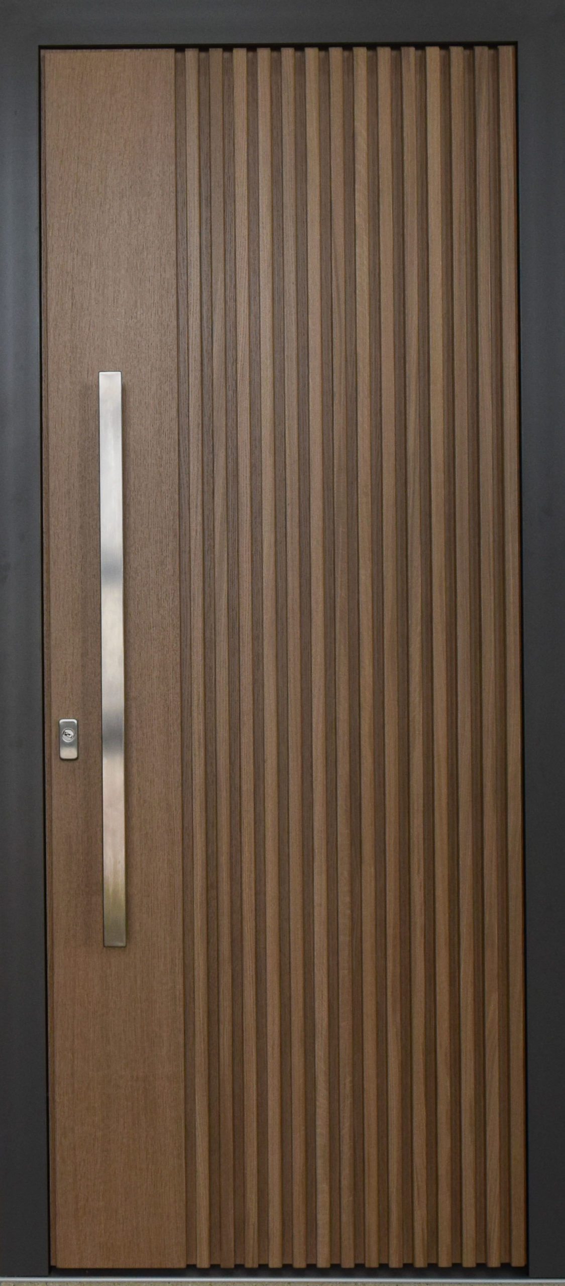 Wir bieten zwei Oberflächen in Shou Sugi Ban Ausführung für die Vorhangschale unserer FENNEN Edition an. Beide basieren auf der Holzart Accoya® . Die Bretter werden für jede bestellte Haustür sorfältig im Werk zusammen gestellt und zu unserem Partner ins holländische Leersum gebracht. Die erfahrenen Brennmeister vor Ort lassen dann nach jahrhundertealter japanischer Tradition die wunderschönen schwarzen Oberflächen entstehen. Der Prozess entwickelt zudem natürliche Resistenzen gegen Schimmel, Feuchtigkeit und Verwitterung. Oberfläche NAKATADO: Die Bretter werden eingebrannt und gebürstet, der natürliche Verlauf der Holzstrukturen wird dadurch dreidimensional mit Höhenunterschieden bis zu 2 mm im Verlauf. Die Behandlung der Oberfläche erfolgt mit Bito Black Holzöl. So wird der Effekt zusätzlich verstärkt. Die finale Oberfläche ist extrem wetterfest und färbt nicht ab. Die Nachbehandlung mit Bito Black ist problemlos möglich. Ebenso die Reinigung mit einem weichen Tuch und Wasser. Oberfläche MARUGAME: Bei dieser Variante entsteht durch den Brennvorgang ein charakteristisches eher gleichmäßiges Muster der Kohleschicht mit leichtem Glanz. Diese Schicht ist sehr hart und hat sich im Außeneinsatz bereits als langjährige Fassadenverkleidung bewährt. Sie wird zusätzlich nach dem Brennvorgang mit einem Epoxyd-Harz veredelt. Die Oberfläche wird dadurch noch härter, unempfindlicher gegen Stöße, das Abfärben der Kohle wird verhindert. Marugame kann nicht nachbehandelt werden. Die Reinigung erfolgt einfach mit Wasser und weicher Bürste. Auf beide Oberflächen erhalten Sie unsere reguläre Gewährleistung. Die sehr spezielle Konstruktion dieser Tür ermöglicht es, die komplette Vorhangschale mit wenigen Handgriffen auszuwechseln. Das trifft auf alle Modelle der Edition FENNEN ohne Glasausschnitt zu. Darüber hinaus ist es sogar möglich, einzelne Bohlen auszutauschen, sollten diese beispielsweise mechanisch beschädigt werden. Dieses hohe Maß an Flexibilität ist ein besonderer Vorzug, den Sie