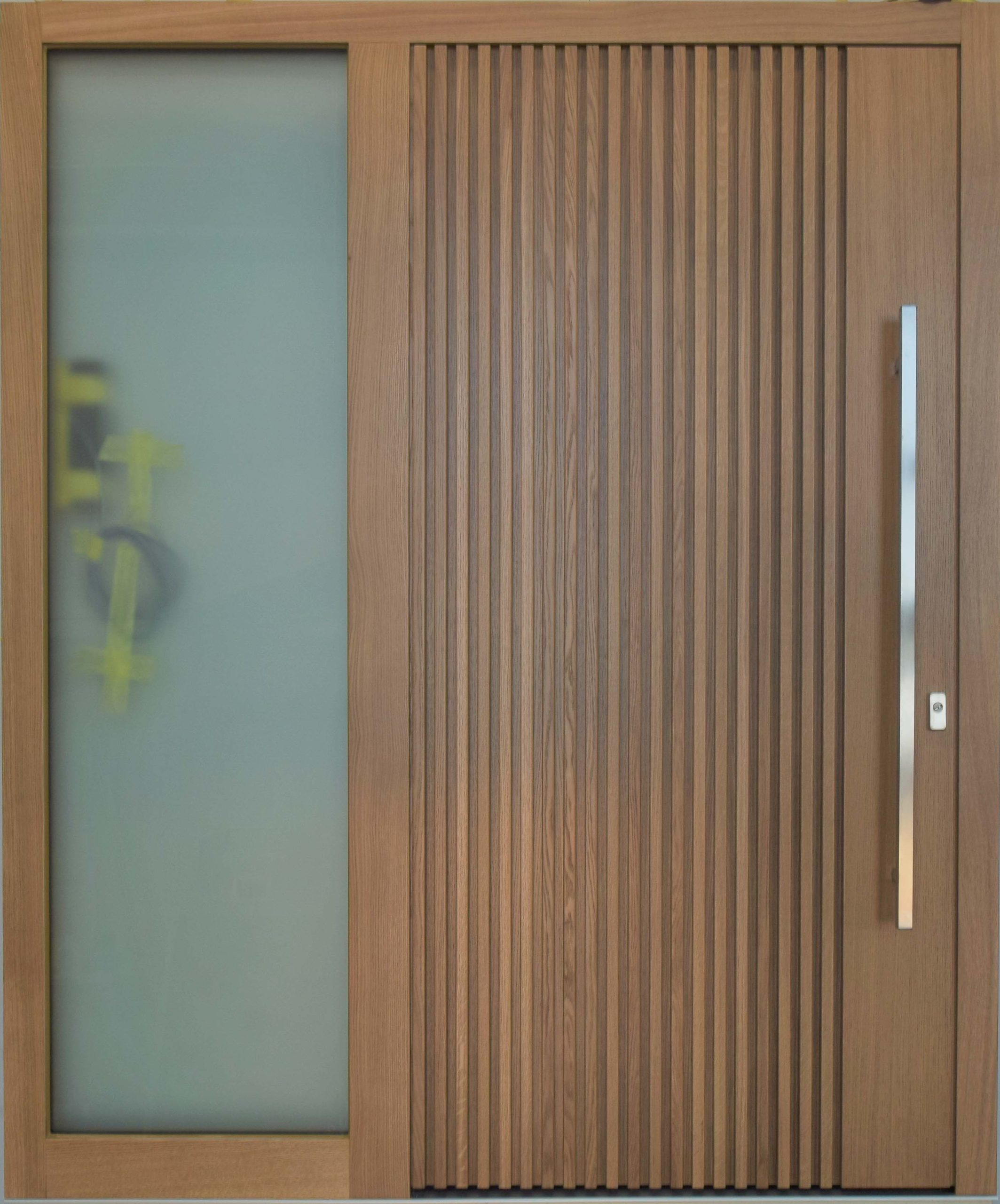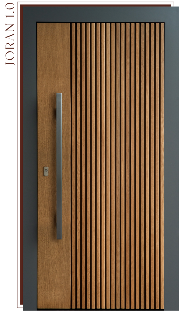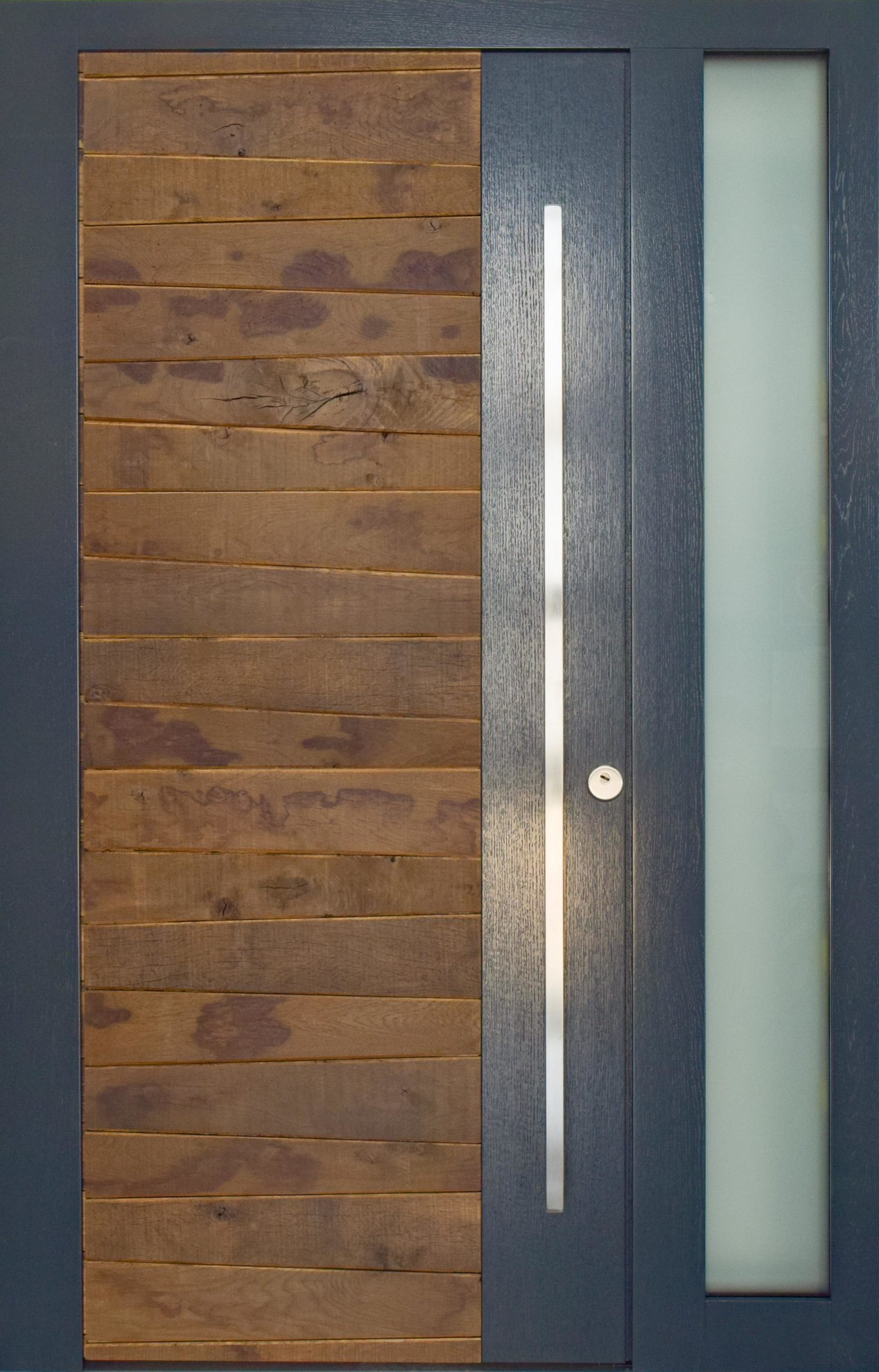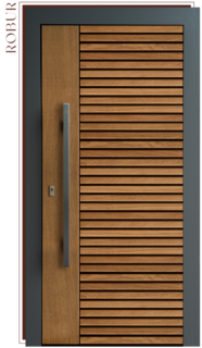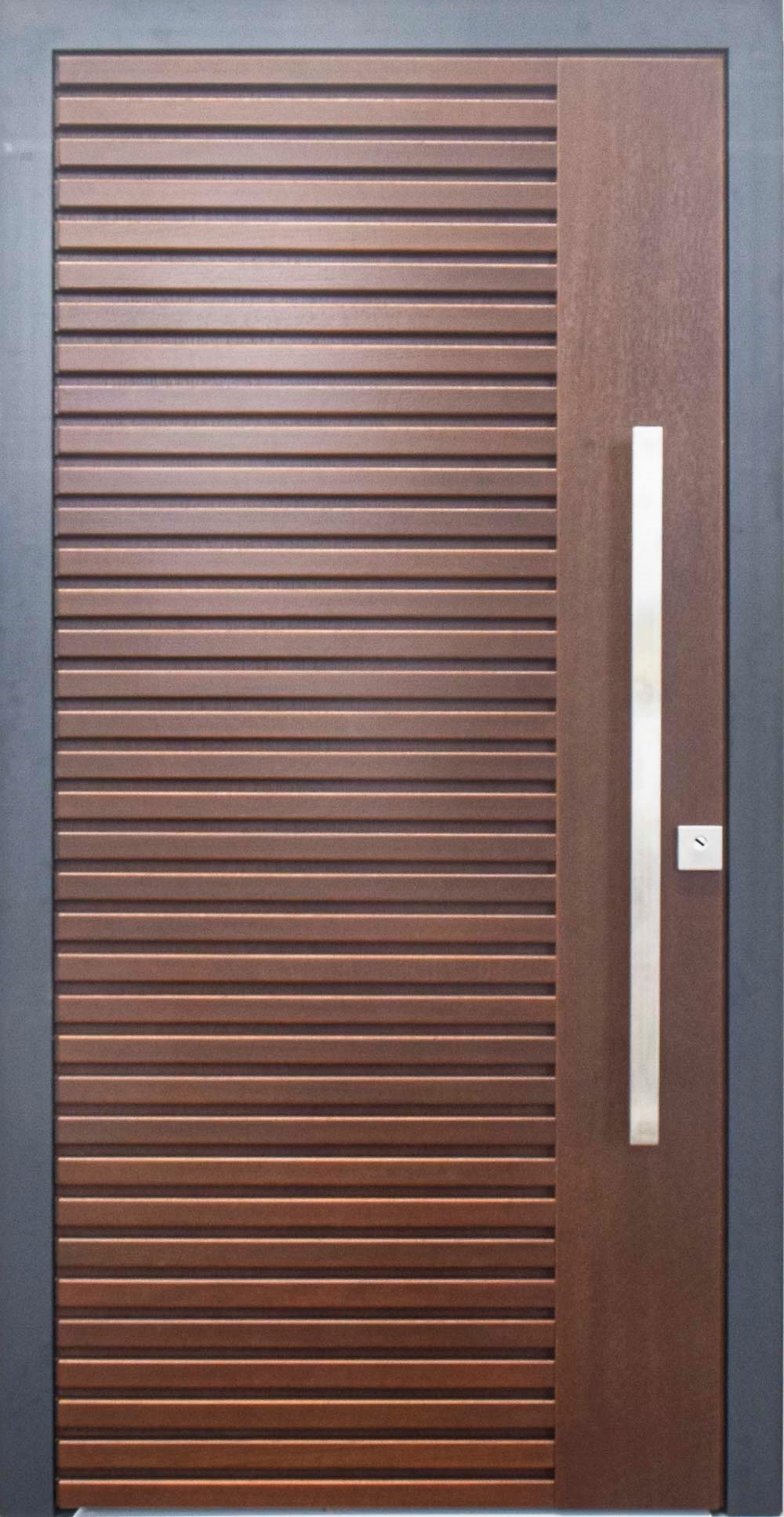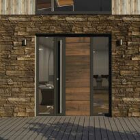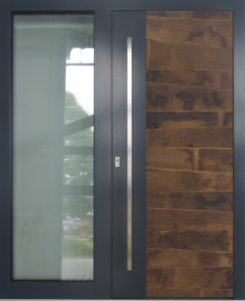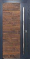 Wir bieten zwei Oberflächen in Shou Sugi Ban Ausführung für die Vorhangschale unserer FENNEN Edition an. Beide basieren auf der Holzart Accoya® . Die Bretter werden für jede bestellte Haustür sorfältig im Werk zusammen gestellt und zu unserem Partner ins holländische Leersum gebracht. Die erfahrenen Brennmeister vor Ort lassen dann nach jahrhundertealter japanischer Tradition die wunderschönen schwarzen Oberflächen entstehen. Der Prozess entwickelt zudem natürliche Resistenzen gegen Schimmel, Feuchtigkeit und Verwitterung. Oberfläche NAKATADO: Die Bretter werden eingebrannt und gebürstet, der natürliche Verlauf der Holzstrukturen wird dadurch dreidimensional mit Höhenunterschieden bis zu 2 mm im Verlauf. Die Behandlung der Oberfläche erfolgt mit Bito Black Holzöl. So wird der Effekt zusätzlich verstärkt. Die finale Oberfläche ist extrem wetterfest und färbt nicht ab. Die Nachbehandlung mit Bito Black ist problemlos möglich. Ebenso die Reinigung mit einem weichen Tuch und Wasser. Oberfläche MARUGAME: Bei dieser Variante entsteht durch den Brennvorgang ein charakteristisches eher gleichmäßiges Muster der Kohleschicht mit leichtem Glanz. Diese Schicht ist sehr hart und hat sich im Außeneinsatz bereits als langjährige Fassadenverkleidung bewährt. Sie wird zusätzlich nach dem Brennvorgang mit einem Epoxyd-Harz veredelt. Die Oberfläche wird dadurch noch härter, unempfindlicher gegen Stöße, das Abfärben der Kohle wird verhindert. Marugame kann nicht nachbehandelt werden. Die Reinigung erfolgt einfach mit Wasser und weicher Bürste. Auf beide Oberflächen erhalten Sie unsere reguläre Gewährleistung. Die sehr spezielle Konstruktion dieser Tür ermöglicht es, die komplette Vorhangschale mit wenigen Handgriffen auszuwechseln. Das trifft auf alle Modelle der Edition FENNEN ohne Glasausschnitt zu. Darüber hinaus ist es sogar möglich, einzelne Bohlen auszutauschen, sollten diese beispielsweise mechanisch beschädigt werden. Dieses hohe Maß an Flexibilität ist ein besonderer Vorzug, den Sie