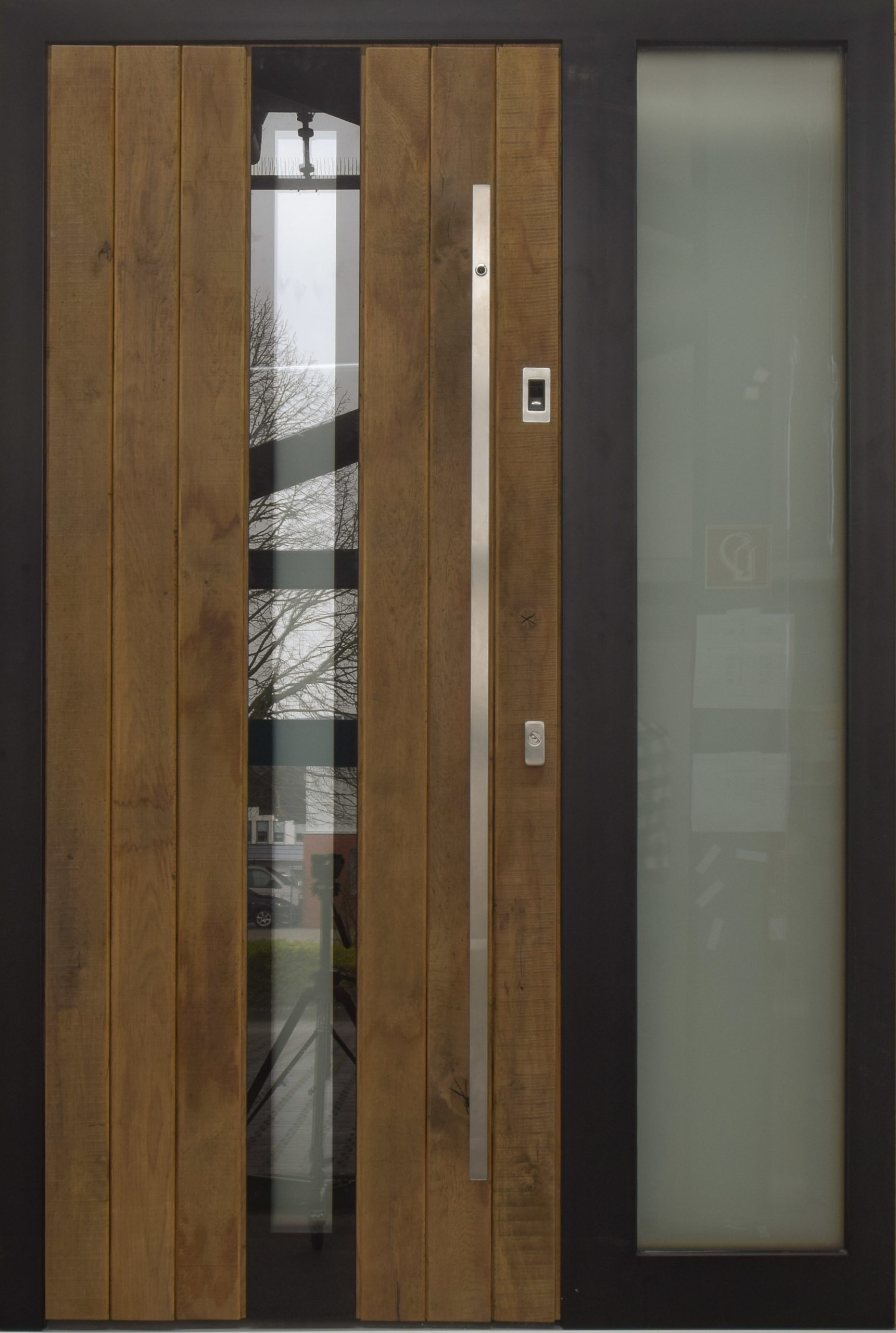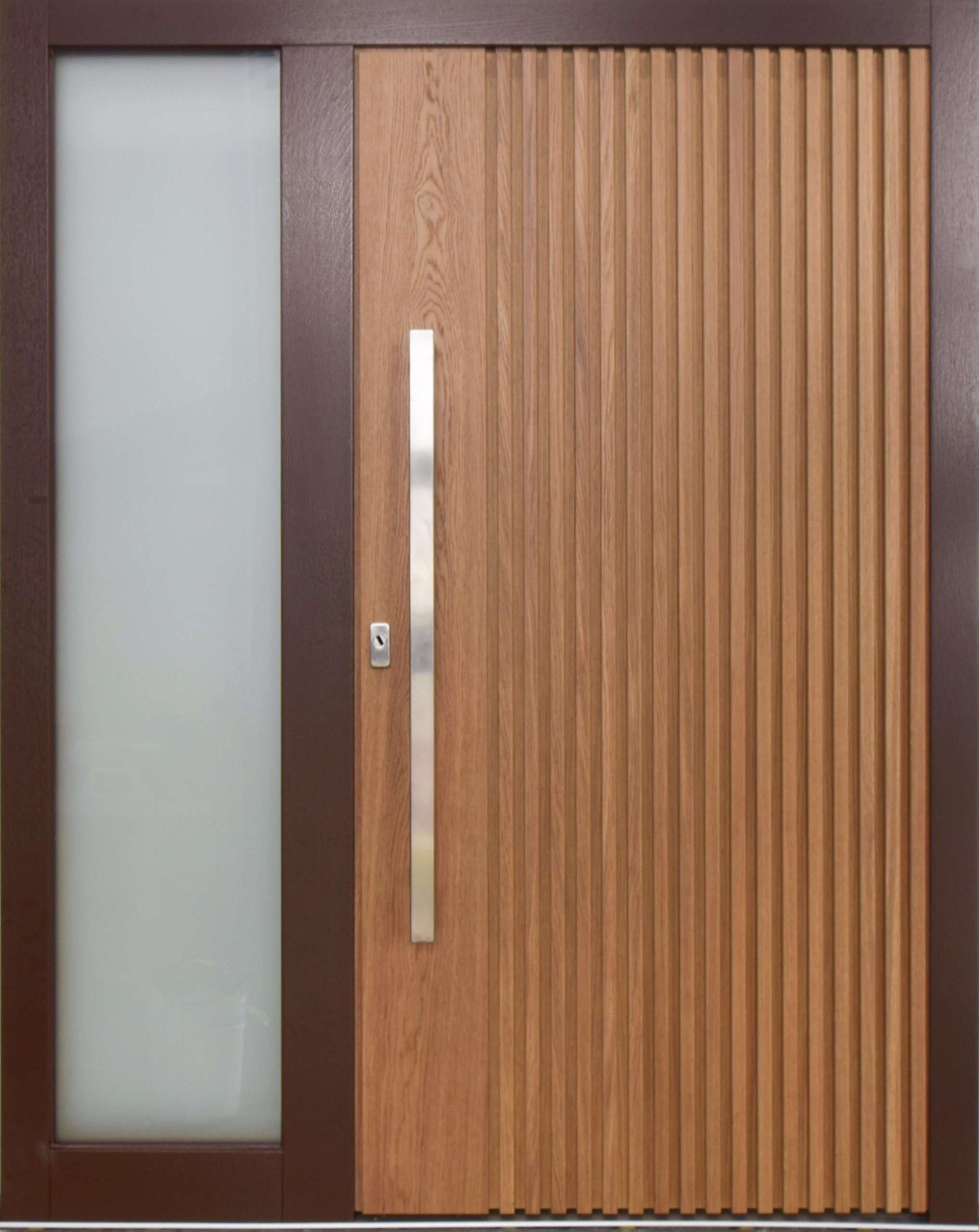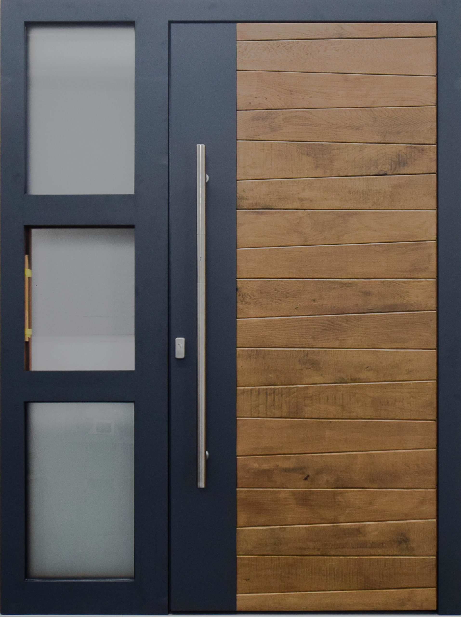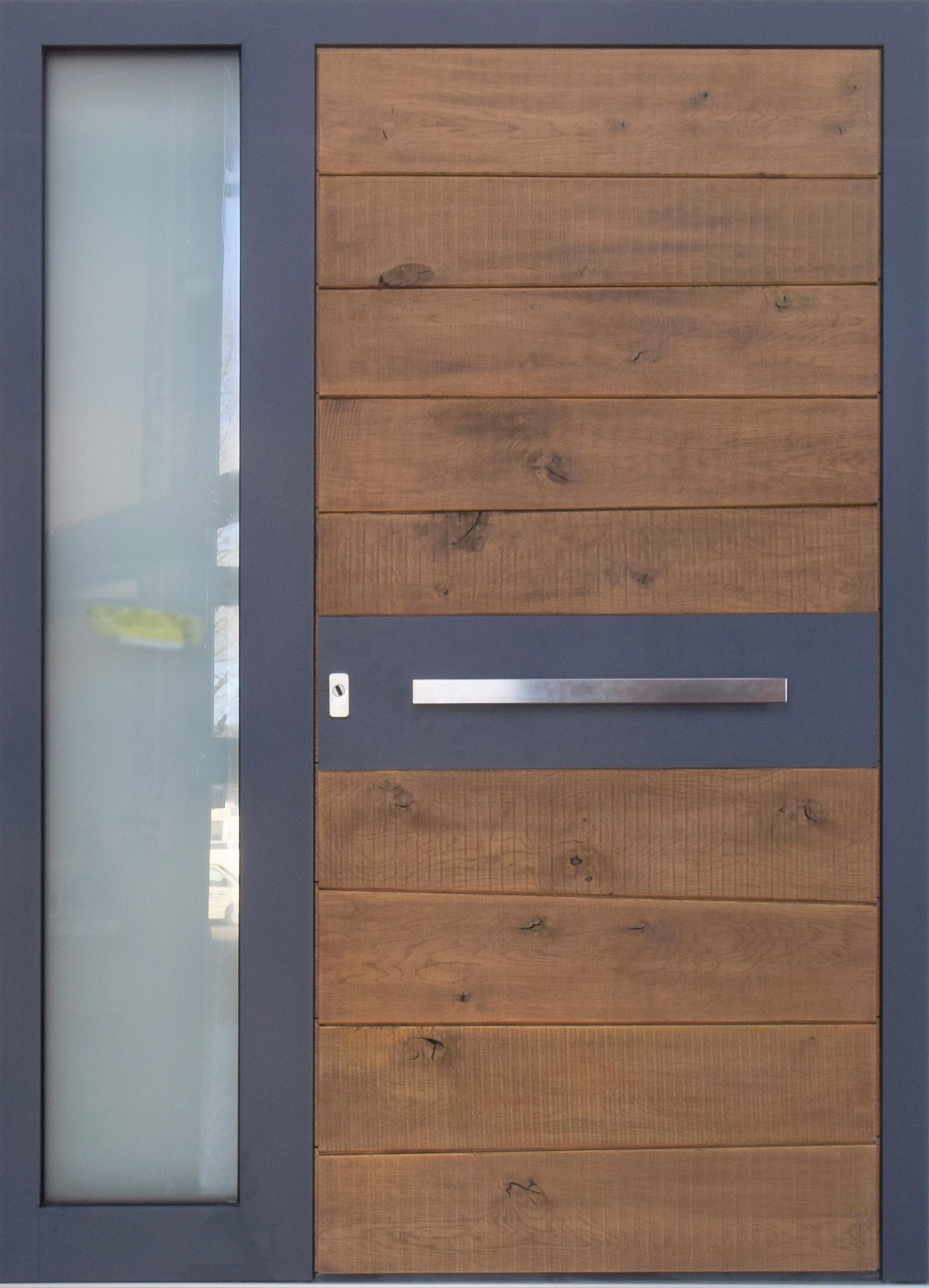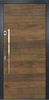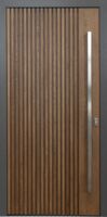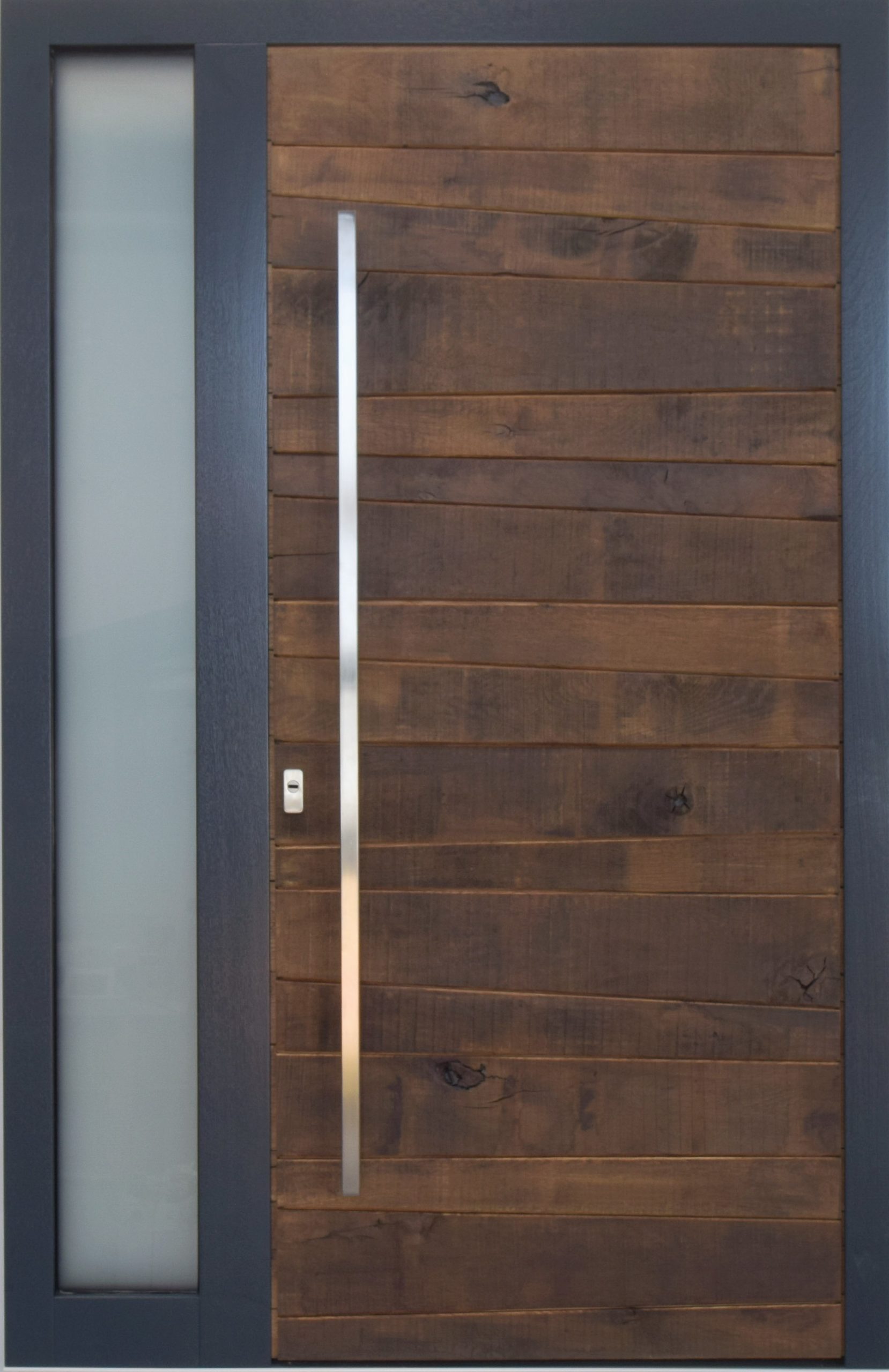 Wir bieten zwei Oberflächen in Shou Sugi Ban Ausführung für die Vorhangschale unserer FENNEN Edition an. Beide basieren auf der Holzart Accoya® . Die Bretter werden für jede bestellte Haustür sorfältig im Werk zusammen gestellt und zu unserem Partner ins holländische Leersum gebracht. Die erfahrenen Brennmeister vor Ort lassen dann nach jahrhundertealter japanischer Tradition die wunderschönen schwarzen Oberflächen entstehen. Der Prozess entwickelt zudem natürliche Resistenzen gegen Schimmel, Feuchtigkeit und Verwitterung. Oberfläche NAKATADO: Die Bretter werden eingebrannt und gebürstet, der natürliche Verlauf der Holzstrukturen wird dadurch dreidimensional mit Höhenunterschieden bis zu 2 mm im Verlauf. Die Behandlung der Oberfläche erfolgt mit Bito Black Holzöl. So wird der Effekt zusätzlich verstärkt. Die finale Oberfläche ist extrem wetterfest und färbt nicht ab. Die Nachbehandlung mit Bito Black ist problemlos möglich. Ebenso die Reinigung mit einem weichen Tuch und Wasser. Oberfläche MARUGAME: Bei dieser Variante entsteht durch den Brennvorgang ein charakteristisches eher gleichmäßiges Muster der Kohleschicht mit leichtem Glanz. Diese Schicht ist sehr hart und hat sich im Außeneinsatz bereits als langjährige Fassadenverkleidung bewährt. Sie wird zusätzlich nach dem Brennvorgang mit einem Epoxyd-Harz veredelt. Die Oberfläche wird dadurch noch härter, unempfindlicher gegen Stöße, das Abfärben der Kohle wird verhindert. Marugame kann nicht nachbehandelt werden. Die Reinigung erfolgt einfach mit Wasser und weicher Bürste. Auf beide Oberflächen erhalten Sie unsere reguläre Gewährleistung. Die sehr spezielle Konstruktion dieser Tür ermöglicht es, die komplette Vorhangschale mit wenigen Handgriffen auszuwechseln. Das trifft auf alle Modelle der Edition FENNEN ohne Glasausschnitt zu. Darüber hinaus ist es sogar möglich, einzelne Bohlen auszutauschen, sollten diese beispielsweise mechanisch beschädigt werden. Dieses hohe Maß an Flexibilität ist ein besonderer Vorzug, den Sie