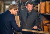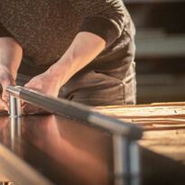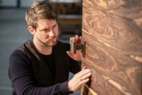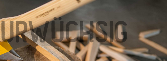 Mit der Axt werden aus den schweren Holzbohlen der Sturmeiche die Puzzleteile für das Türendesign geschlagen. Das Zusammenlegen erfordert viel Fingerspitzengefühl, erst wenn das Gesamtbild perfekt ist, wird Teil für Teil fixiert und die Oberfläche sorgsam veredelt.