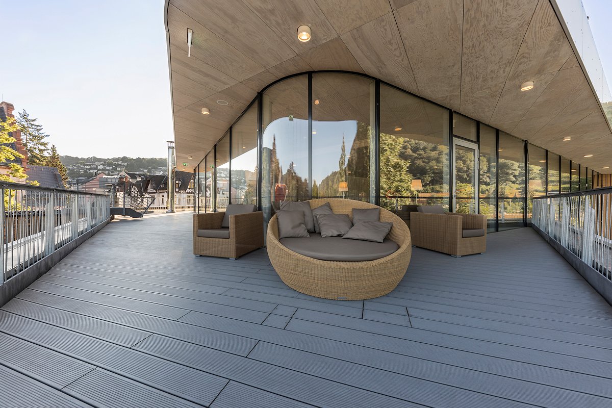 Pausenhöfe und Schwimmbad-Anlagen profitieren von der Wohlfühl-Atmosphäre der RATIONELLEN select. Moderne Terrassendielen zeigen gerade durch ihre souveräne Breite eine Großzügigkeit, die einen spannenden Kontrast zu feingliedriger Gestaltung bilden kann.