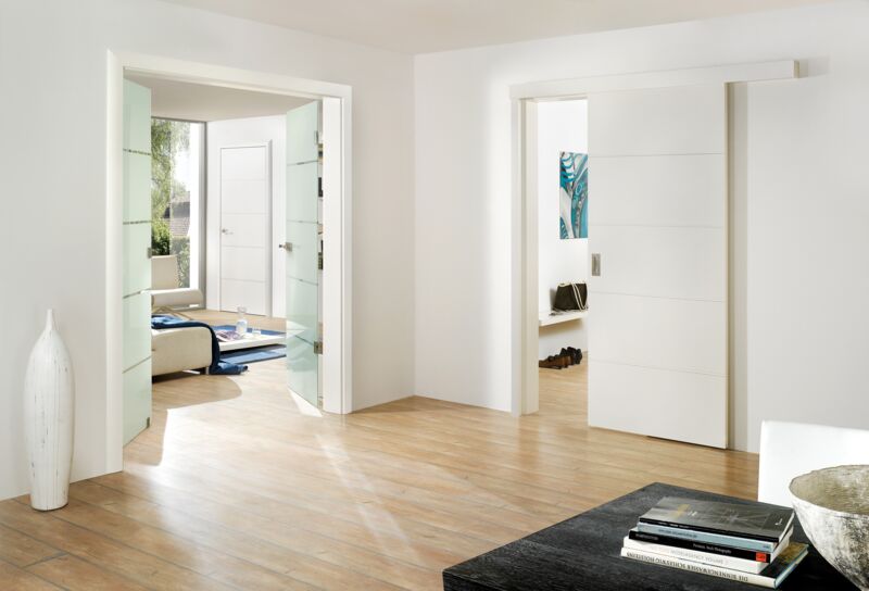 Rechts: Modell Weiß Art | Typ 101, Schiebetür auf Wand | Lack ähnl. RAL 9010 Vorne links: Ganzglastür licht & harmonie | Motiv Atos | 2-flügelig Hinten links: Modell Weiß Art | Typ 101, stumpf | Lack ähnl. RAL 9010